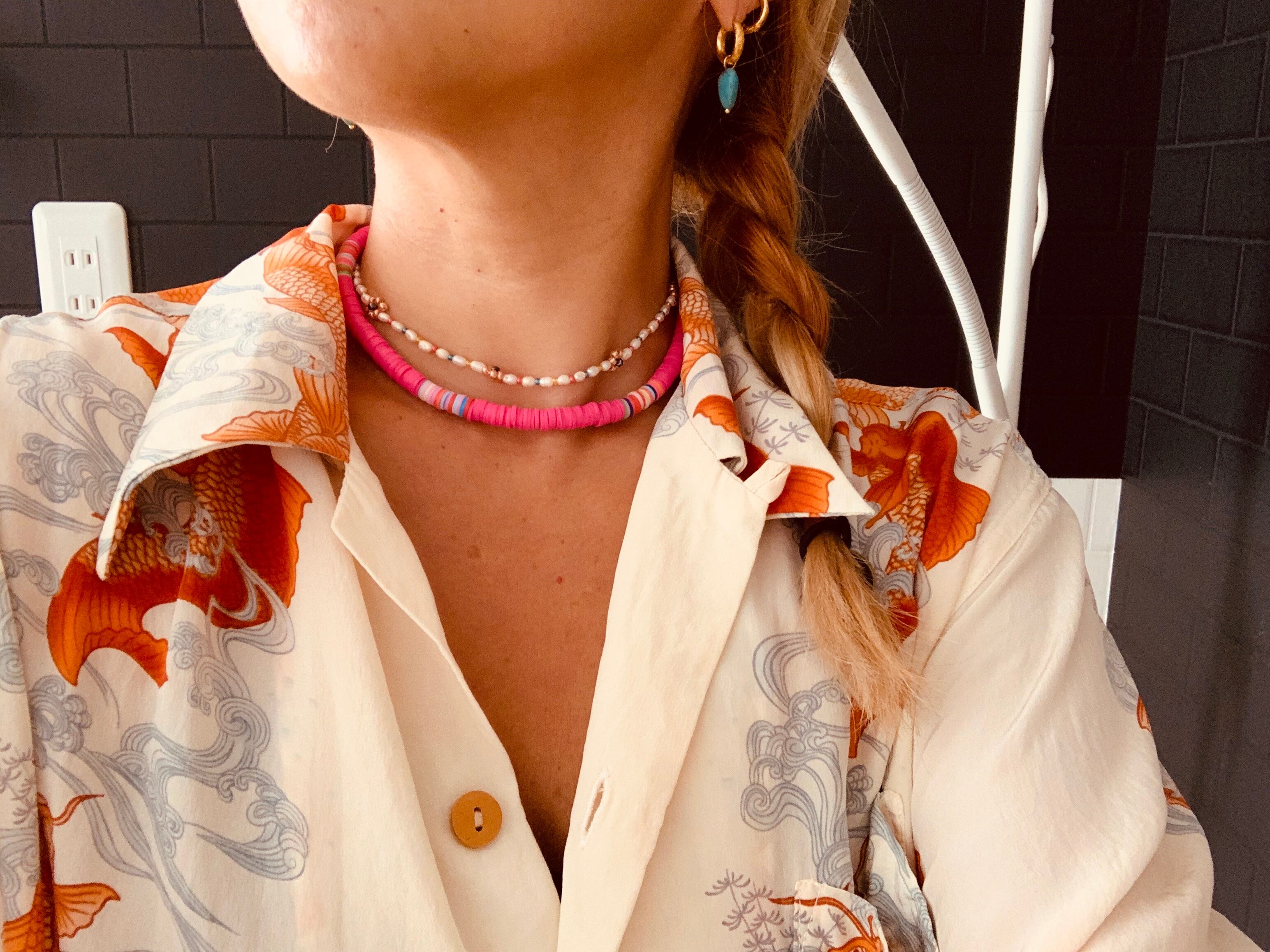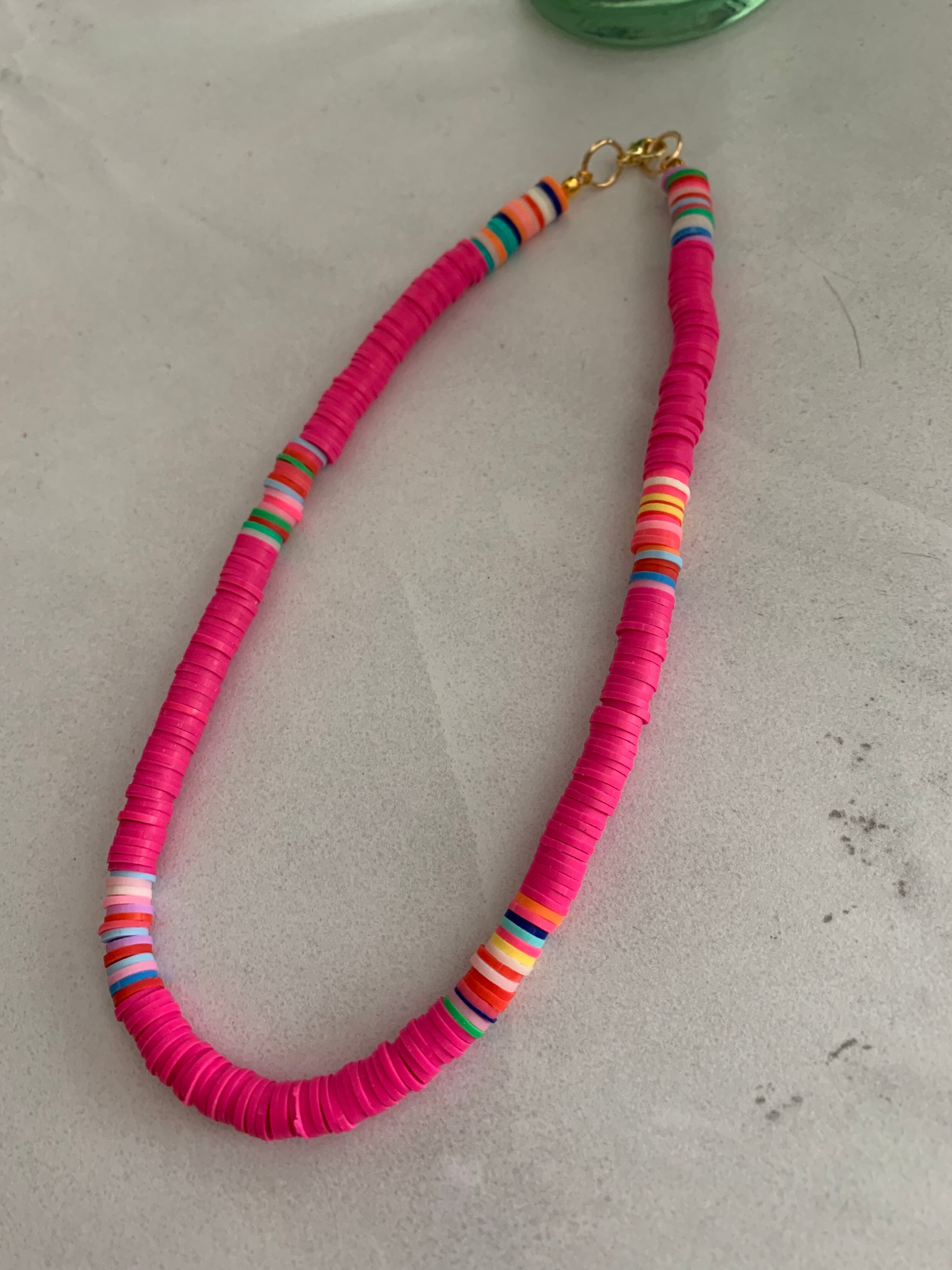 ラウンドフラットヒシビーズを使った、ピンクがメインのネックレス