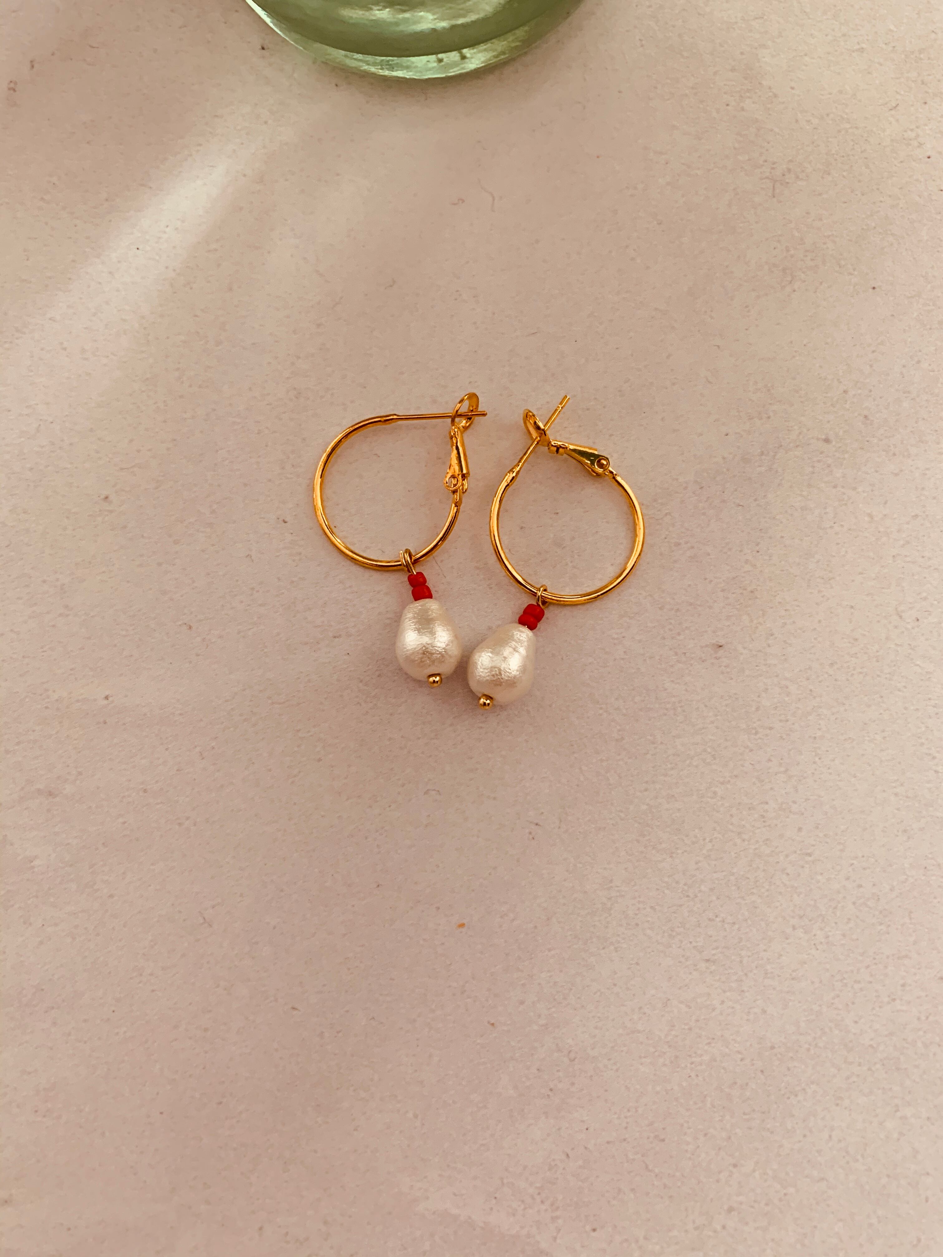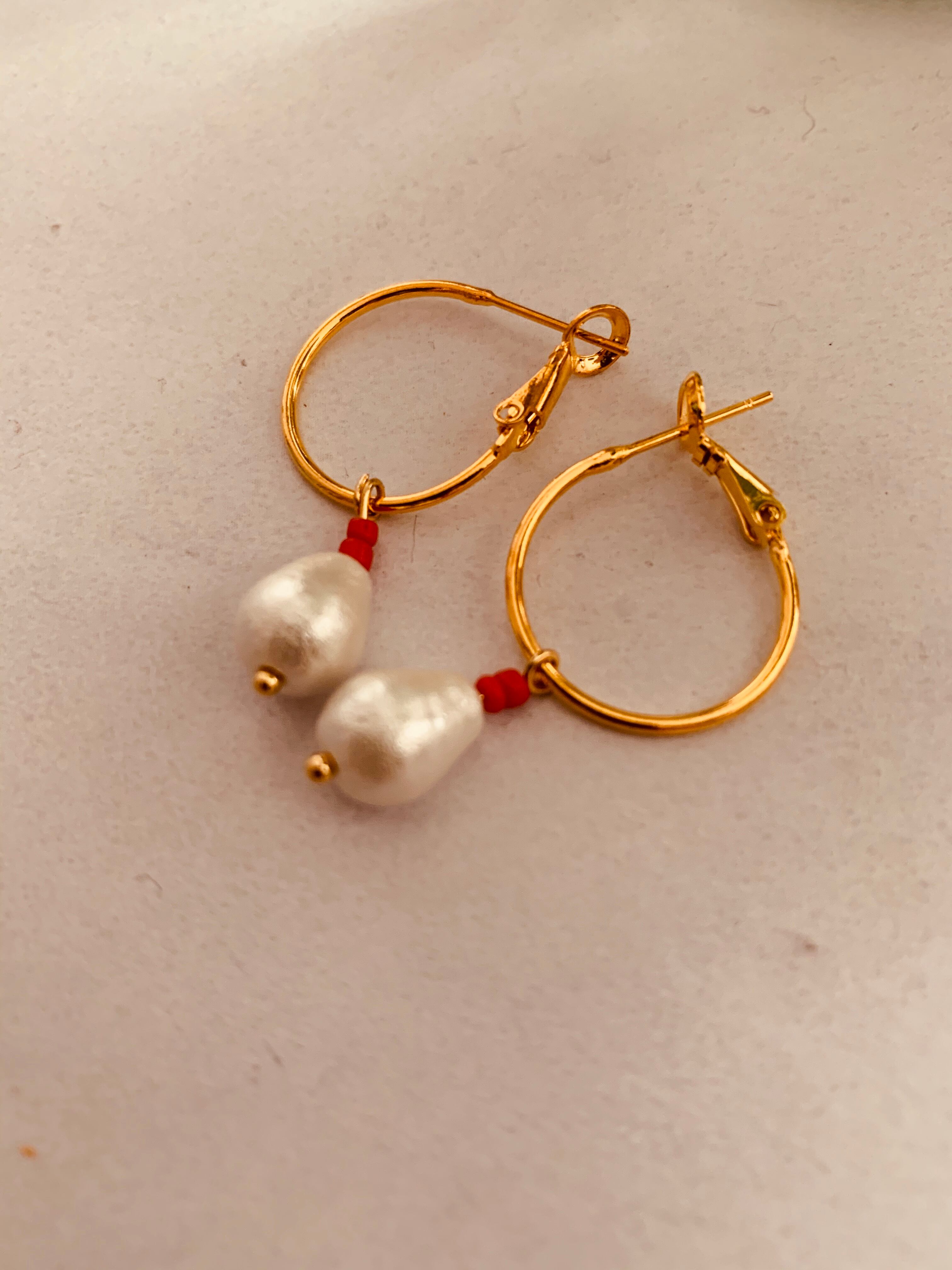 しずく型のパールと赤いビーズのフープピアス