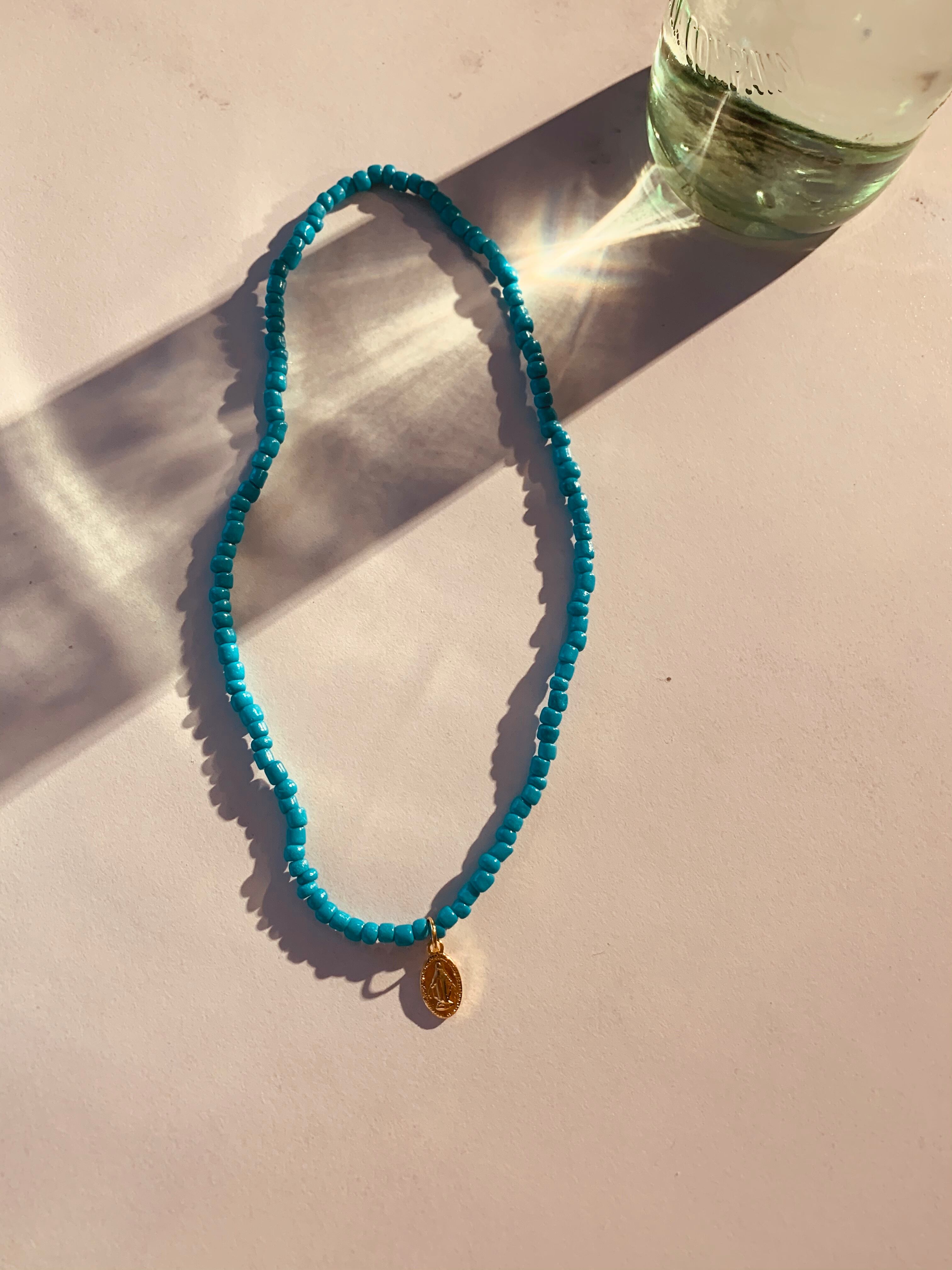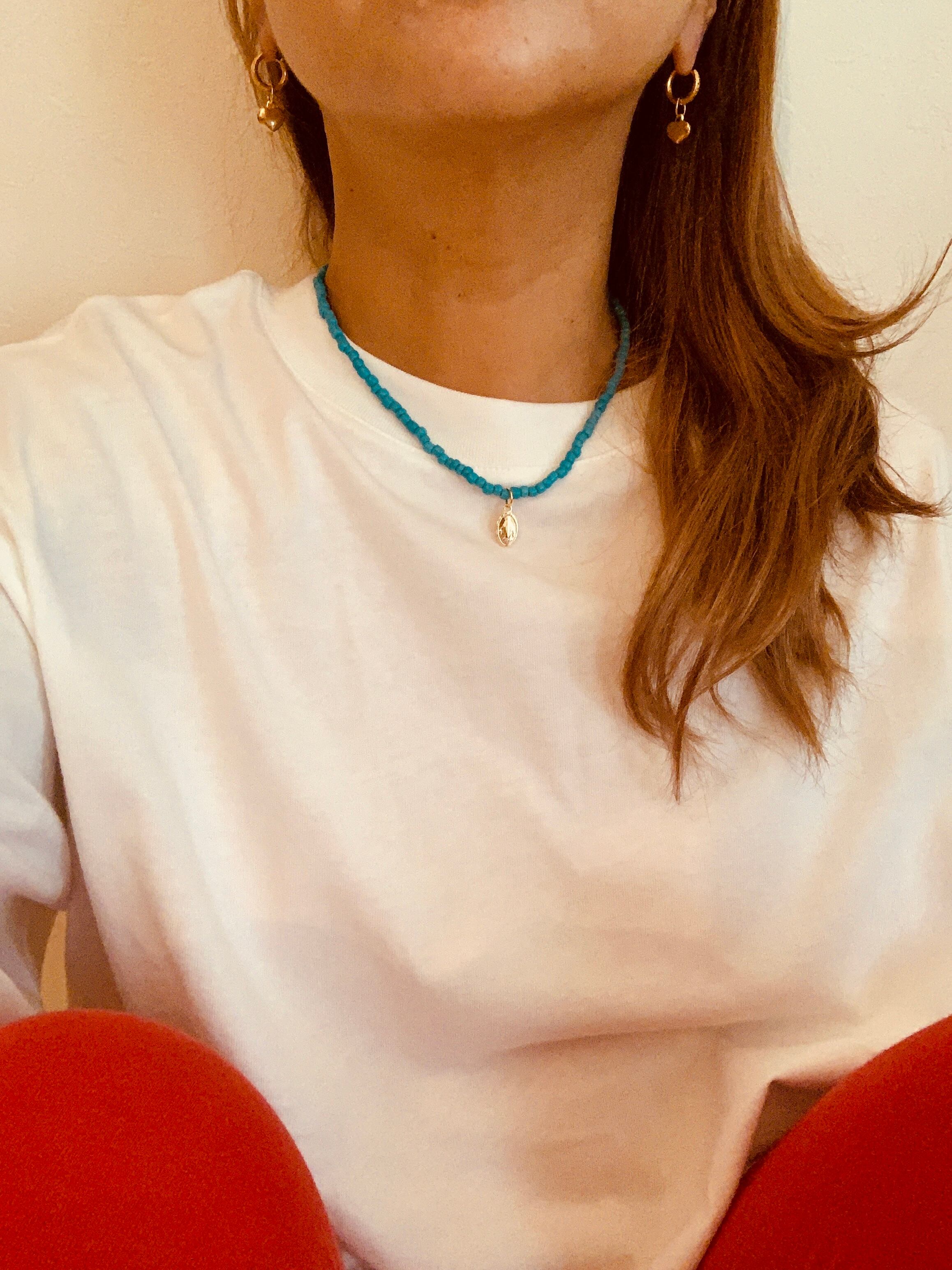 大きめビーズに、ゴールドのマリアがついたネックレスです。マリアはステンレス304を使用しているので色あせせずにアレルギーにも安心な素材です。