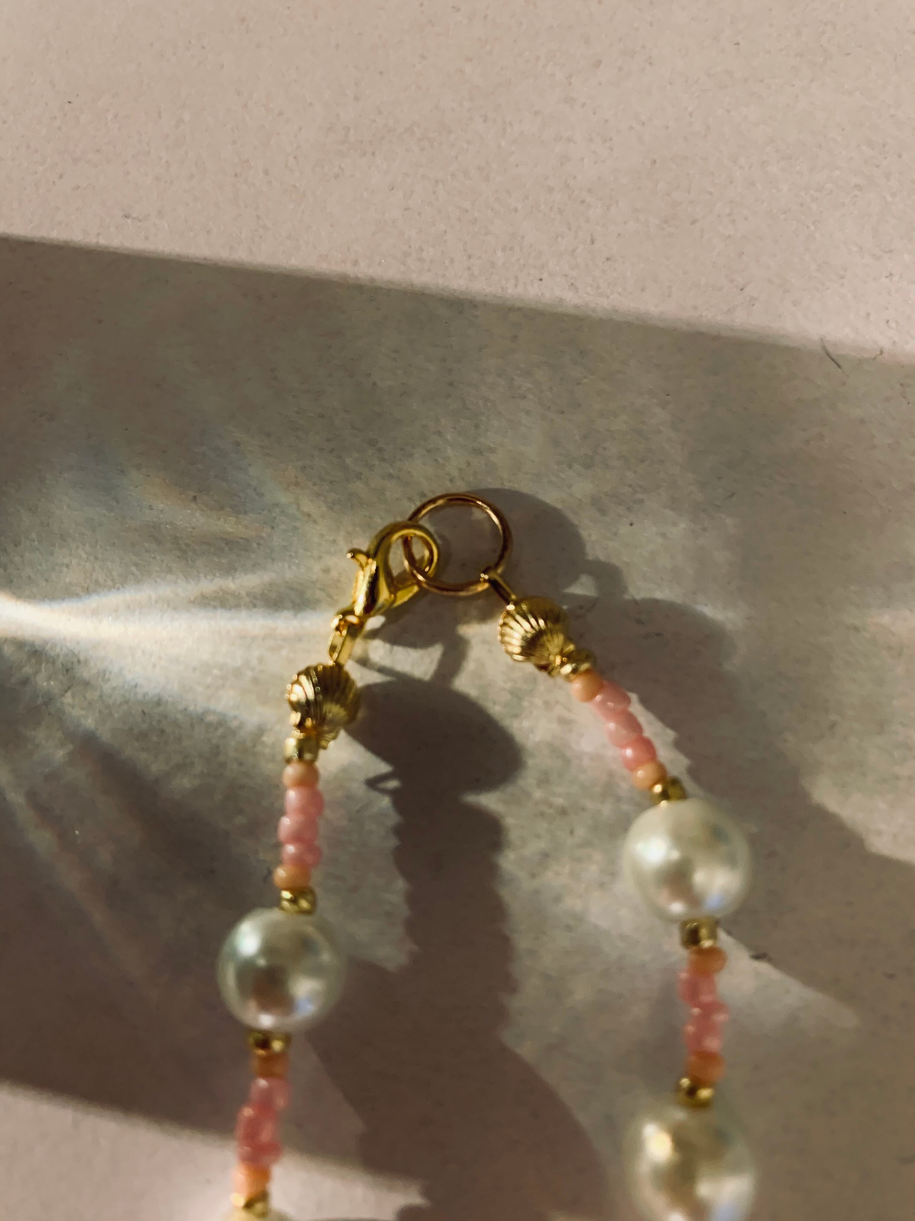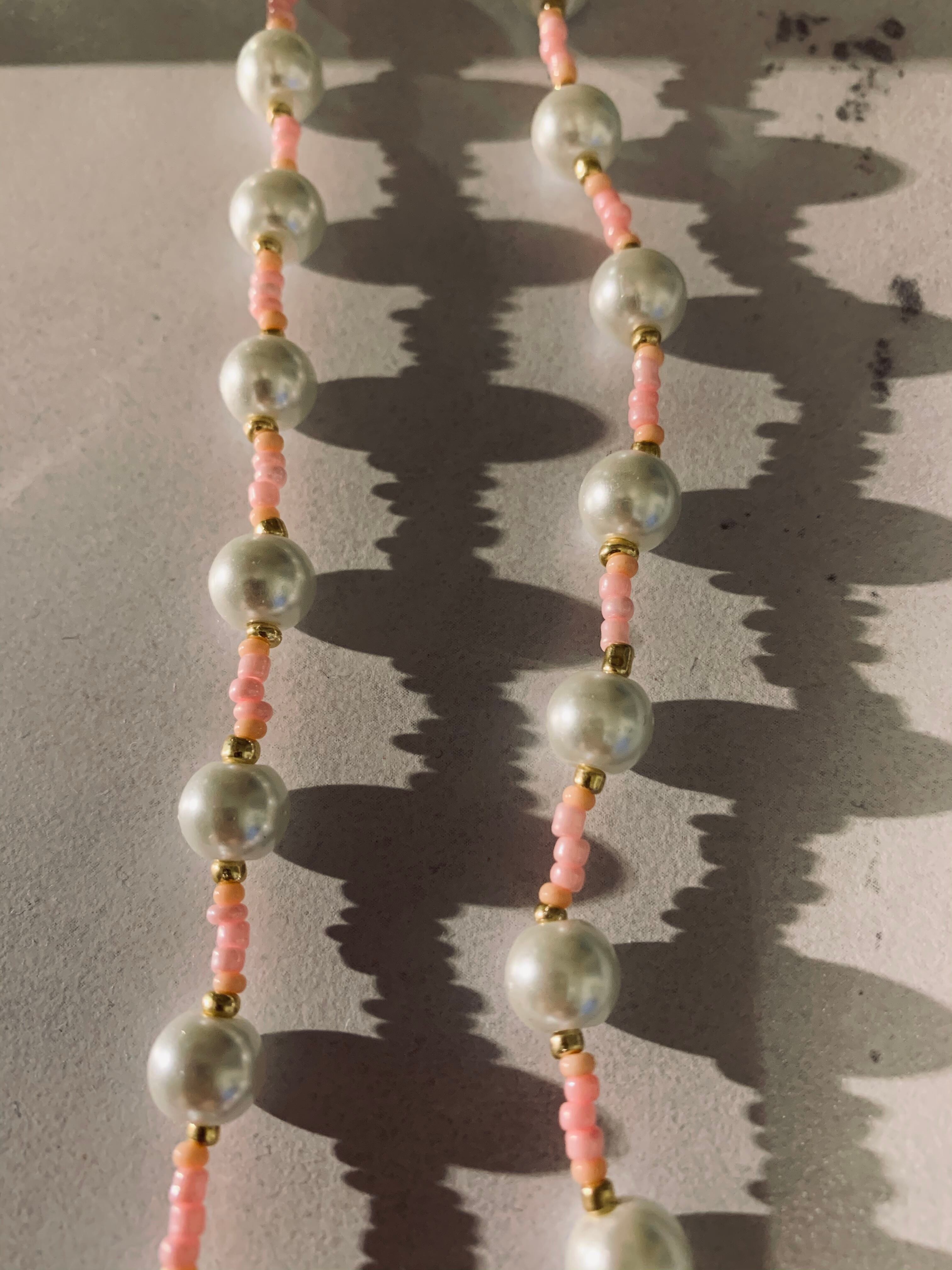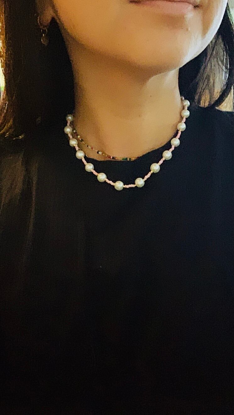 パールとピンク、ゴールドのビーズでできたネックレスです。
