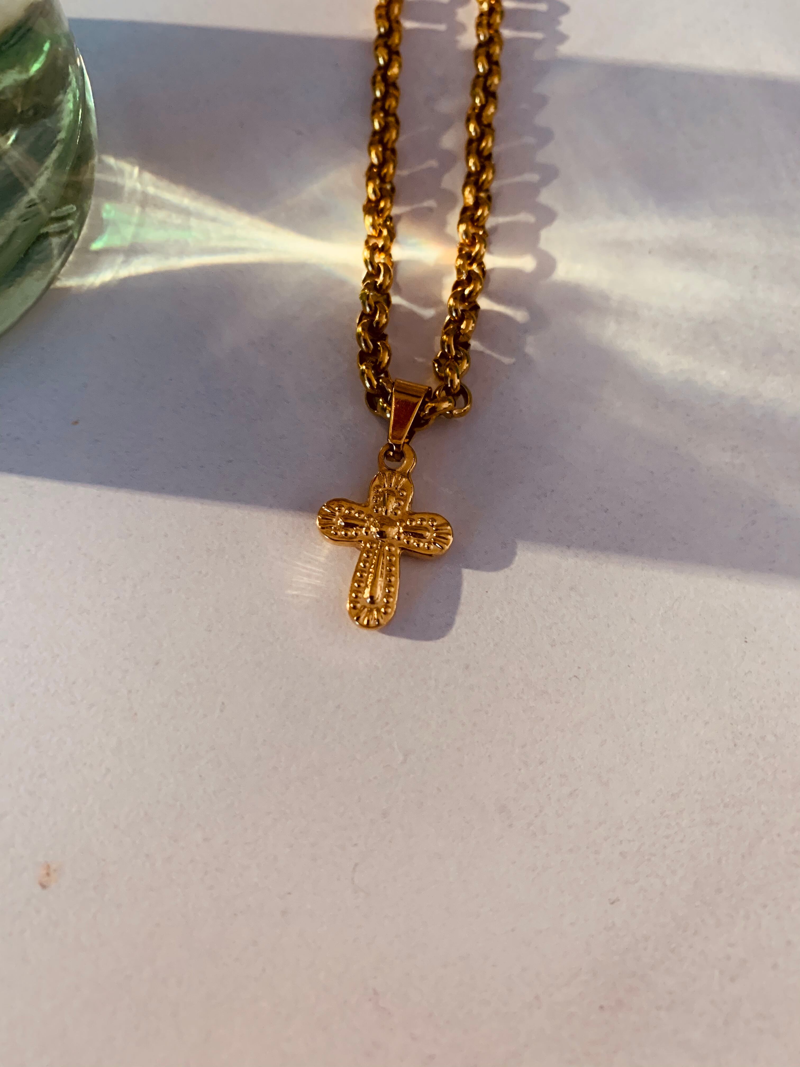 太めチェーンのクロスネックレスです。ステンレスを使用しているので変色せずにアレルギーにも安心な素材です。