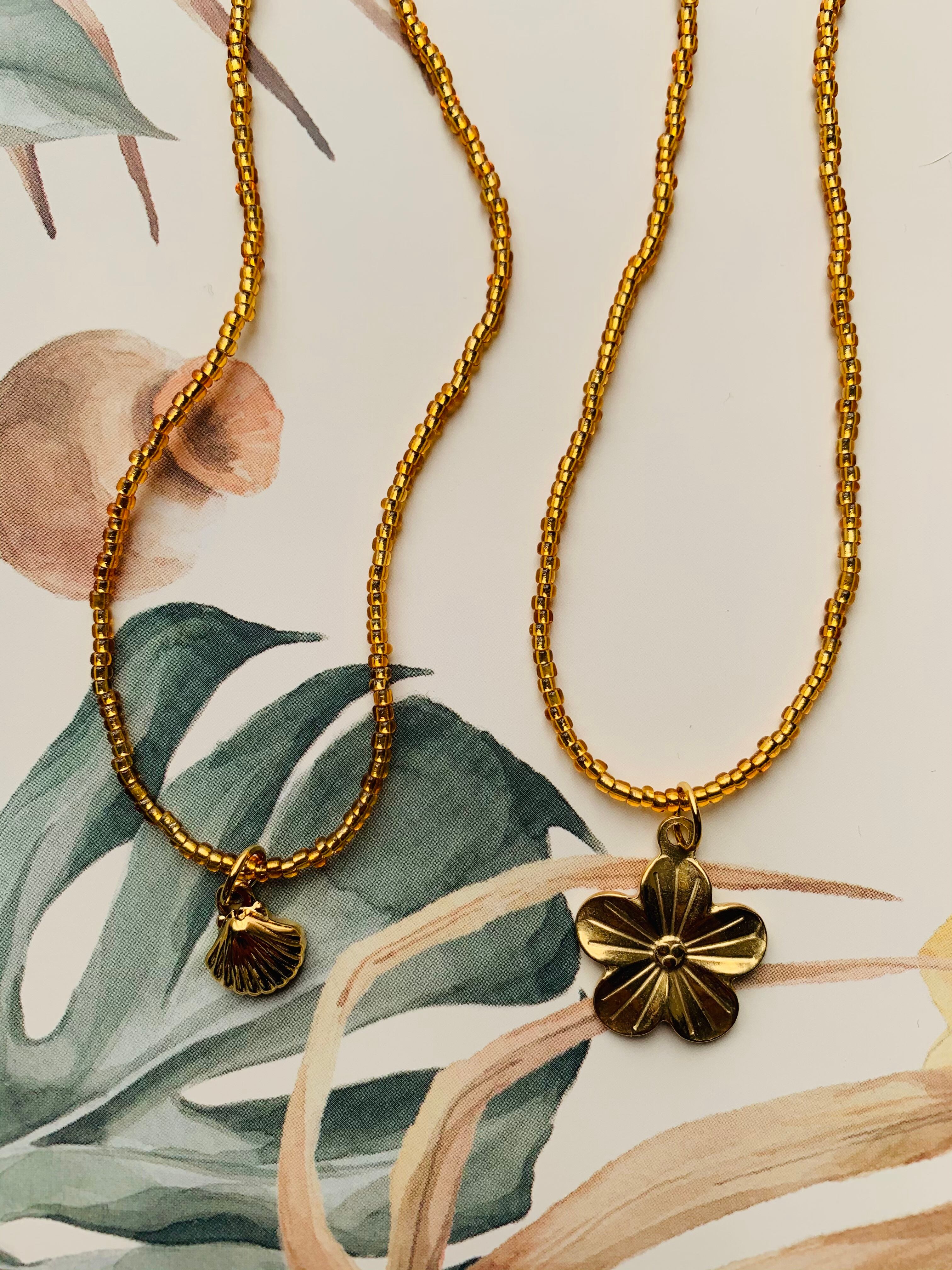ビーズでできたネックレスです。シェルとフラワーからお選び下さい。チャームはステンレスを使用しているのでサビずにアレルギーにも安心な素材です。