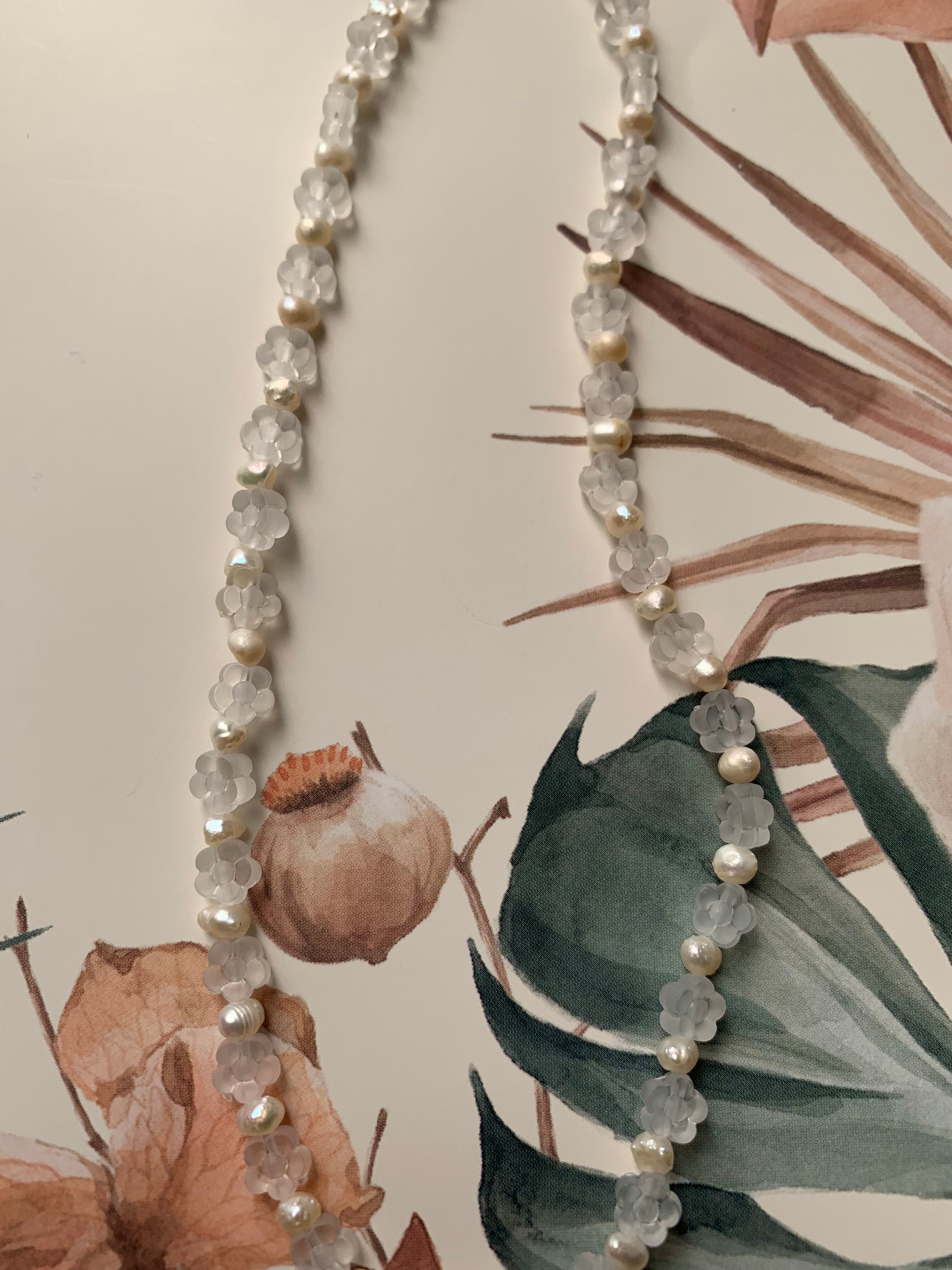 淡水パールとクリアなお花ビーズでできたネックレスです。