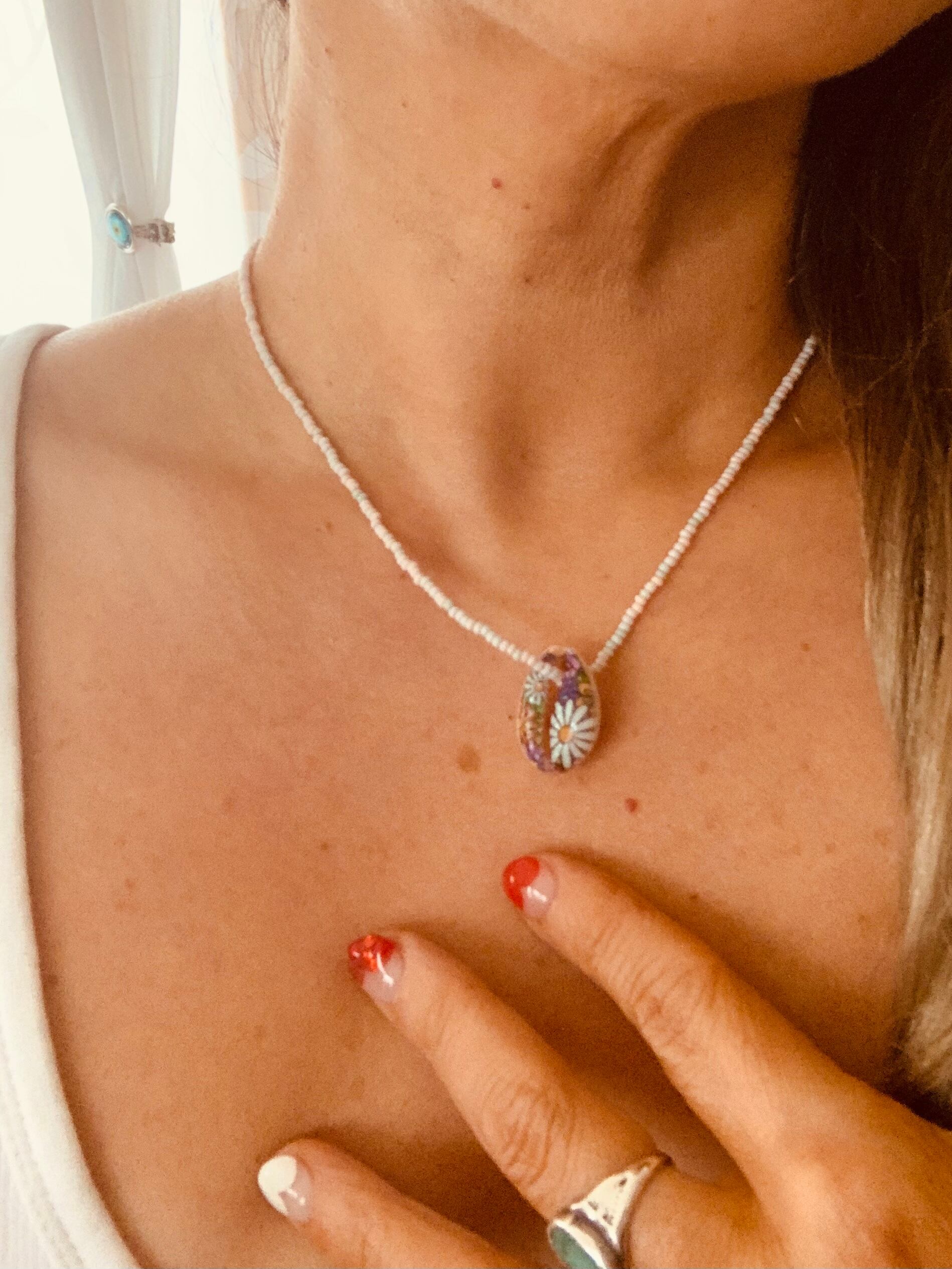 チャームが付いたビーズネックレスです。A.B.C.Dからお選びください。