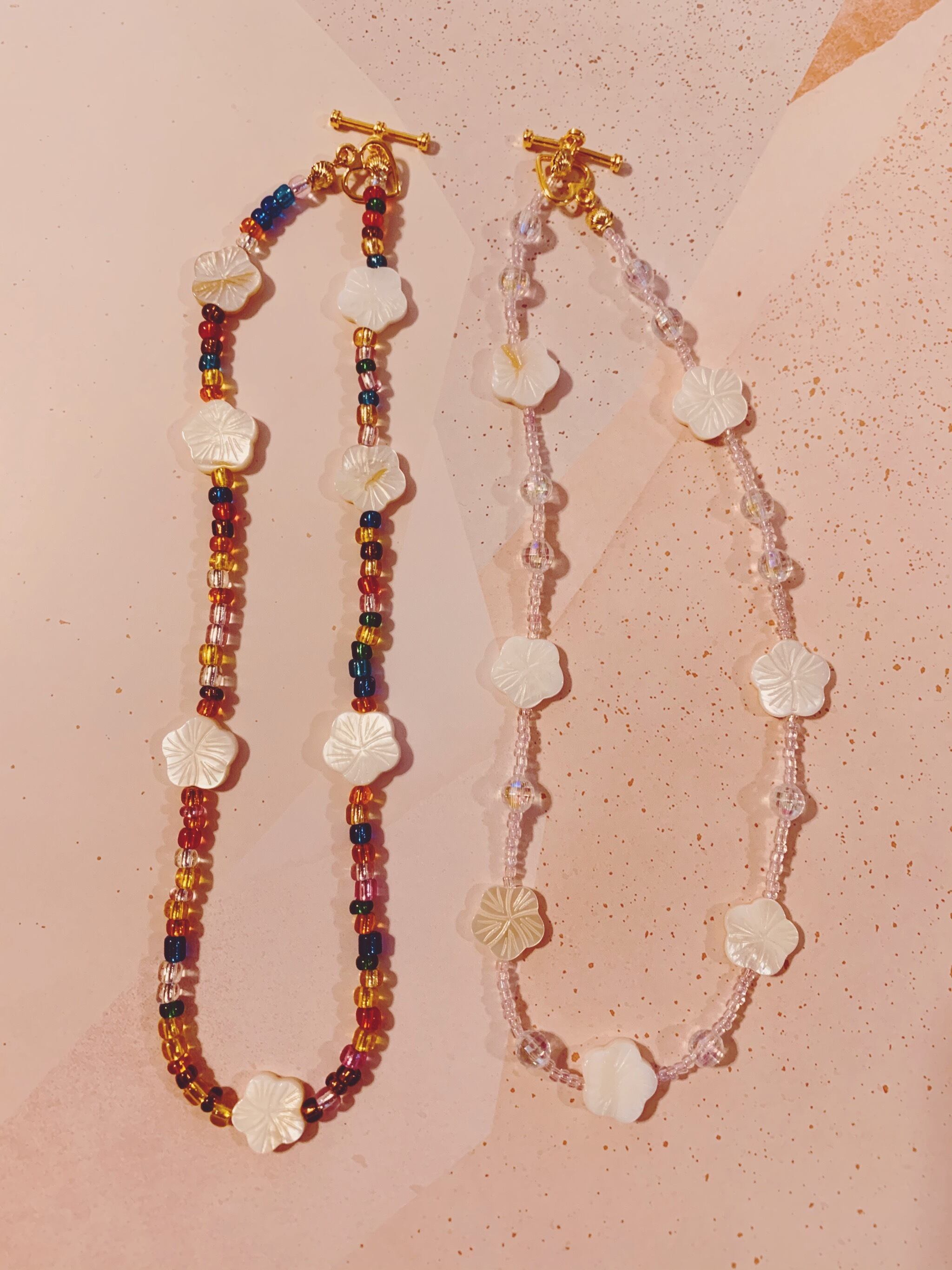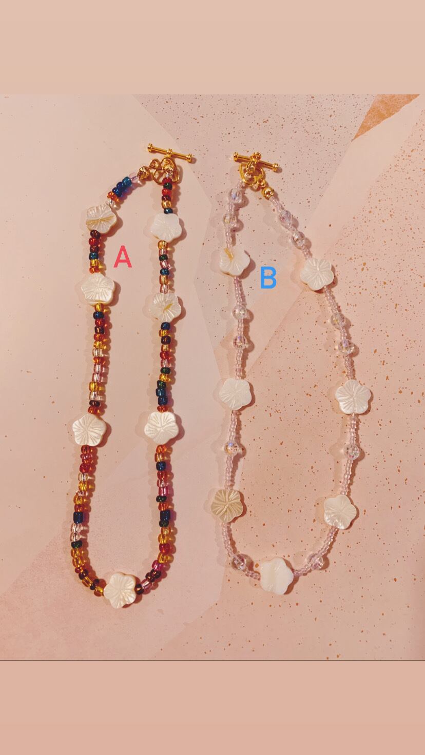 お花の形の天然シェルとビーズのネックレスです。A.Bからお選びください。