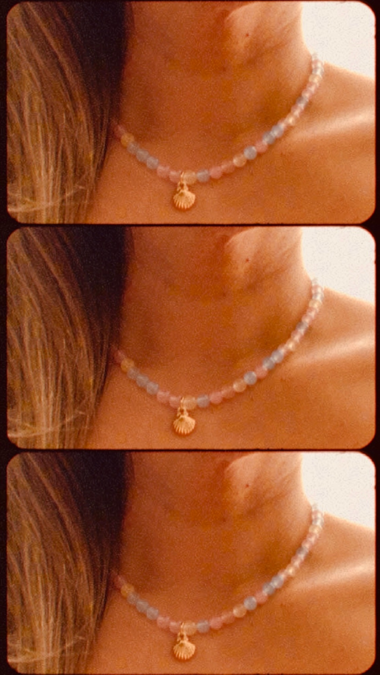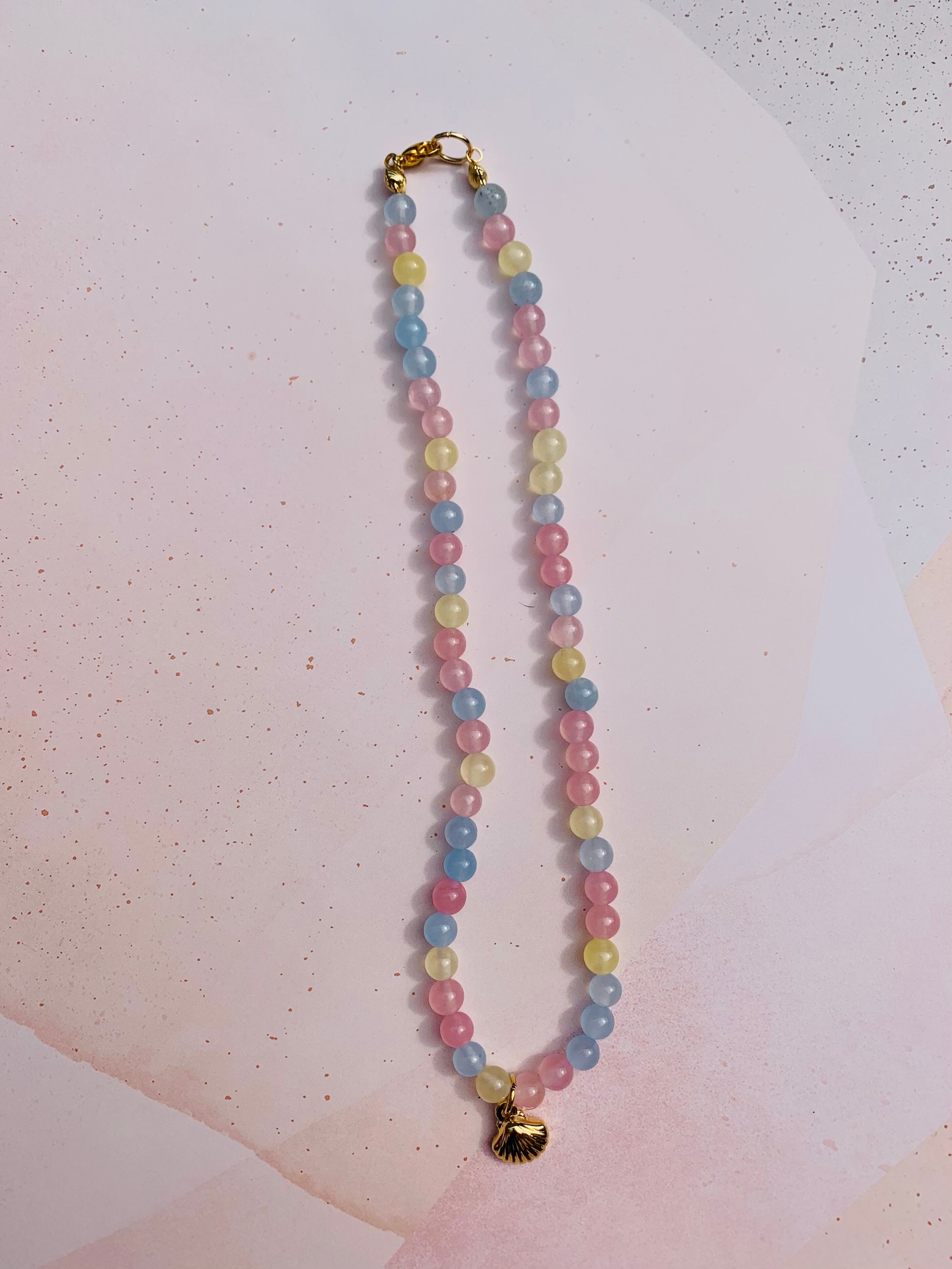 天然モルガナイトのネックレスにシェルのチャームがついています。シェルはステンレスを使用しているのでサビずにアレルギーにも安心な素材です。