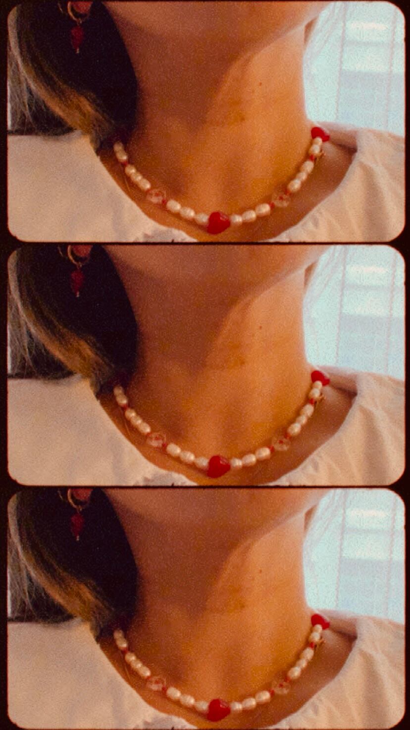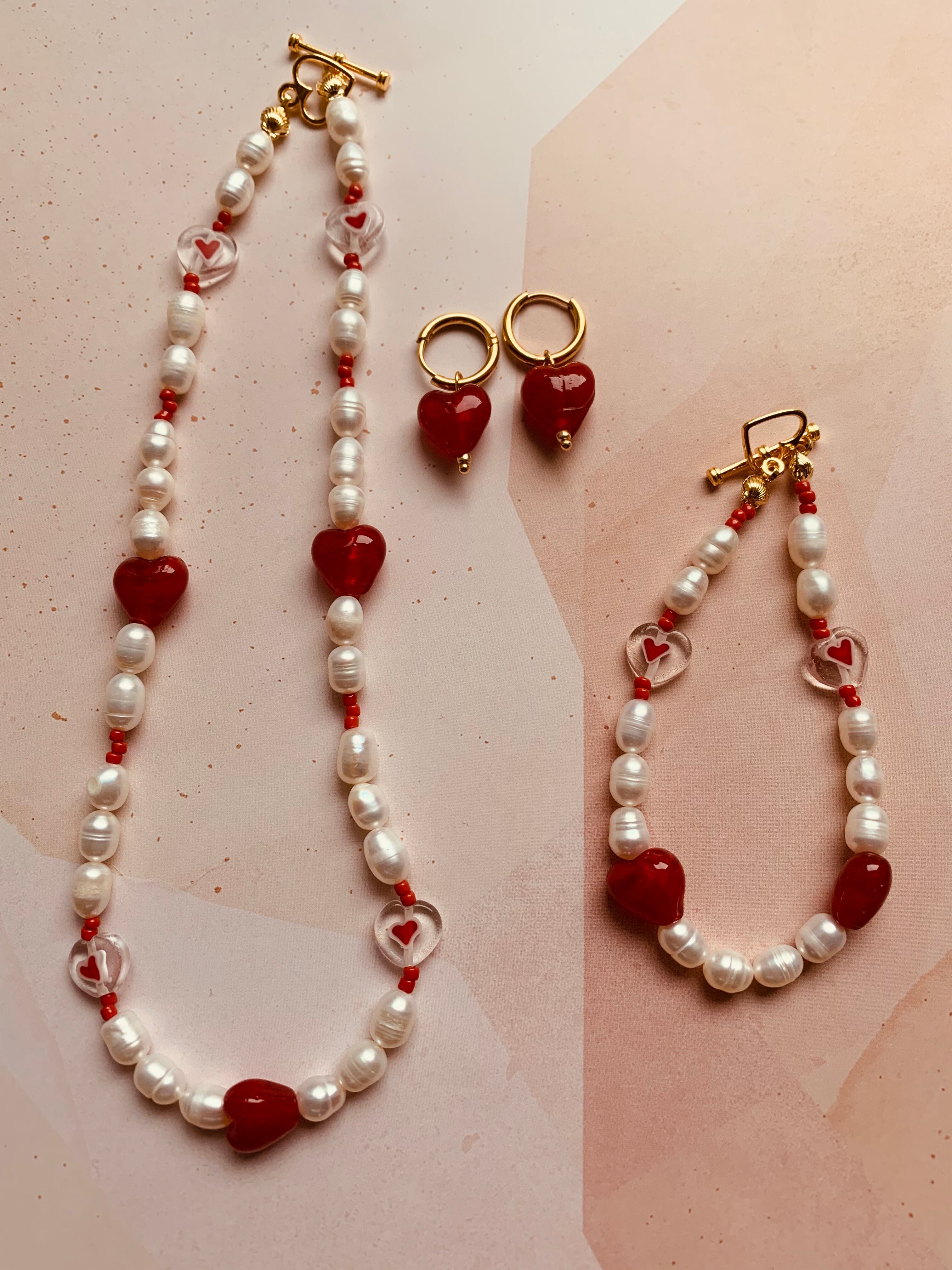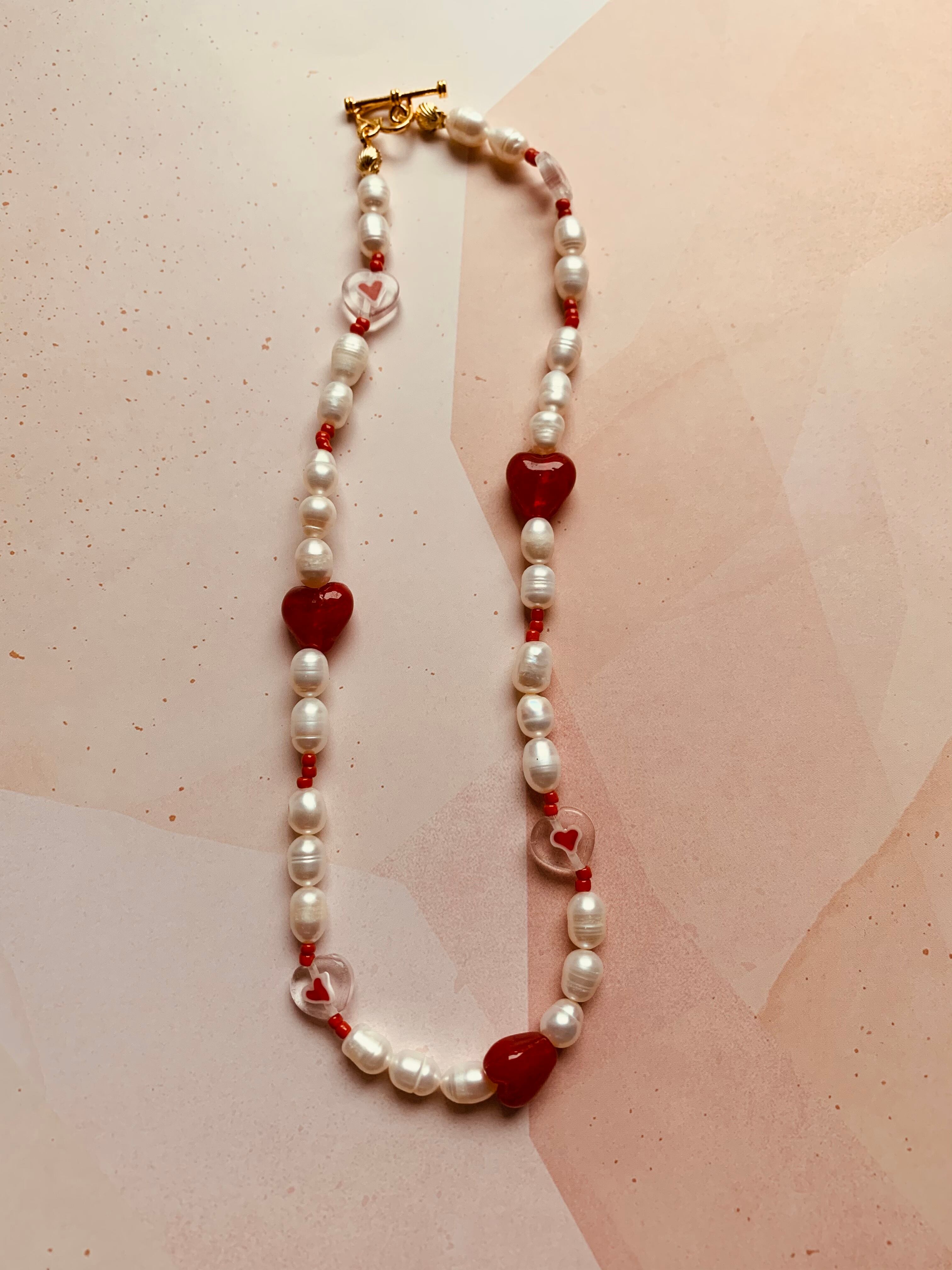 淡水パールとハートのガラスビーズでできたネックレスです。