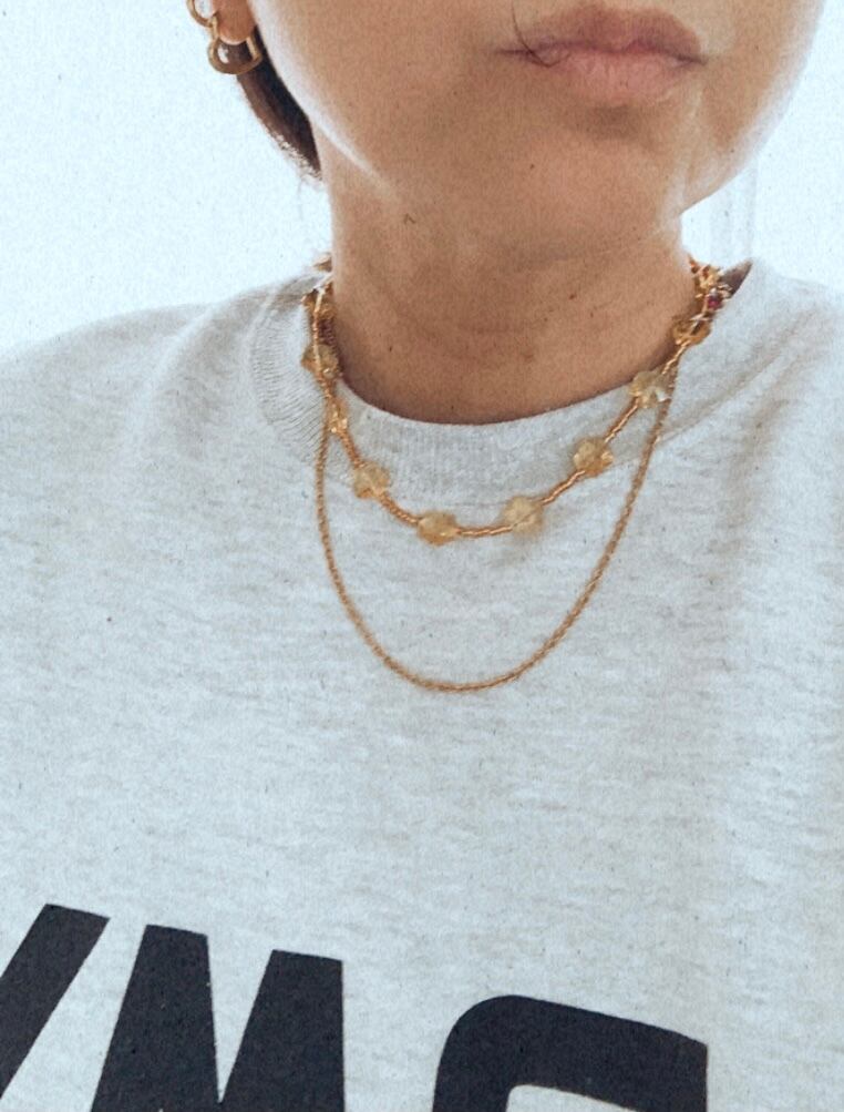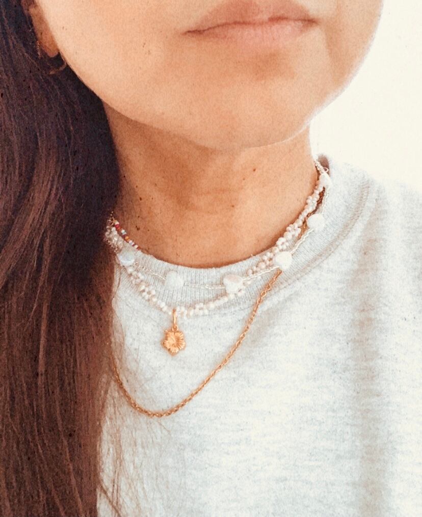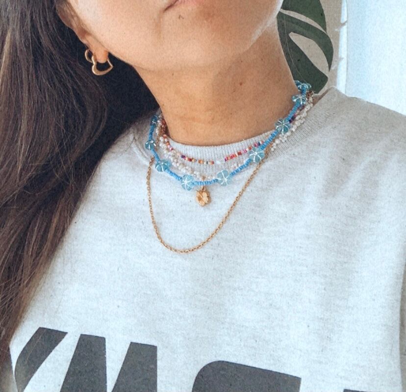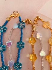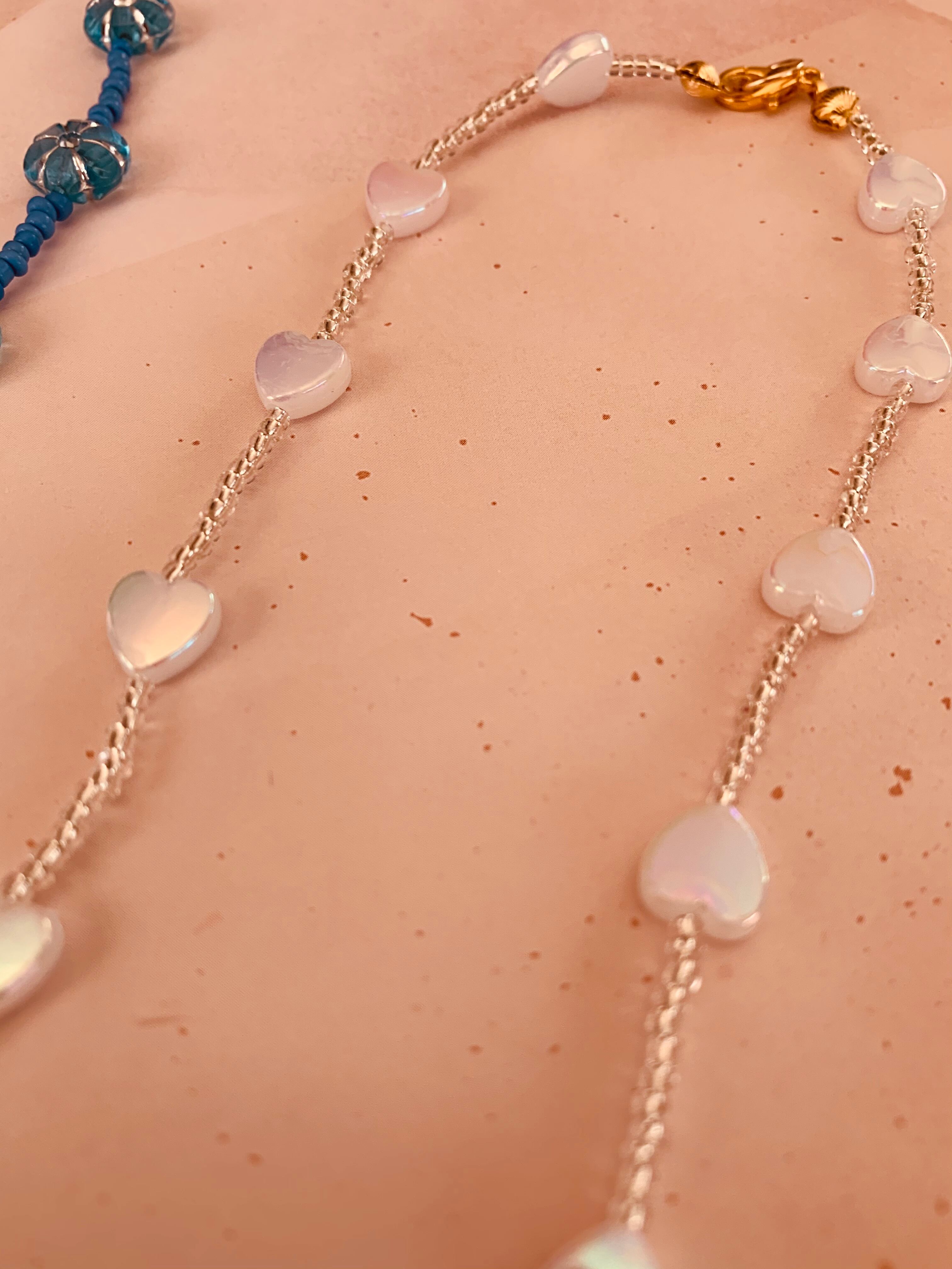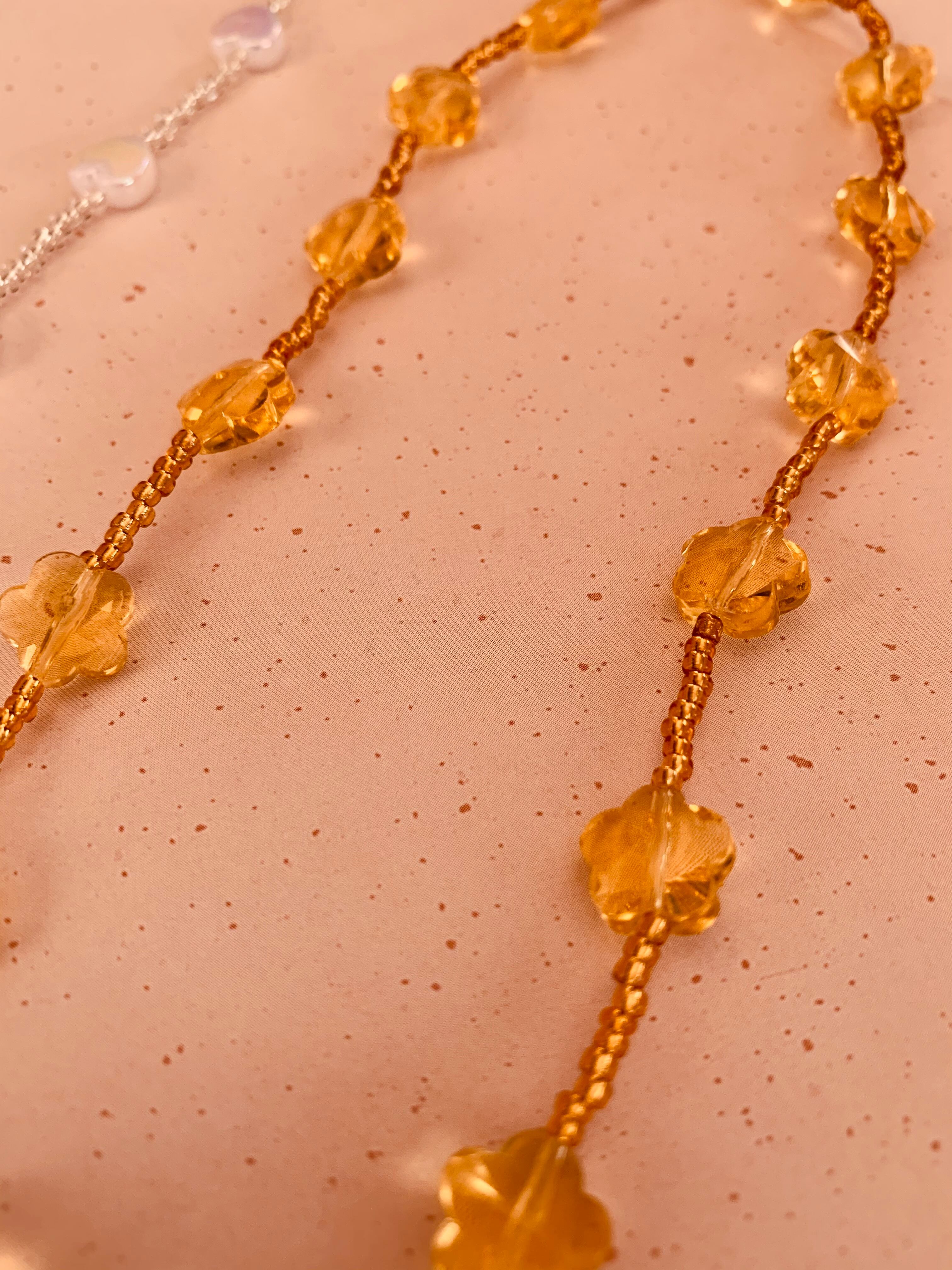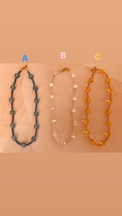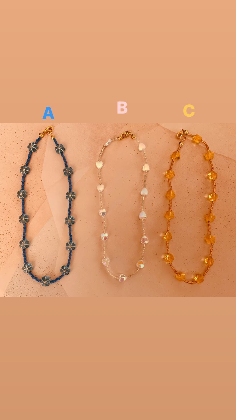 花の形やハートがアクセントのビーズネックレスです。A.B.Cからお選びください。