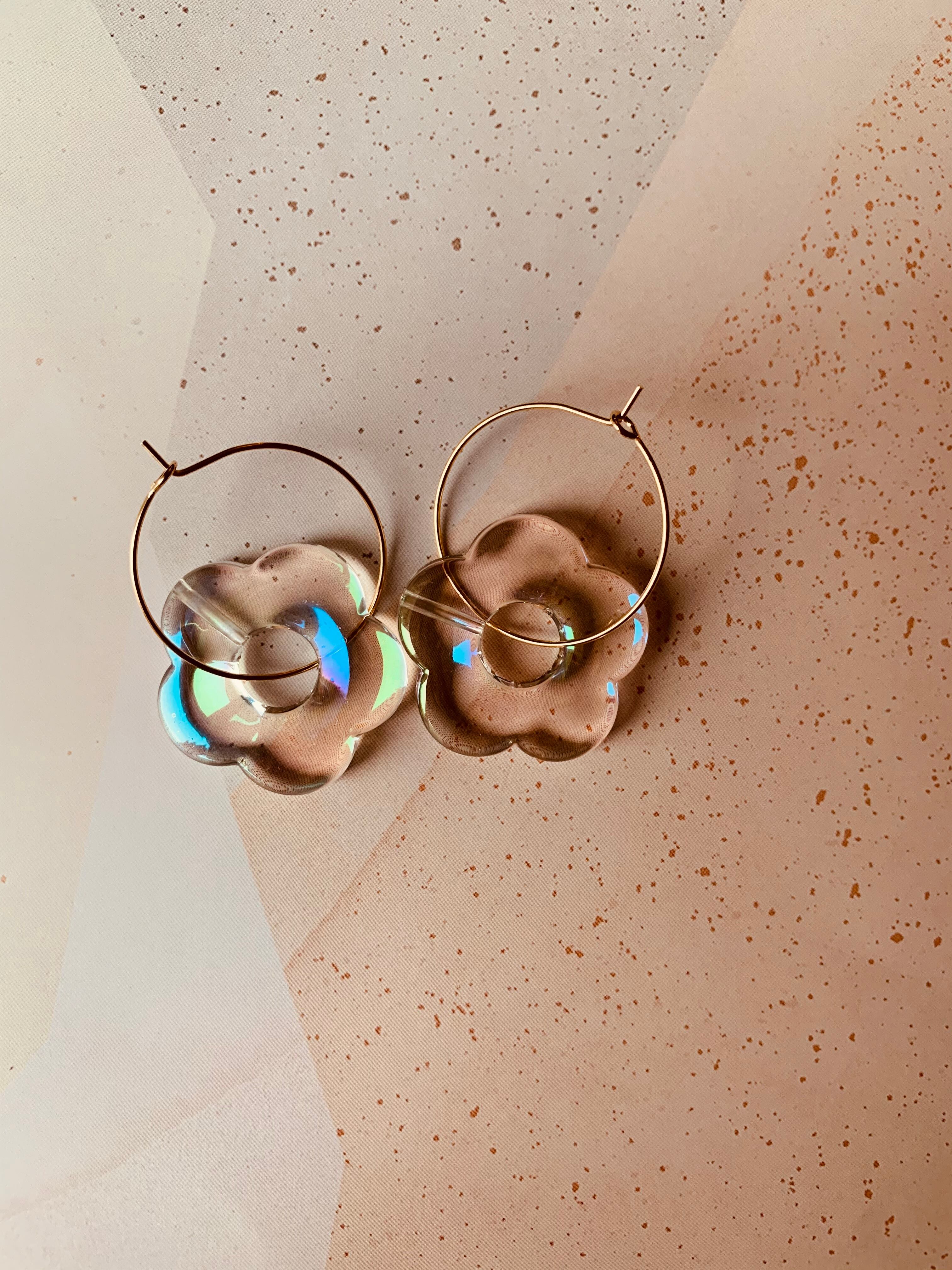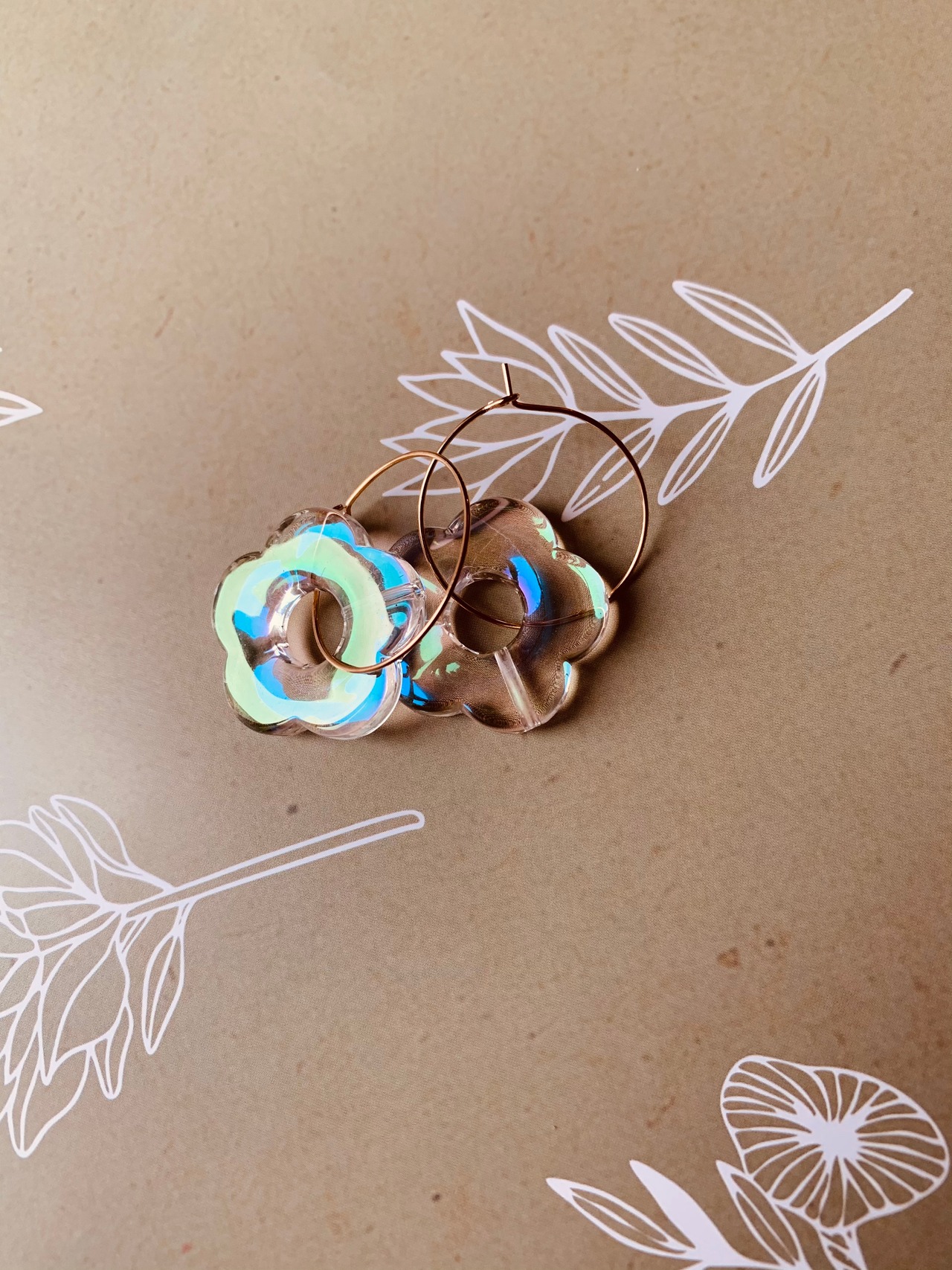 クリアなかわいいお花のフープピアスです。ピアスはステンレスを使用しているのでサビずにアレルギーにも安心な素材です。