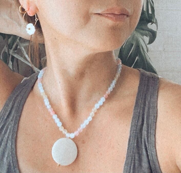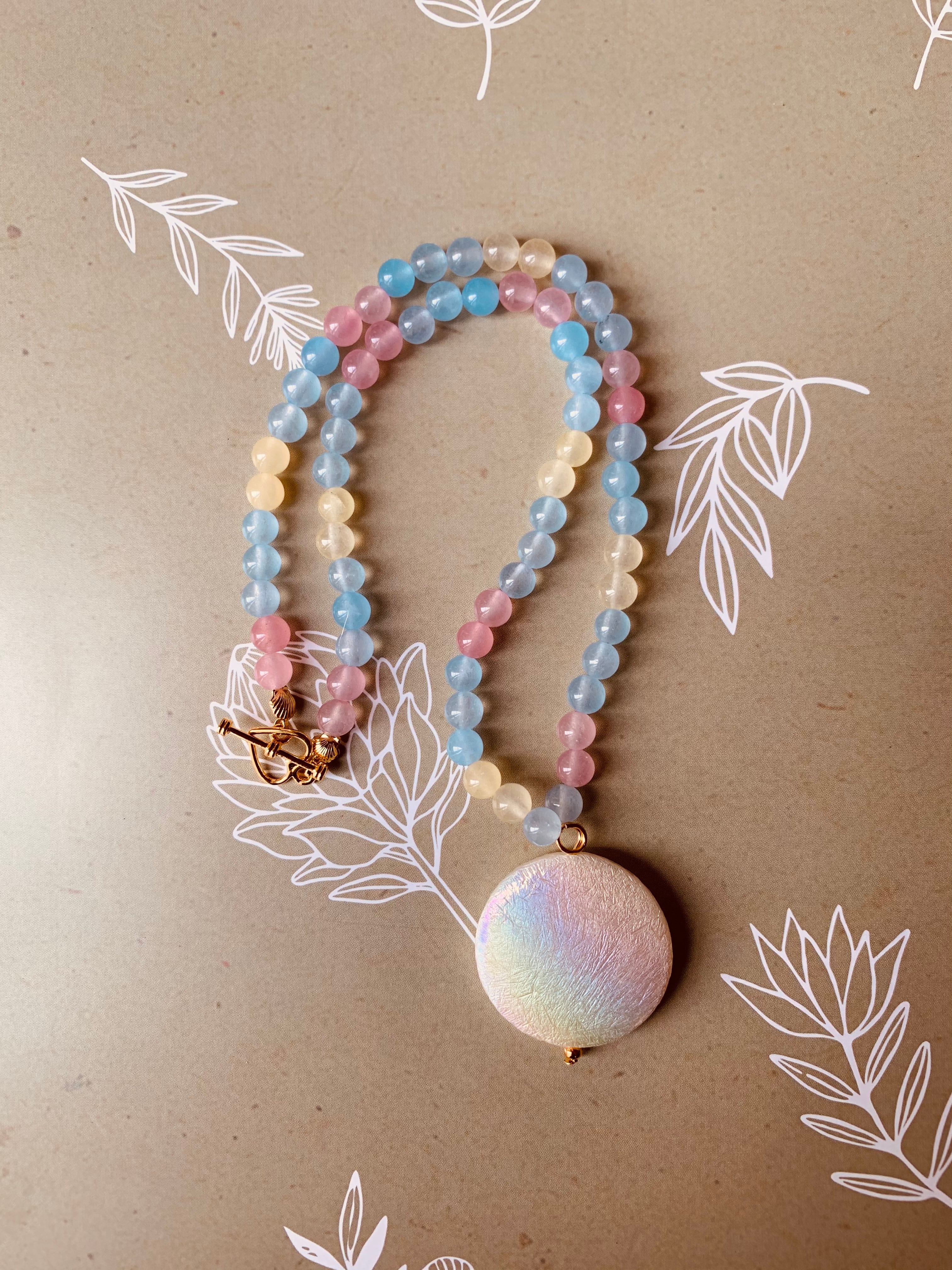 天然モルガナイトに人工ラウンドシェルが付いたネックレスです。