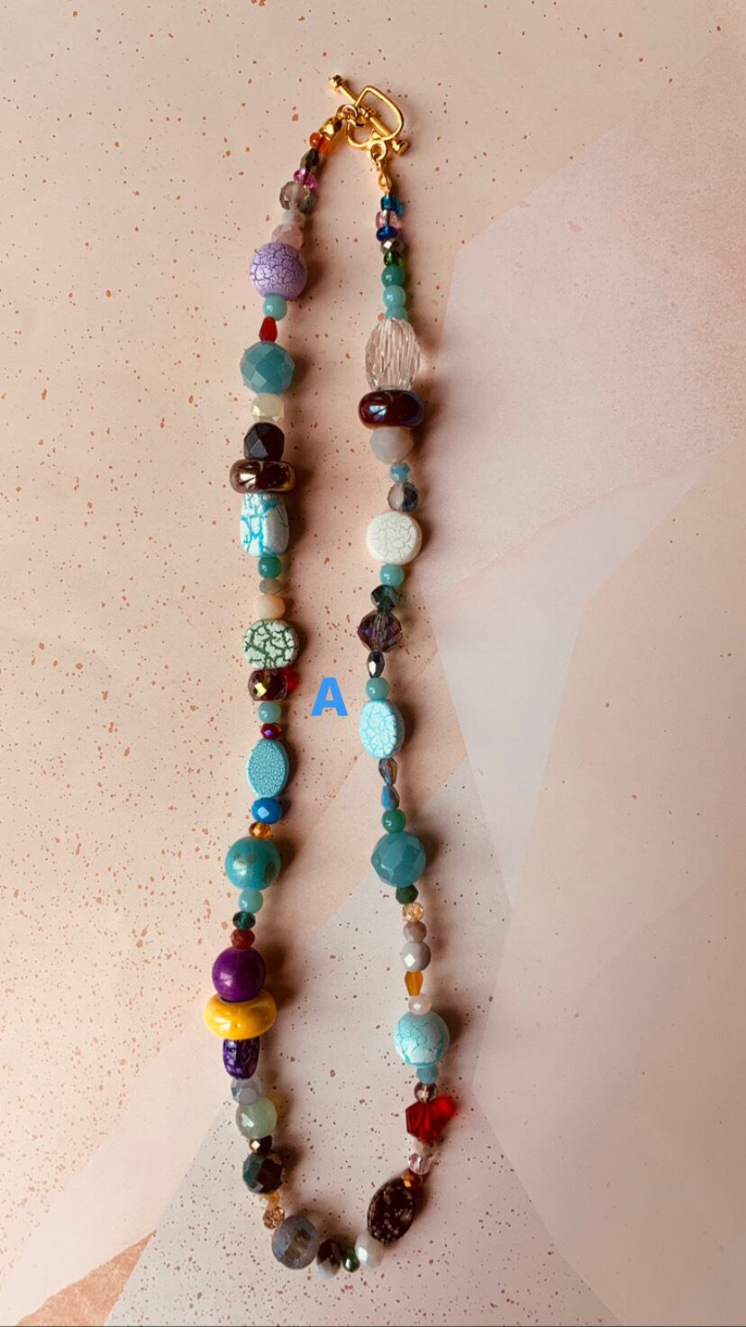 色々なビーズと色々なストーンでできたネックレスです。A.B.C.Dからお選びください。留め具がハートになっています。