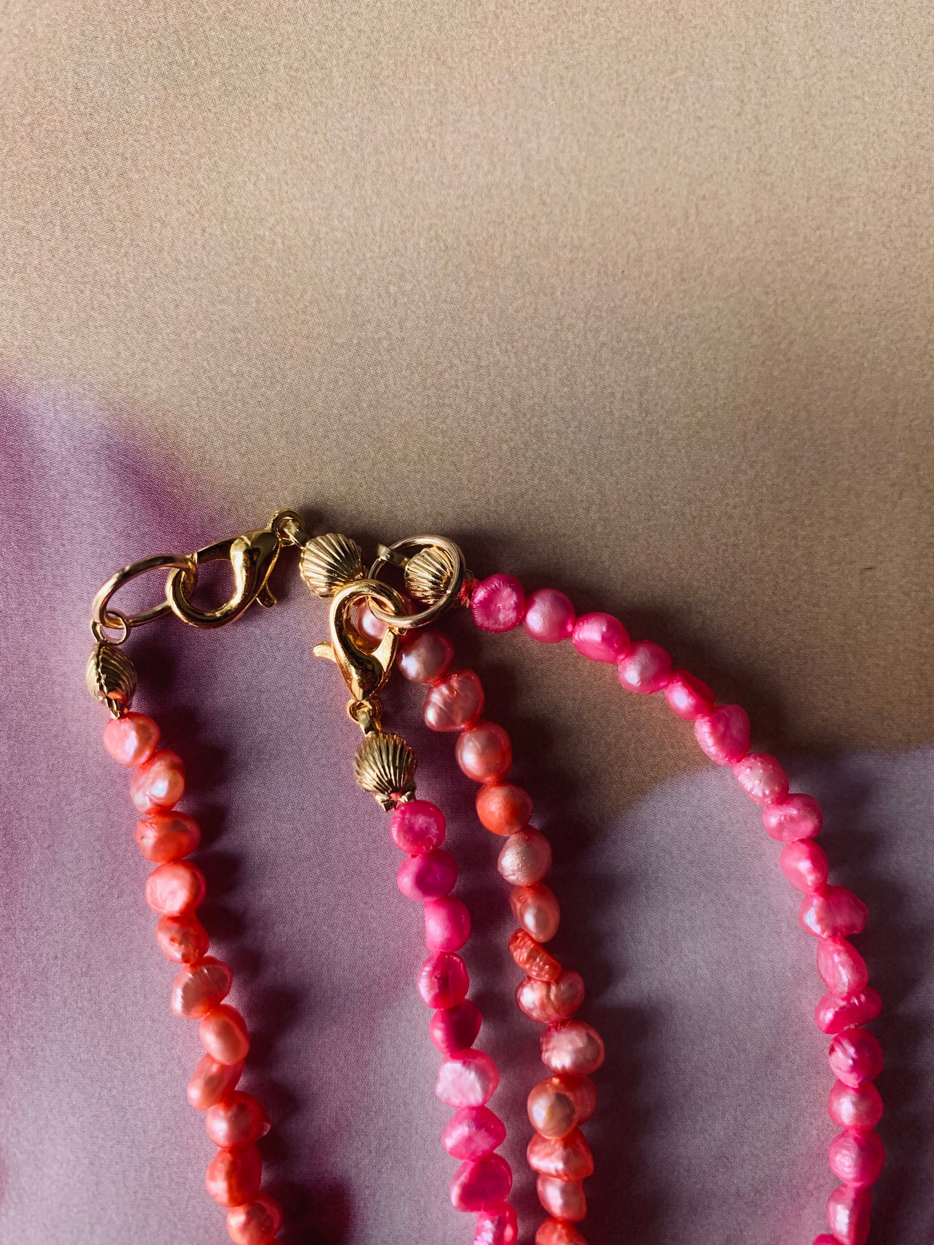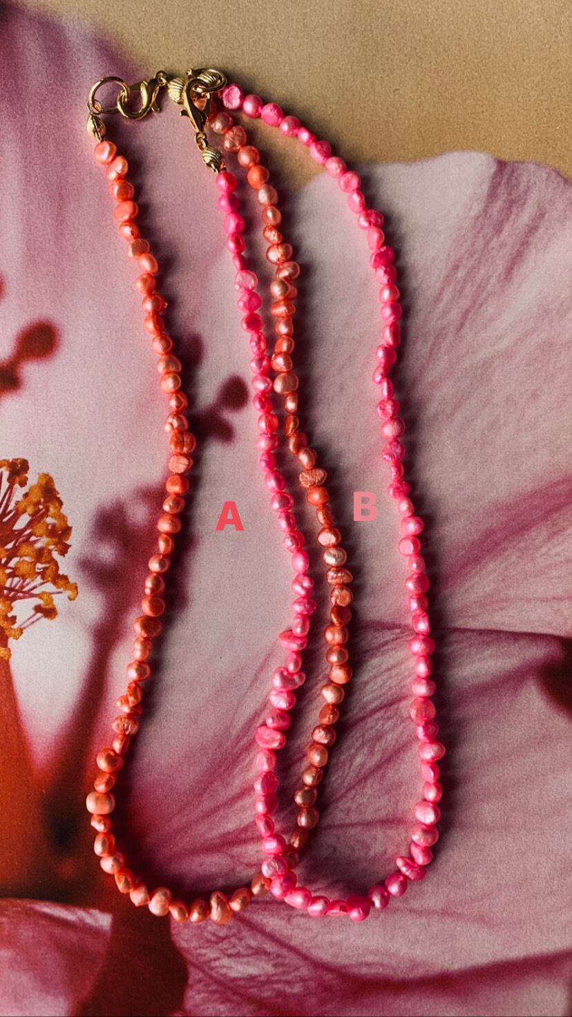カラーリングした淡水パールのネックレスです。A.Bからお選びください。留め具がシェルの形になっています。