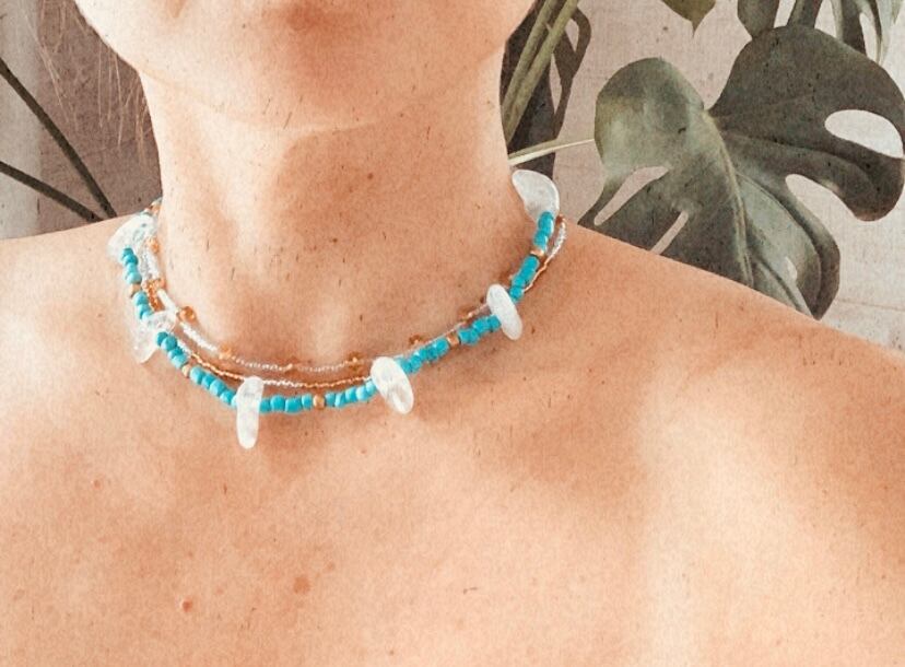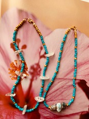 ターコイズカラーのビーズにクリスタル、シェルがついたネックレスです。