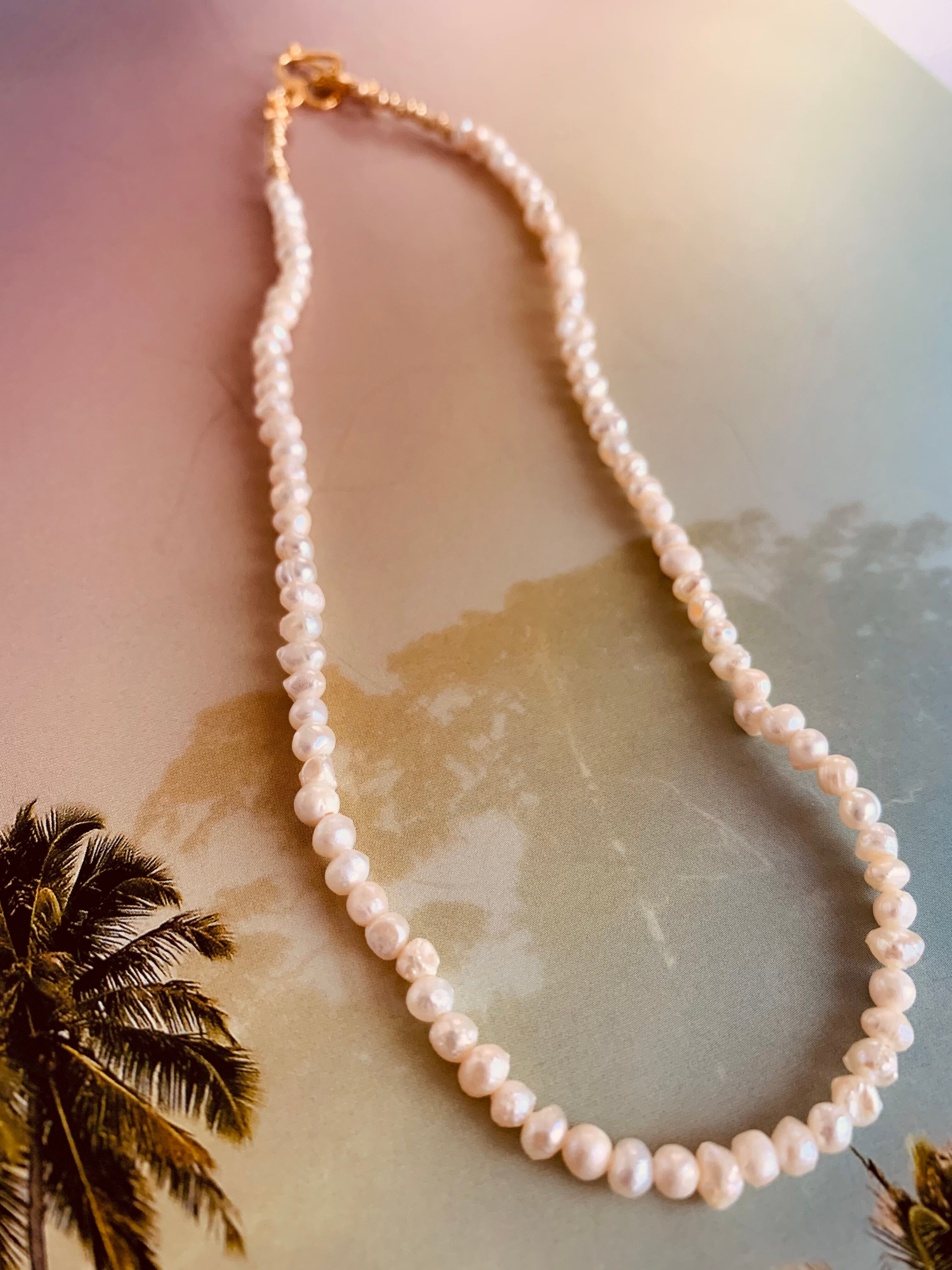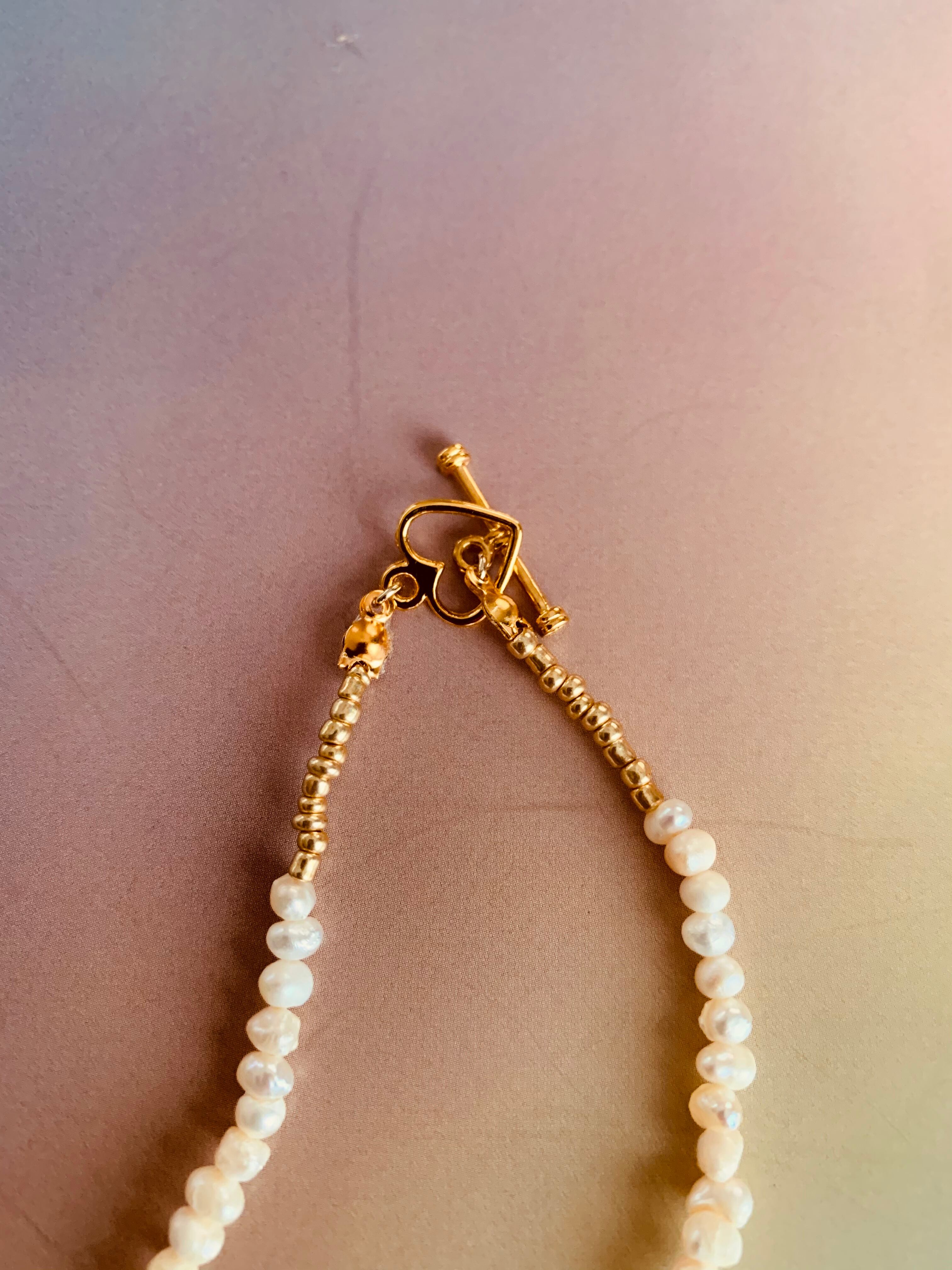 小さな淡水パールのネックレスです。シンプルで使いやすいです。留め具はハートになっています。