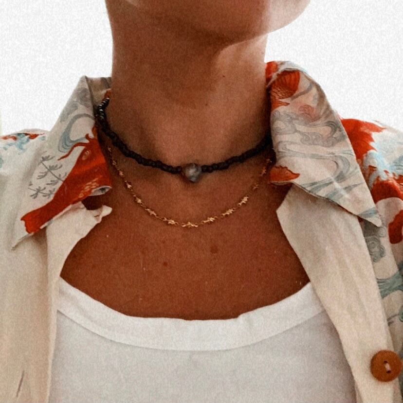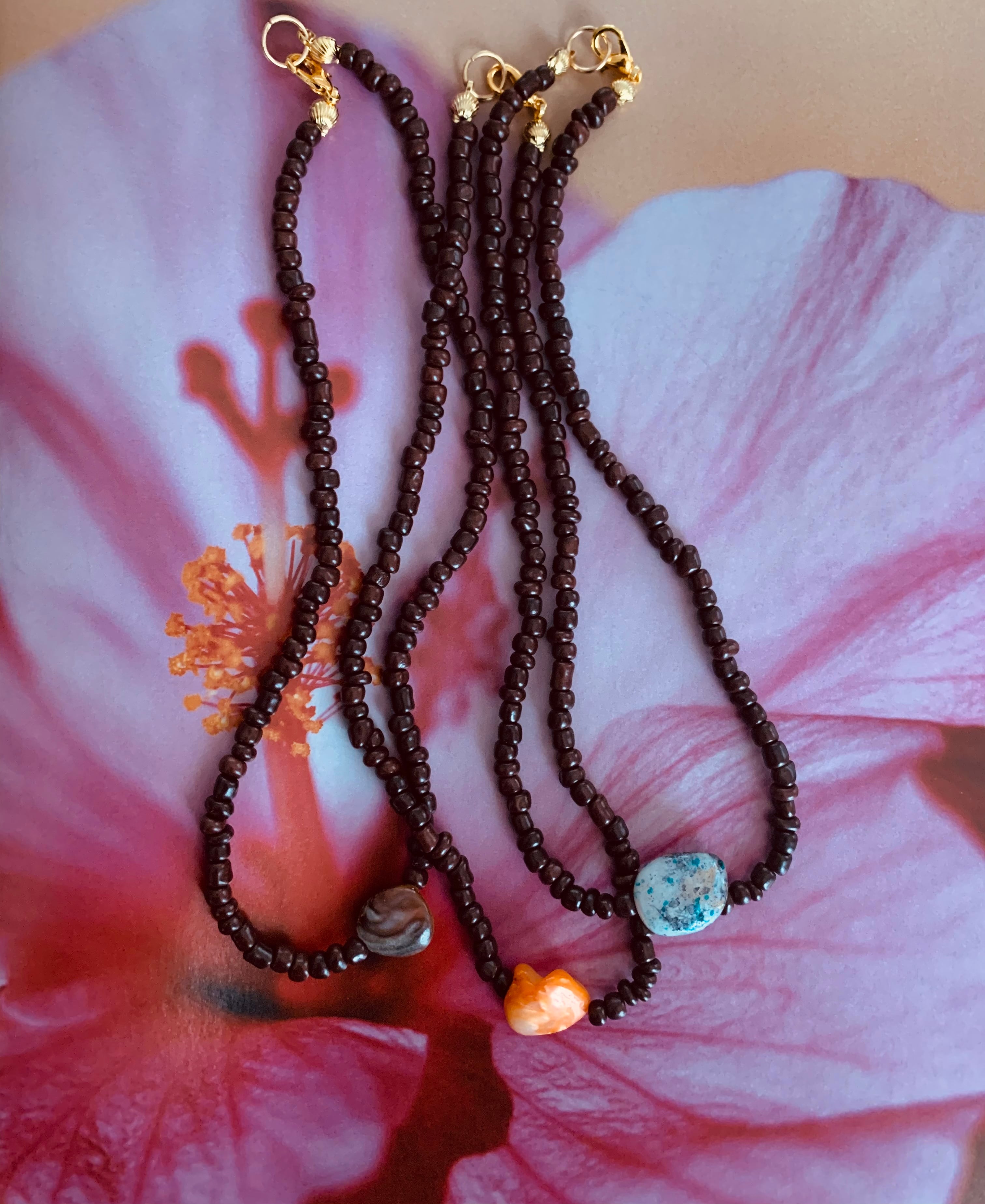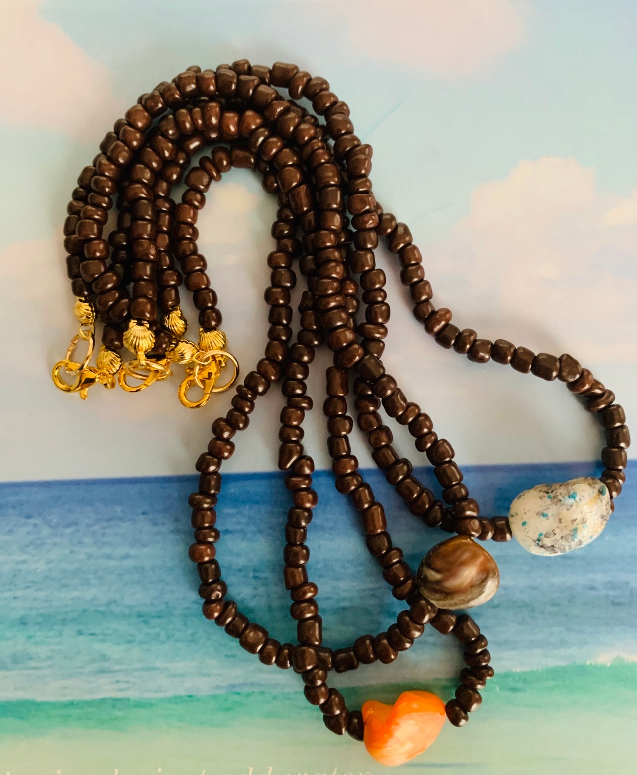 ココナッツブラウンビーズと一粒の天然シェルがついたネックレスです。