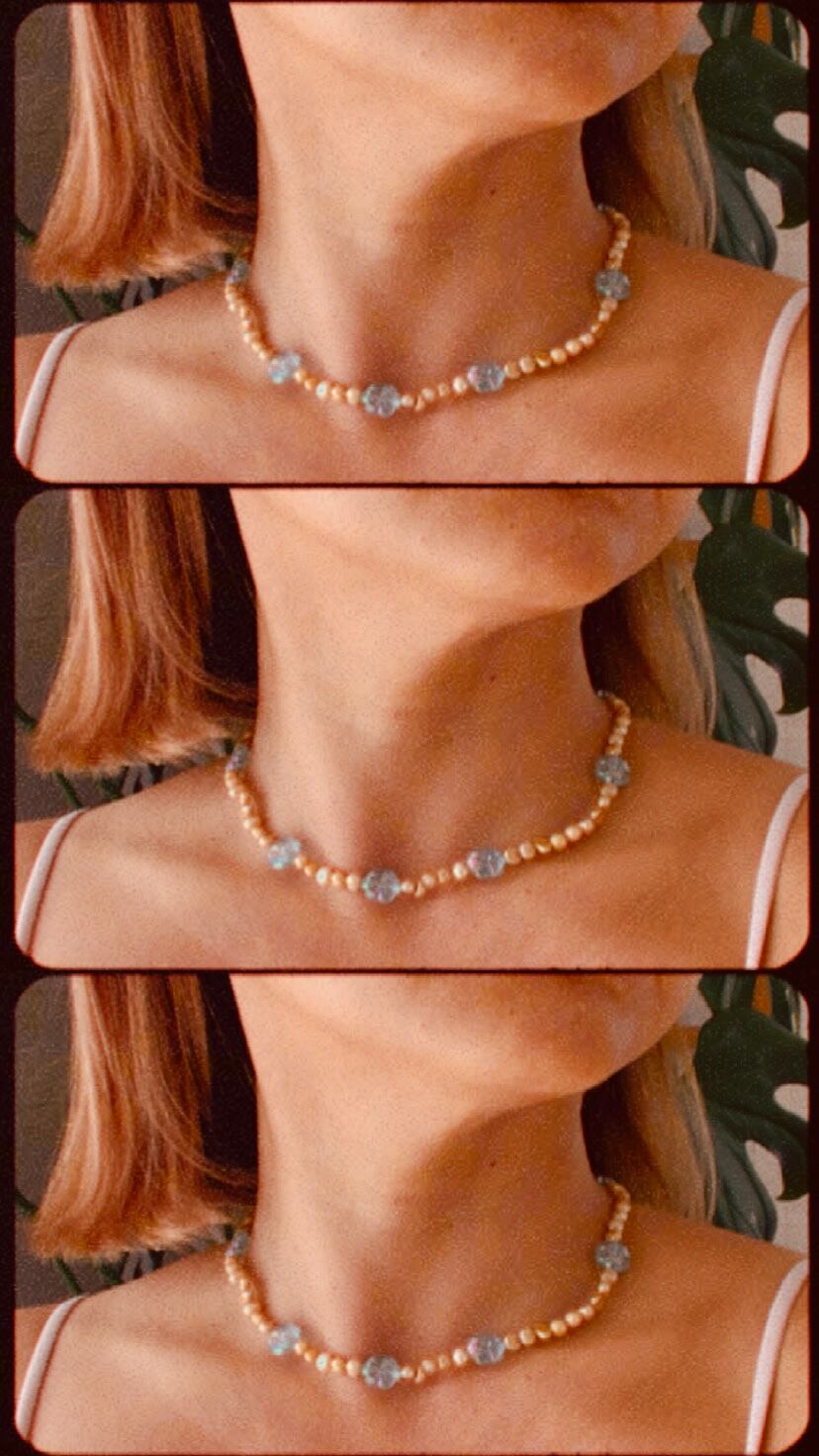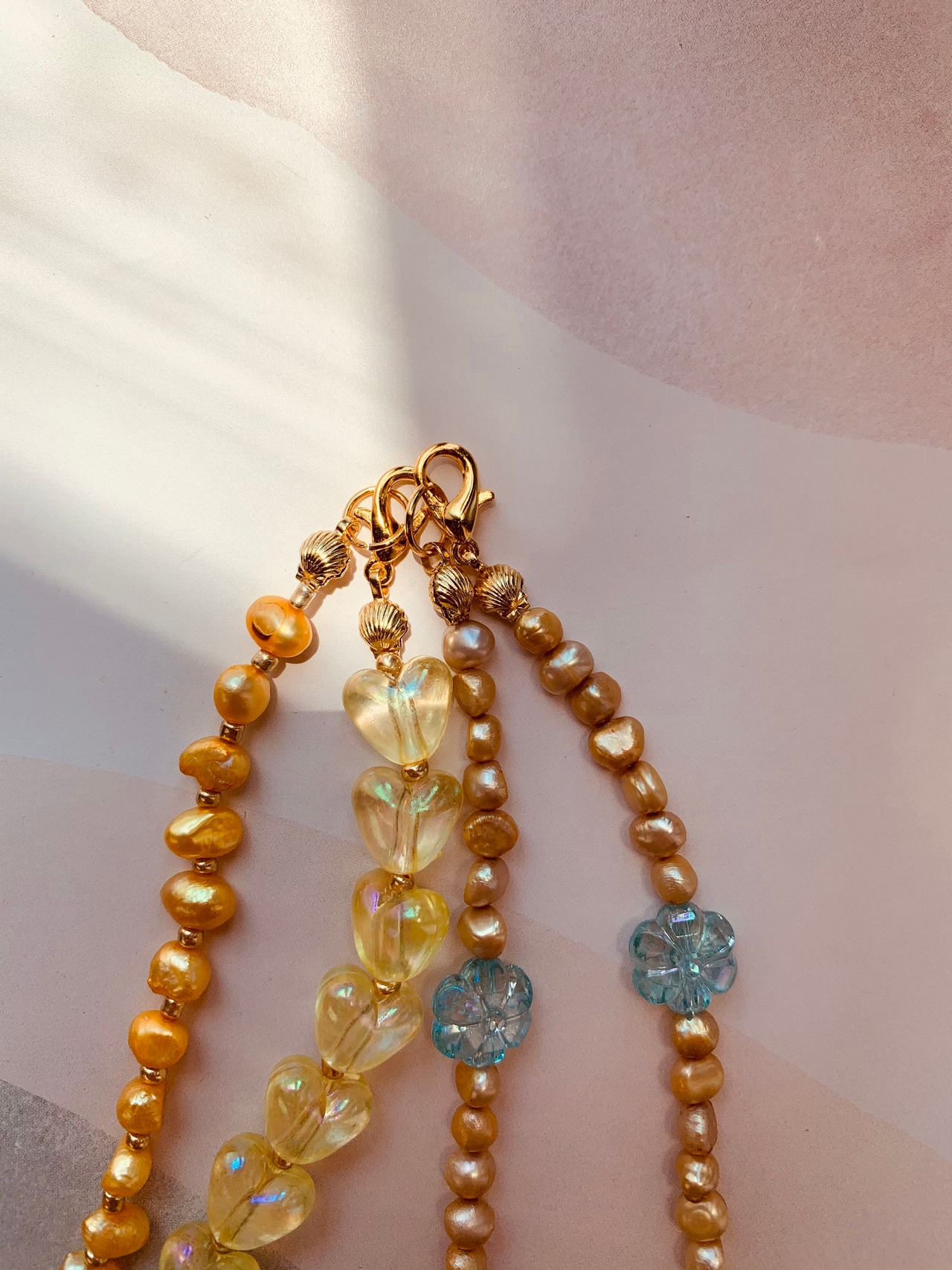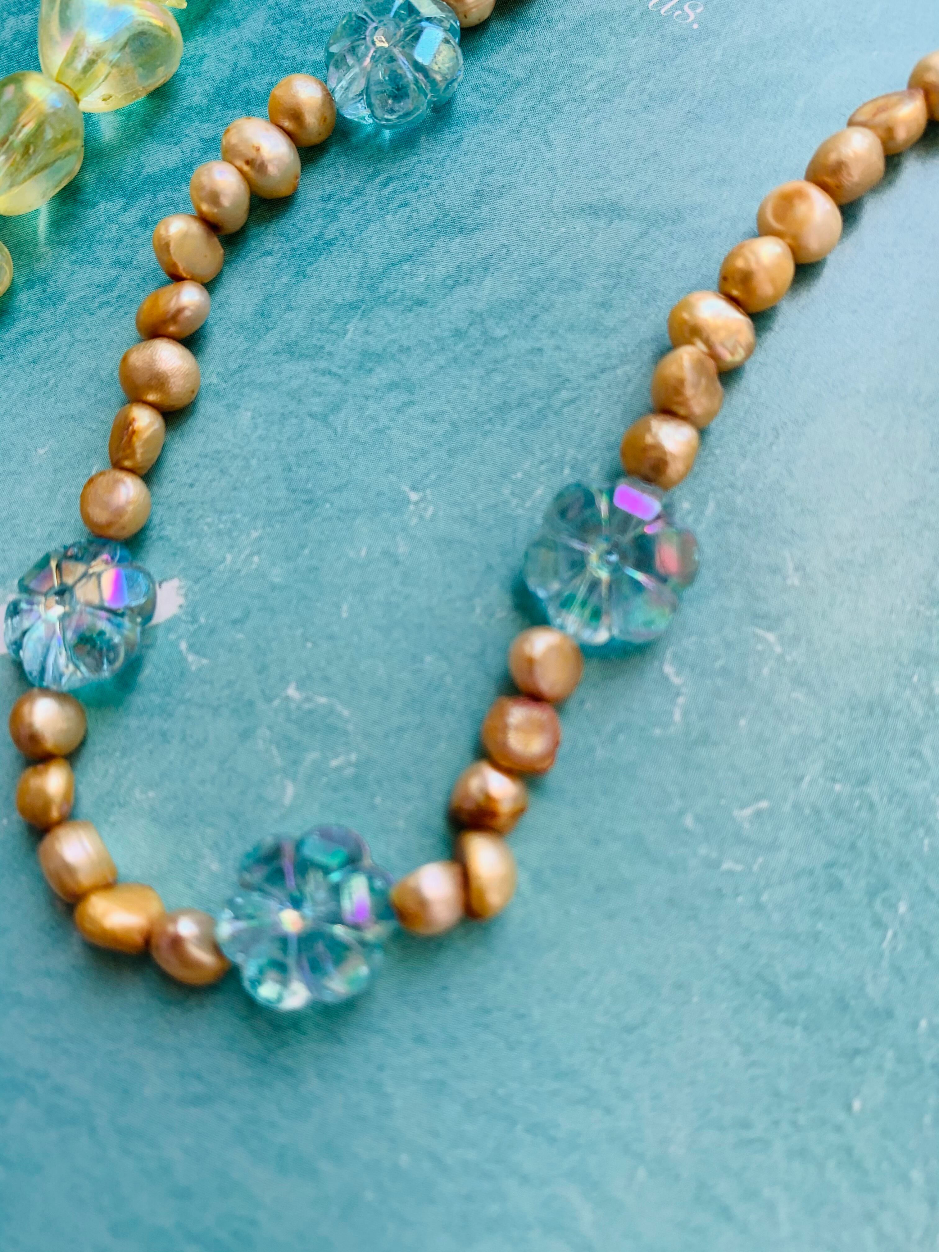 カラーされた淡水パールにクリアなハートと花がついたネックレスです。A.Bからお選び下さい。