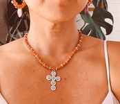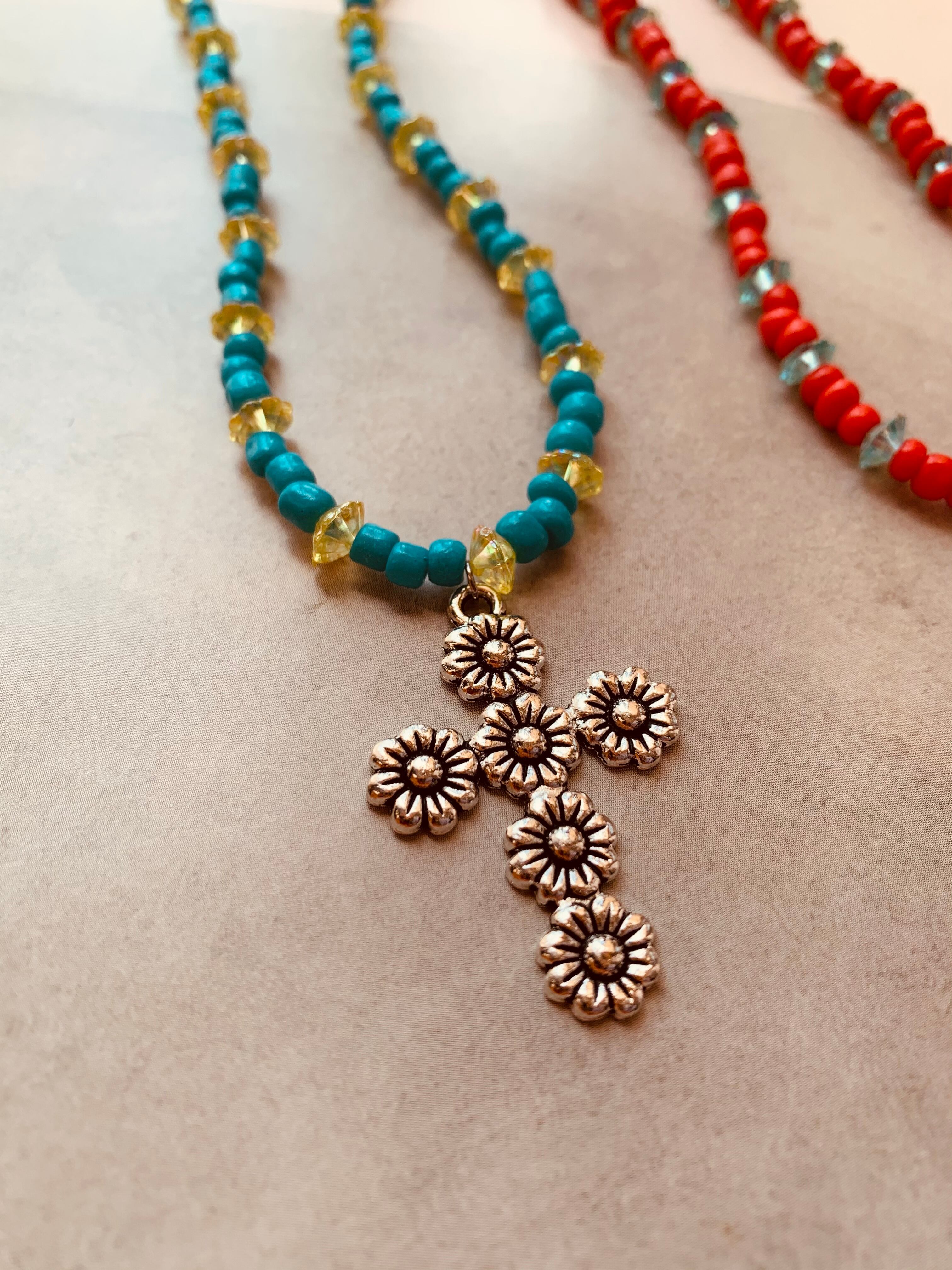 お花がクロスになったチャームが付いたビーズネックレスです。A.Bからお選び下さい。