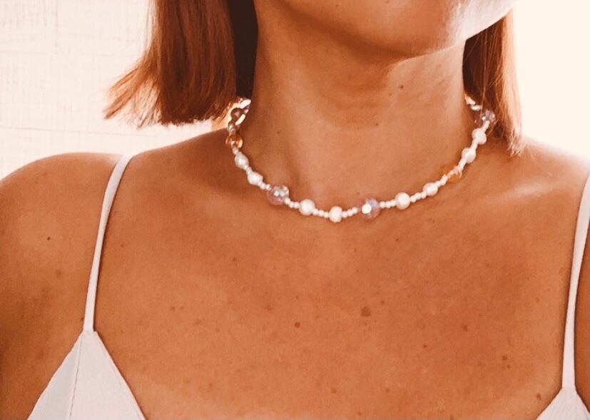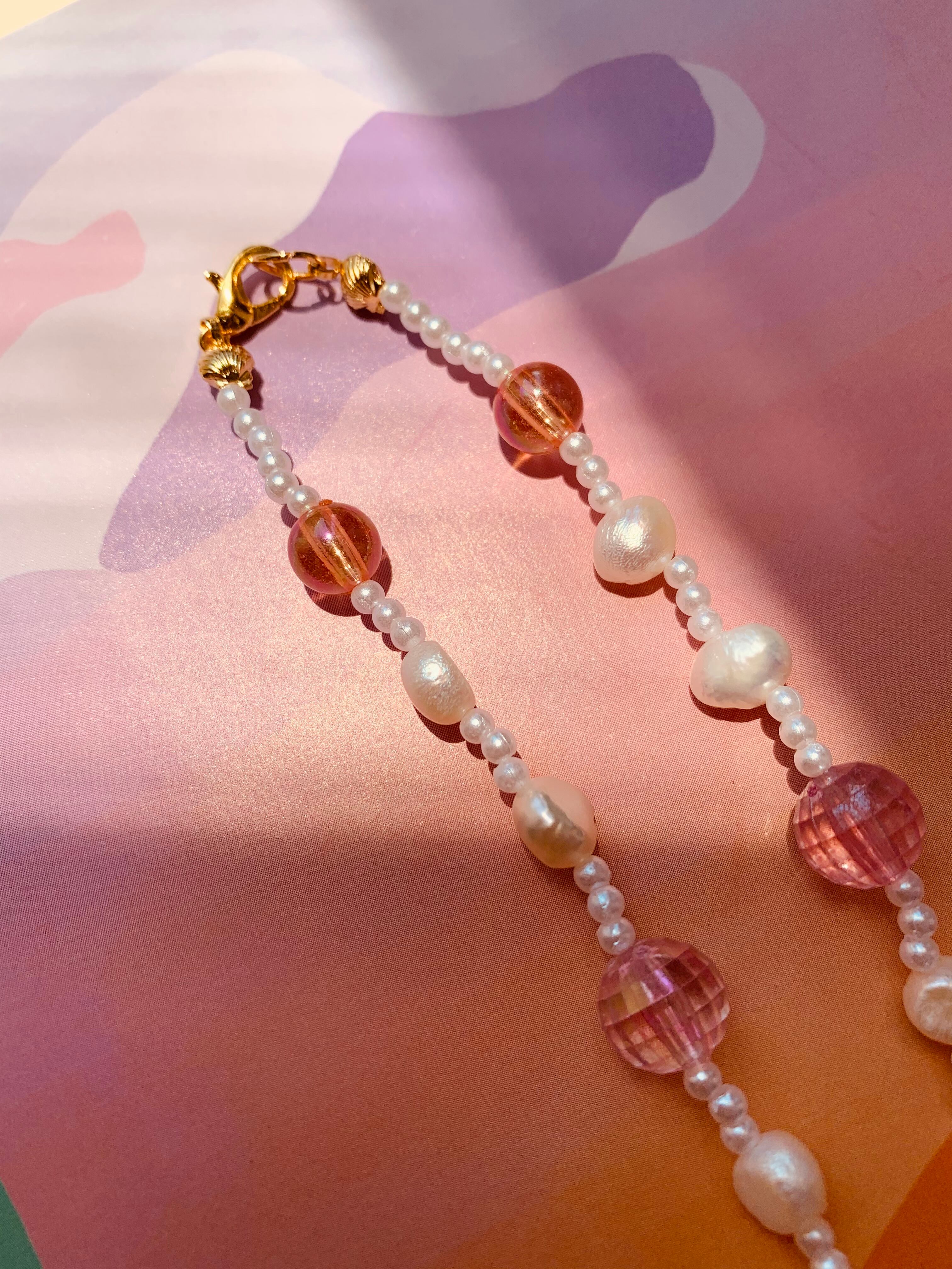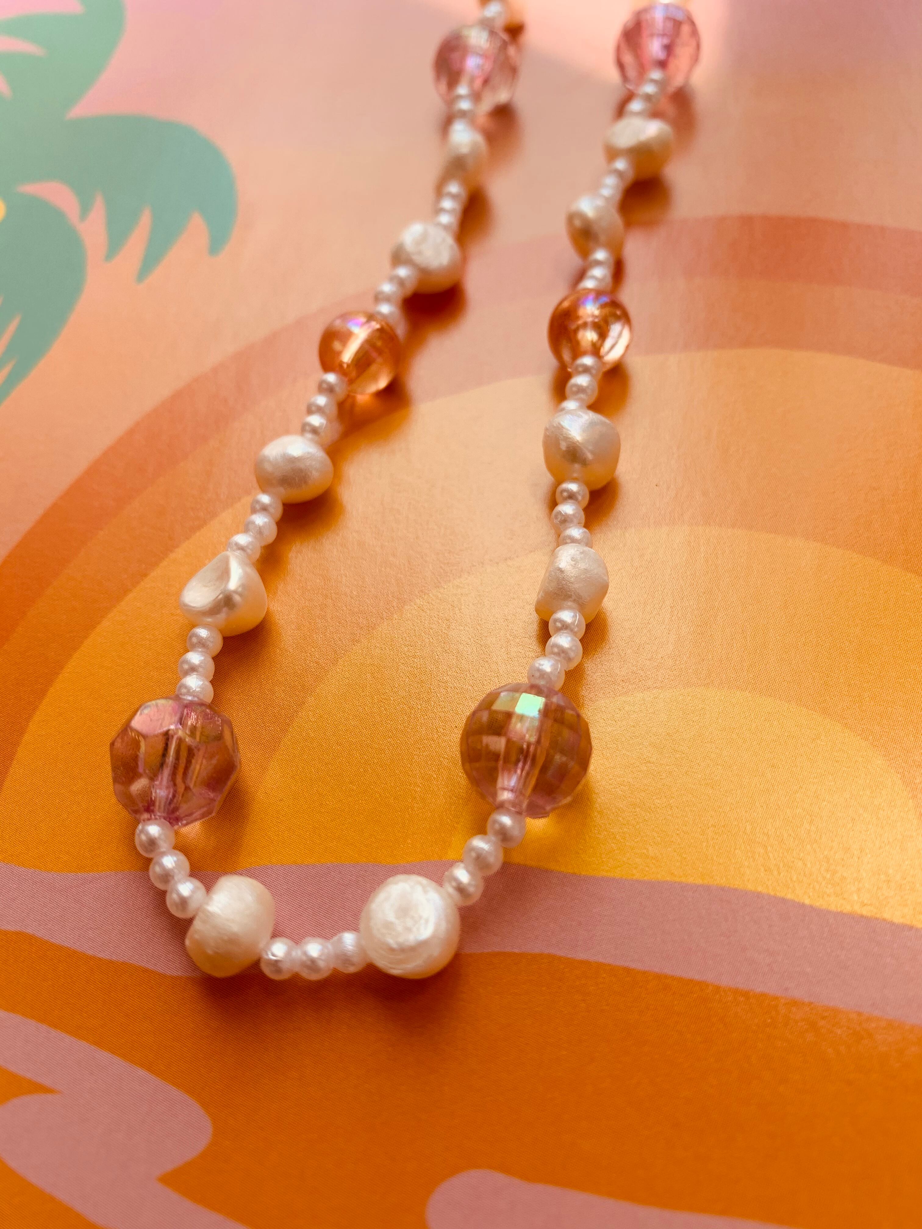 淡水パールとクリアなビーズが付いたピンク系のネックレスです。