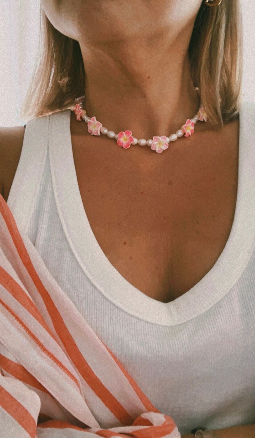 淡水パールとハイビスカスで出来たレイの様なネックレスです。
