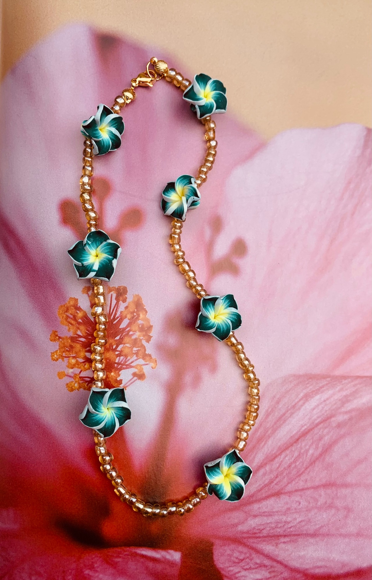 ハイビスカスとビーズでできたネックレスです。