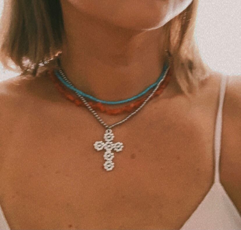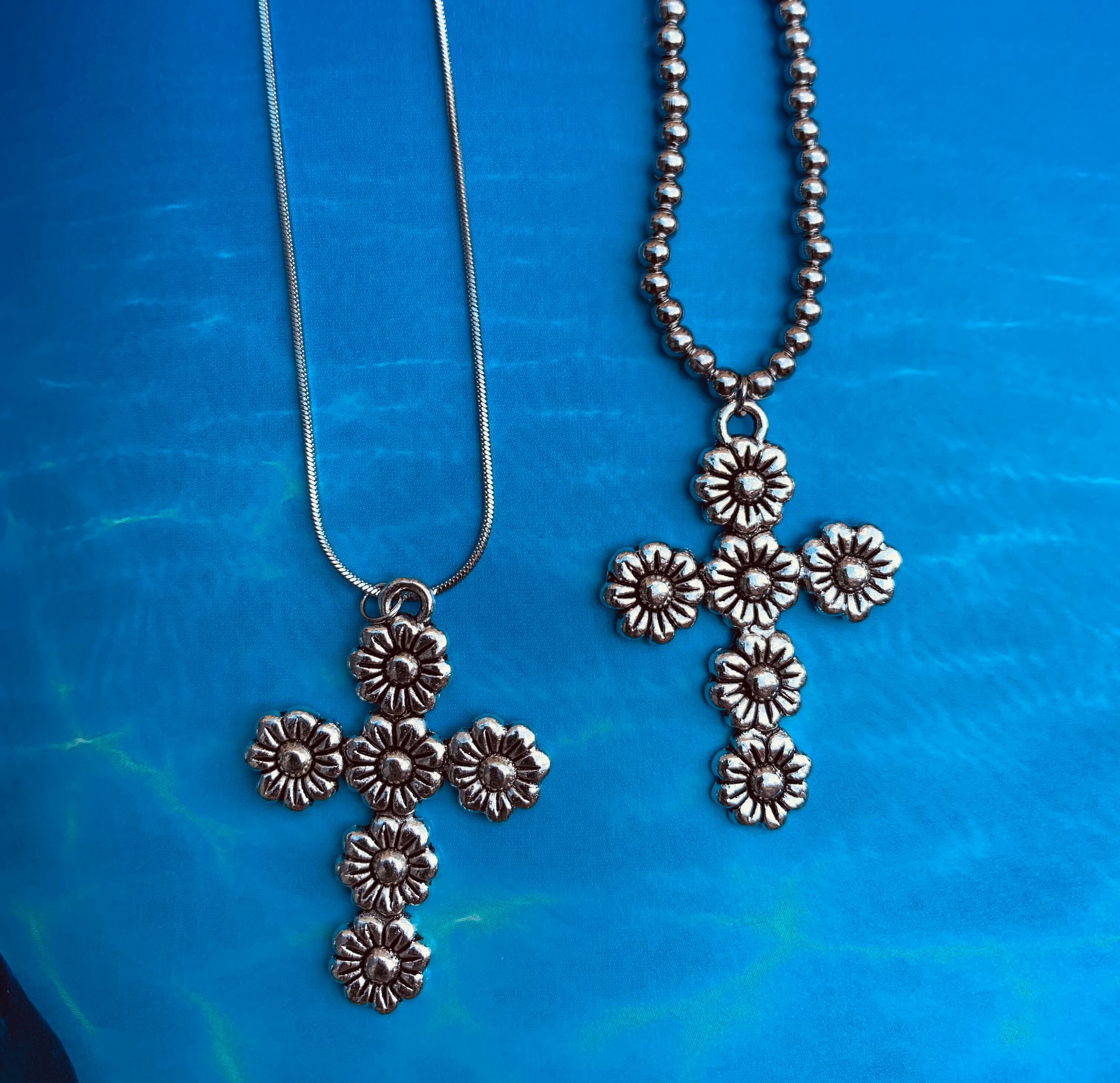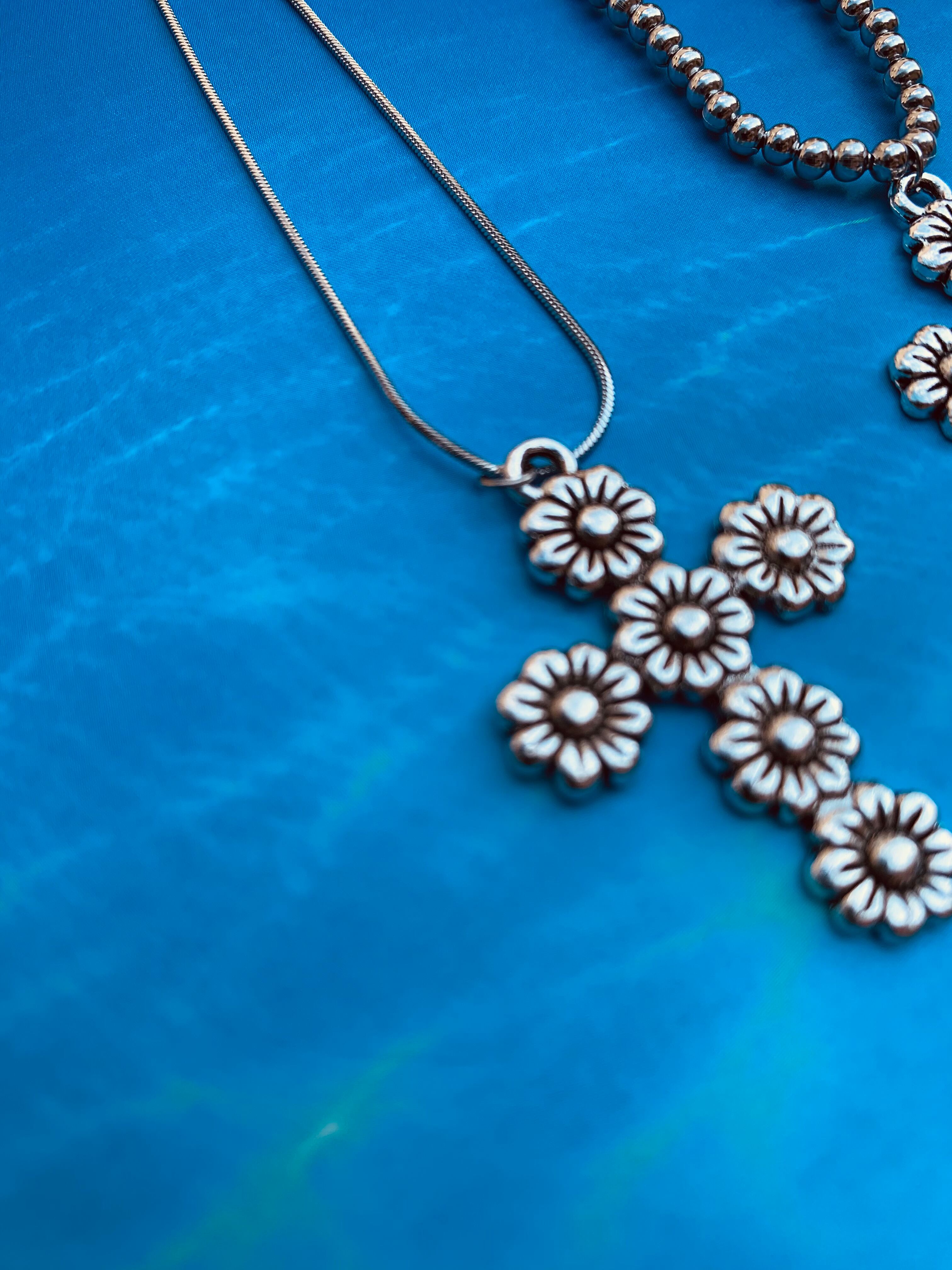 お花クロスのネックレスです。スネークチェーンと、ボールビーズのどちらかをお選び下さい。スネークチェーン、ボールビーズはステンレスを使用しているのでサビずにアレルギーにも安心な素材です。