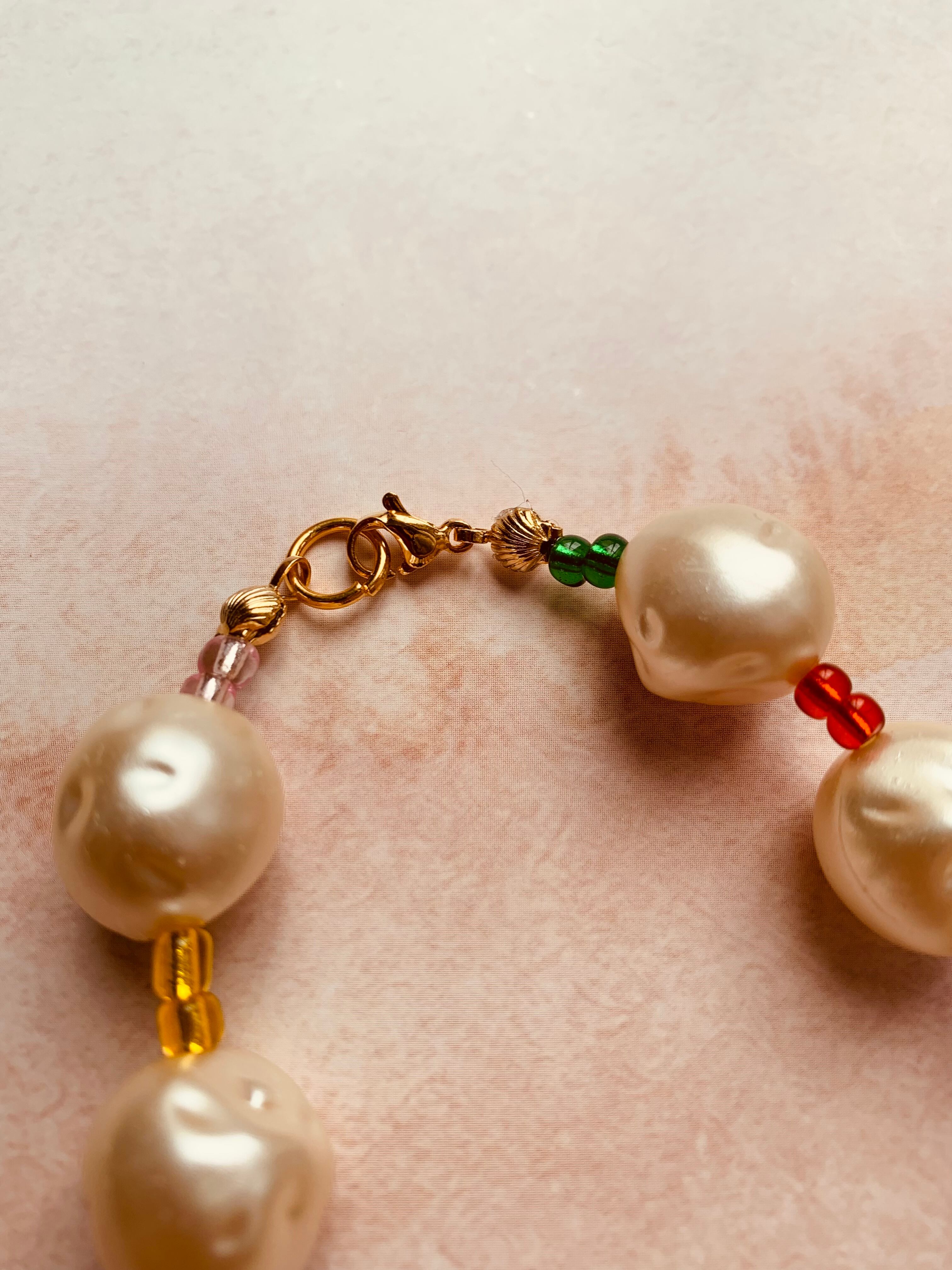 ビッグなパール調ビーズのネックレスです。留め具はシェルの形をしています。