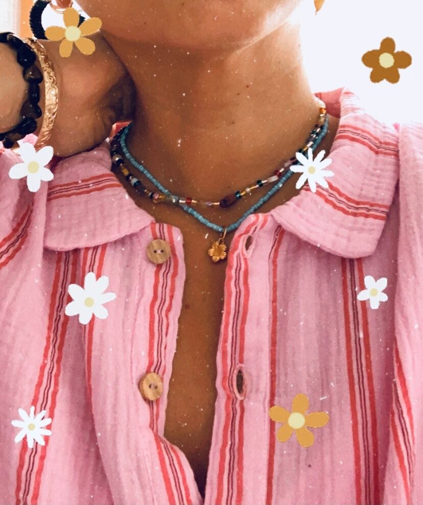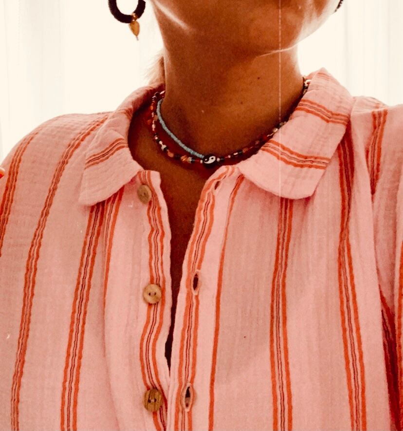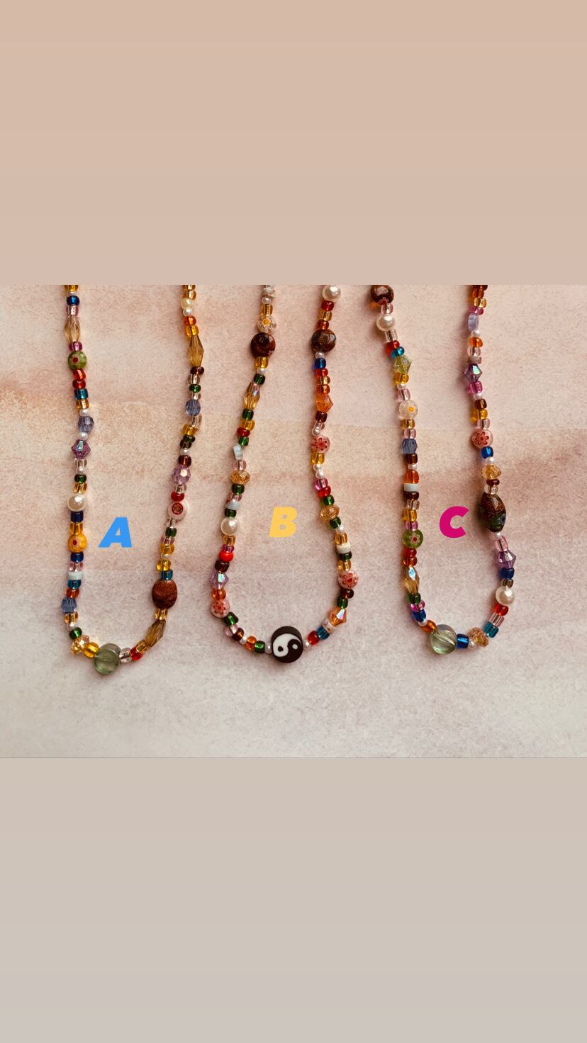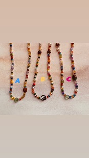 ビーズ、パール、ミッレフィオーリなどなどが付いたネックレスです。留め具はシェルの形をしています。A.B.Cからお選びください。