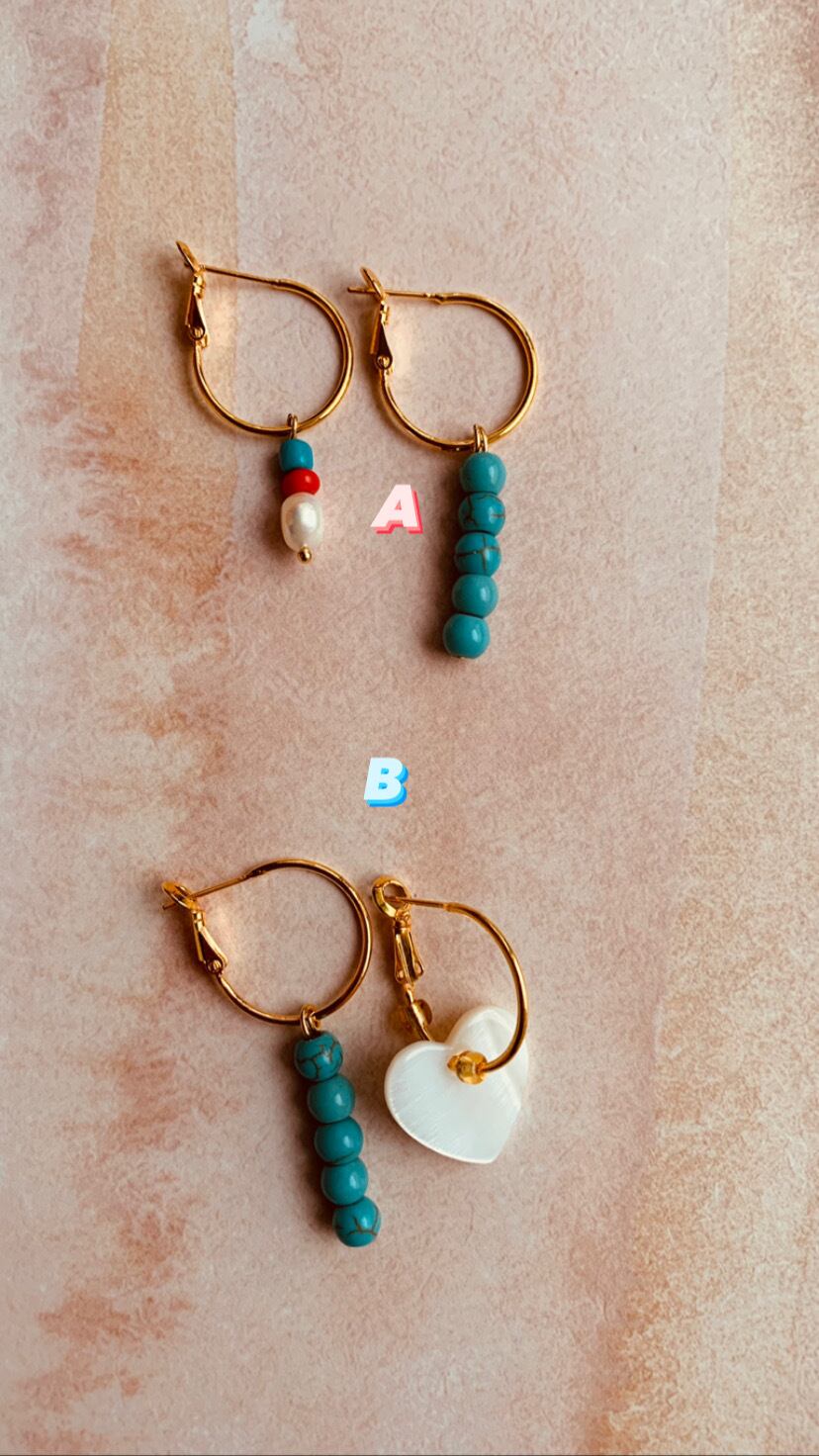 ターコイズと淡水パール、ターコイズとハートシェルのアシメなピアスです。