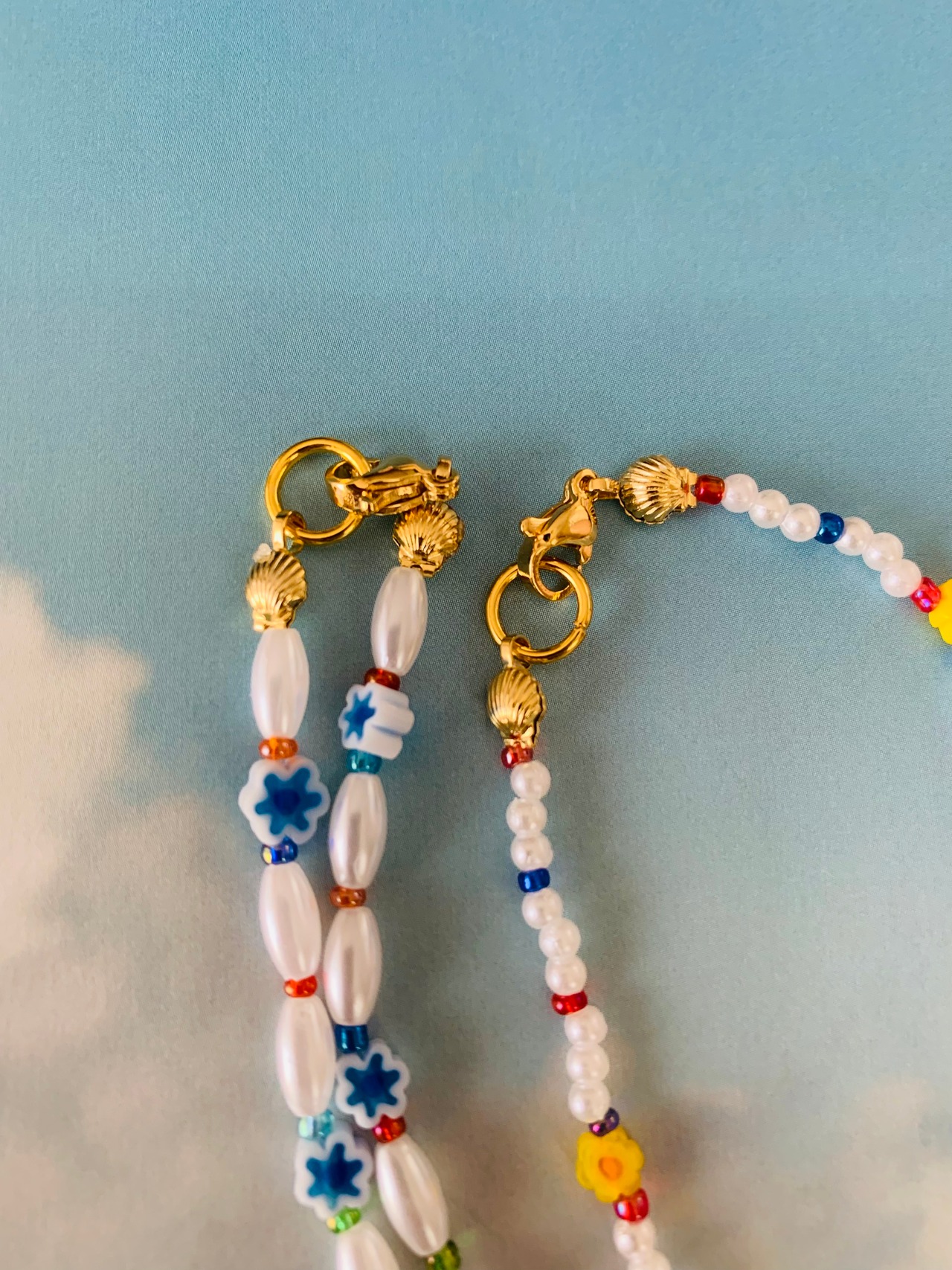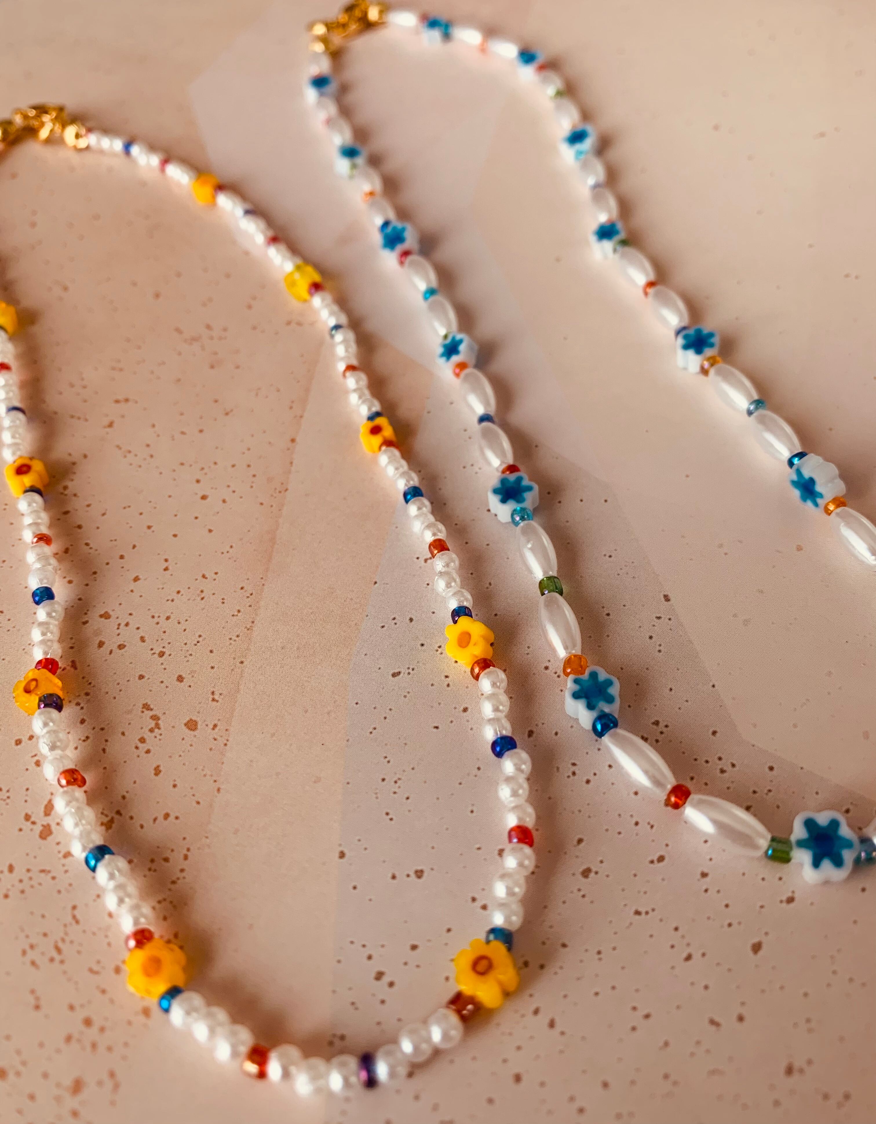 パールビーズとお花ビーズのネックレスです。長さは約38センチです。