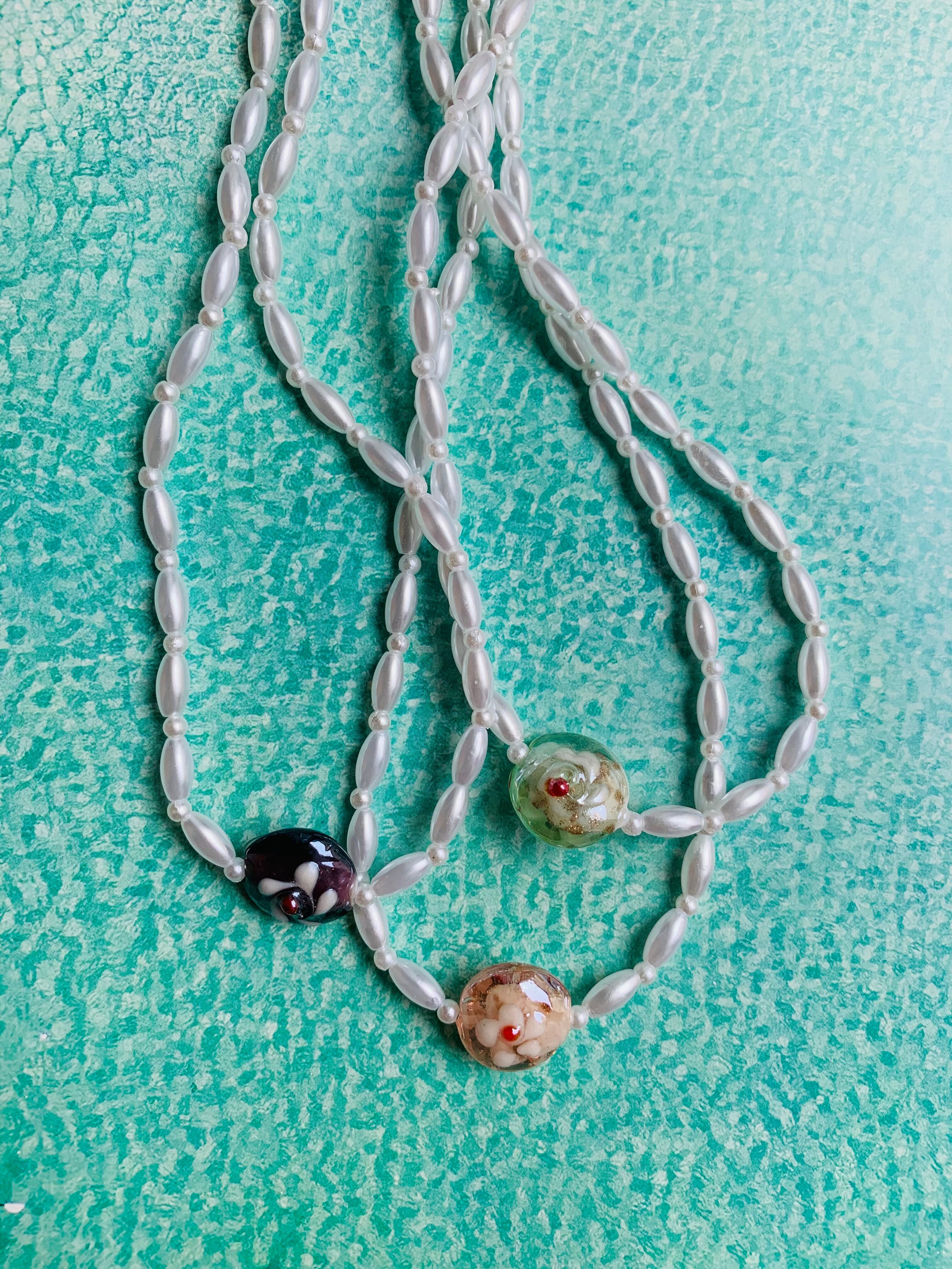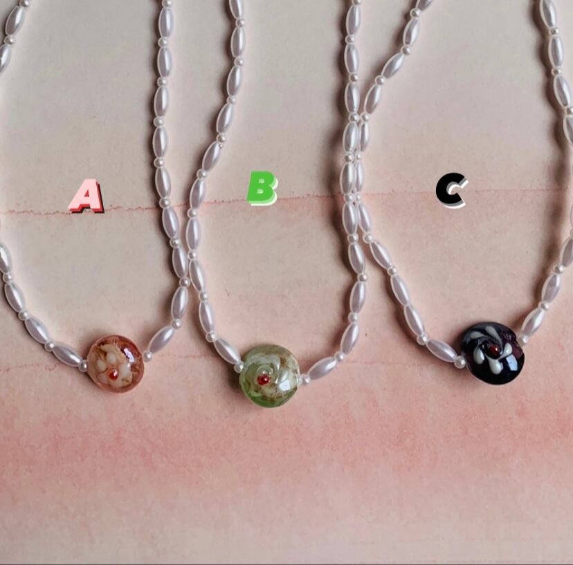 パールビーズにフラワーガラスがついたネックレスです。A.B.Cからお選びください。