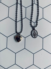 マリアとハートが付いたネックレスです。ネックレスはステンレスを使用しているのでサビずにアレルギーにも安心な素材です。