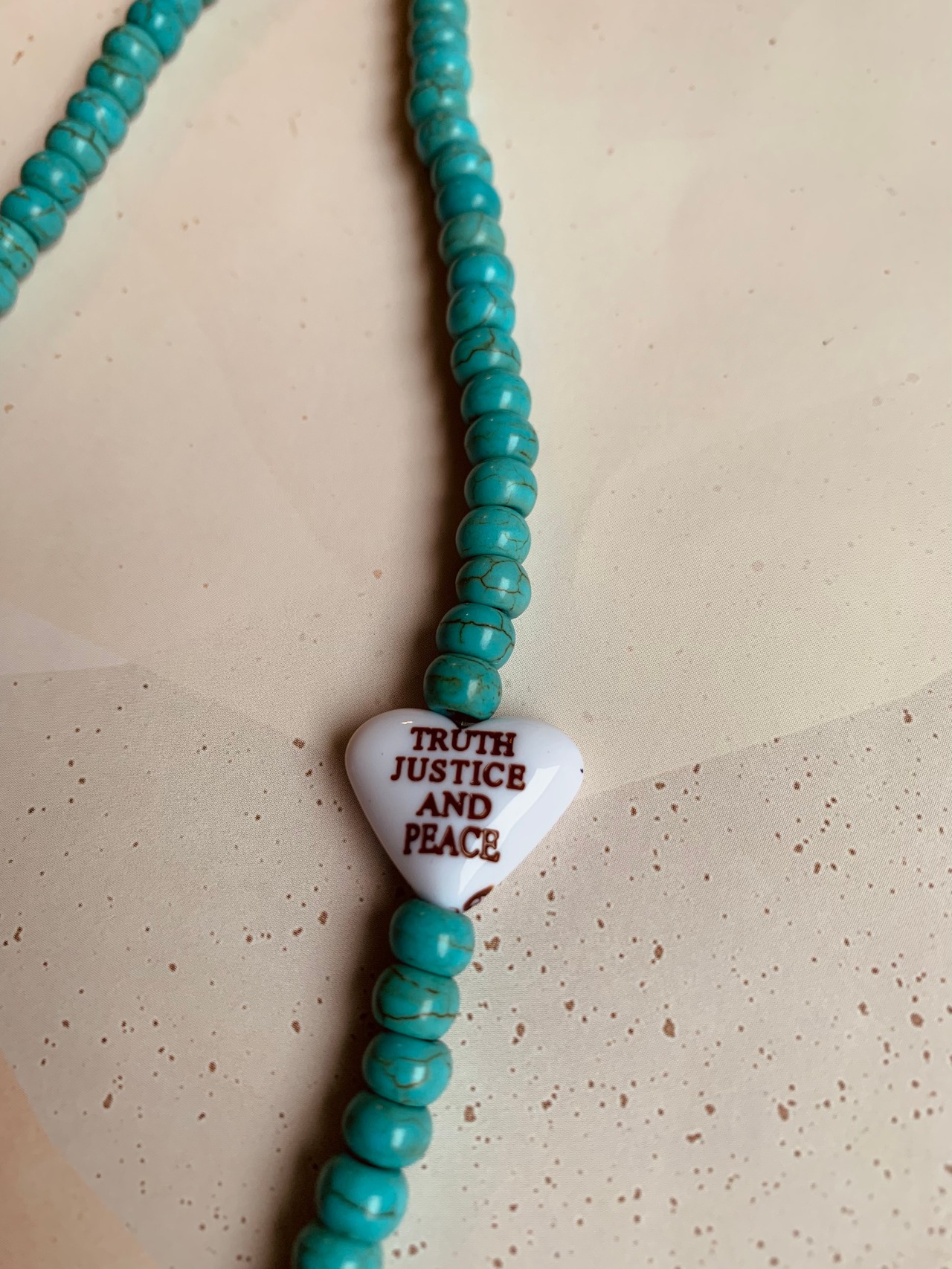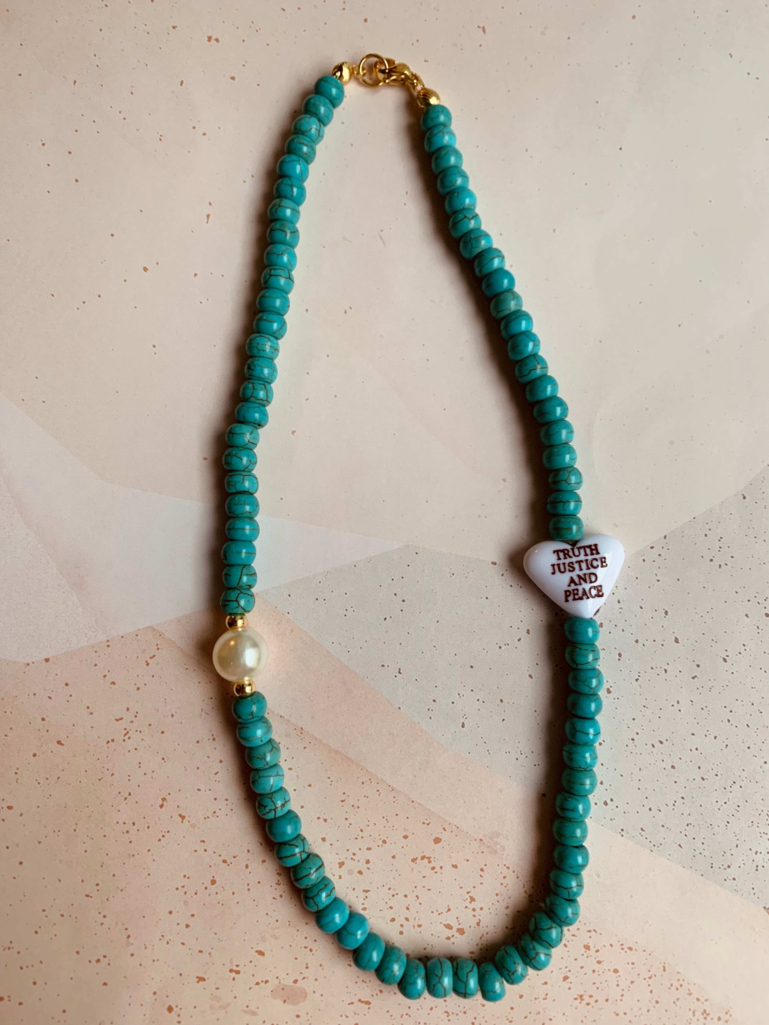 ターコイズのネックレスなパールとメッセージ入りのガラスハートがついたネックレスです。
