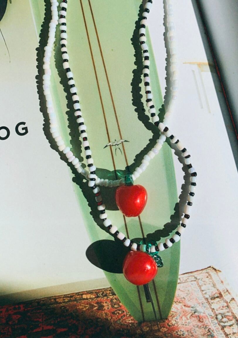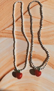 アップルがついたビーズネックレスです。留め具を使わずゴムテグスを使用しているのでアレルギーにも安心です。A.Bからお選びください。