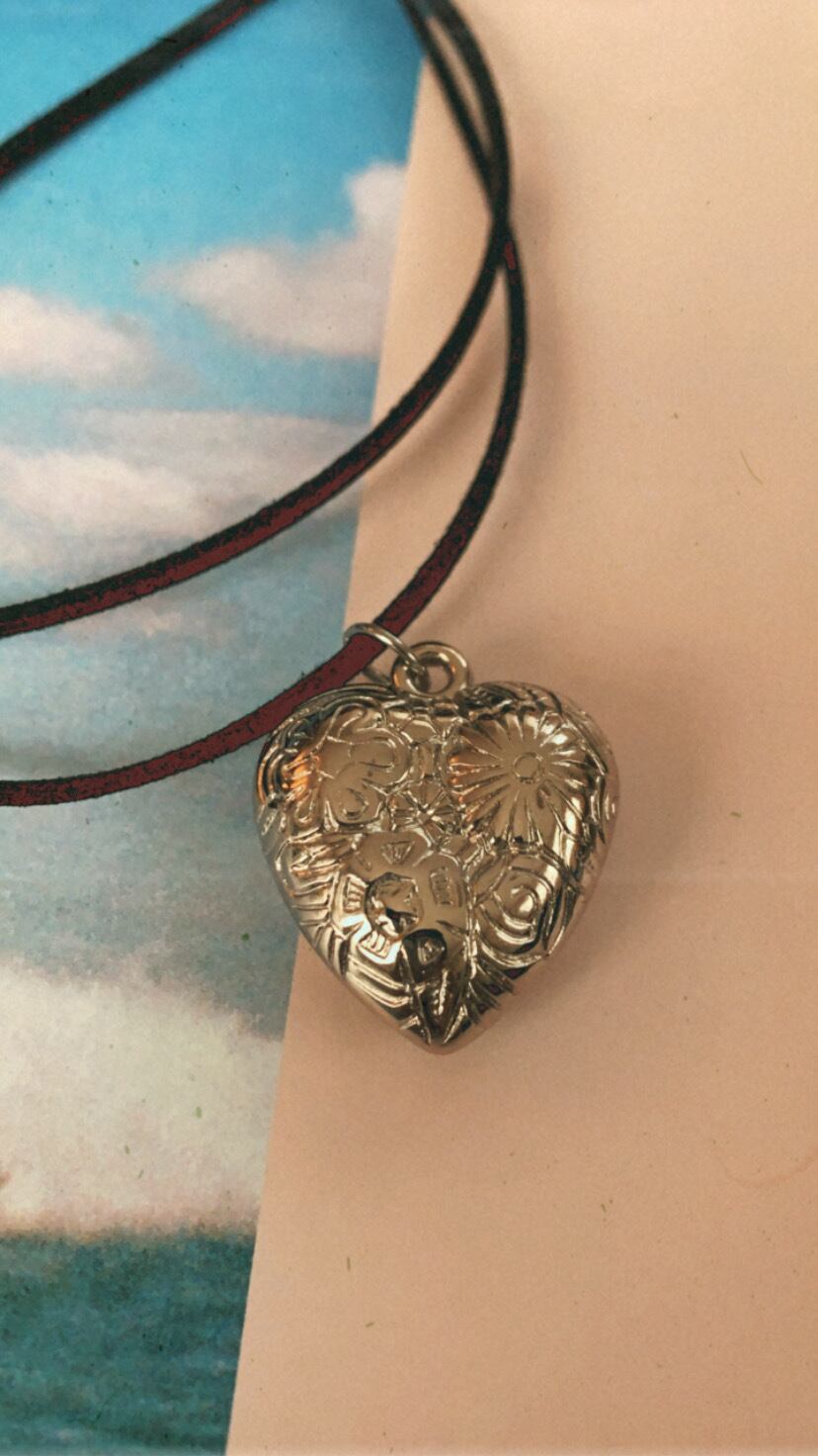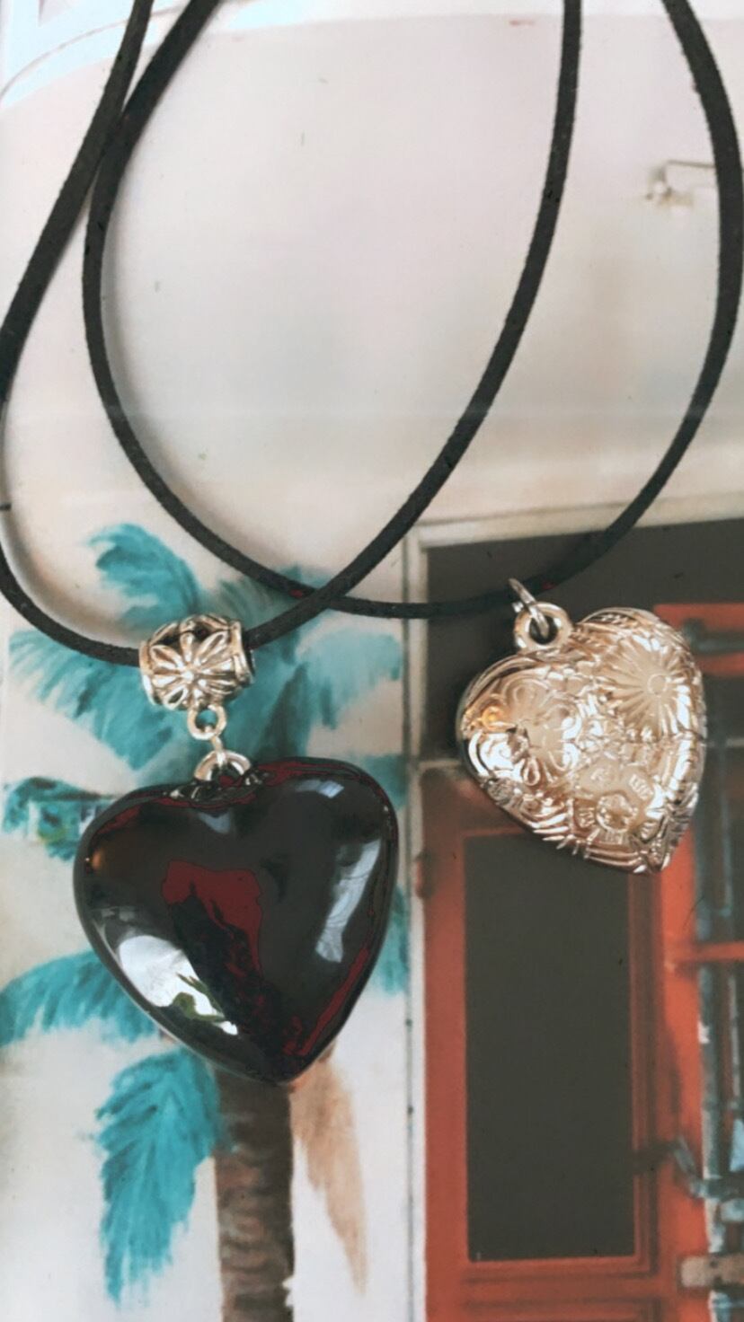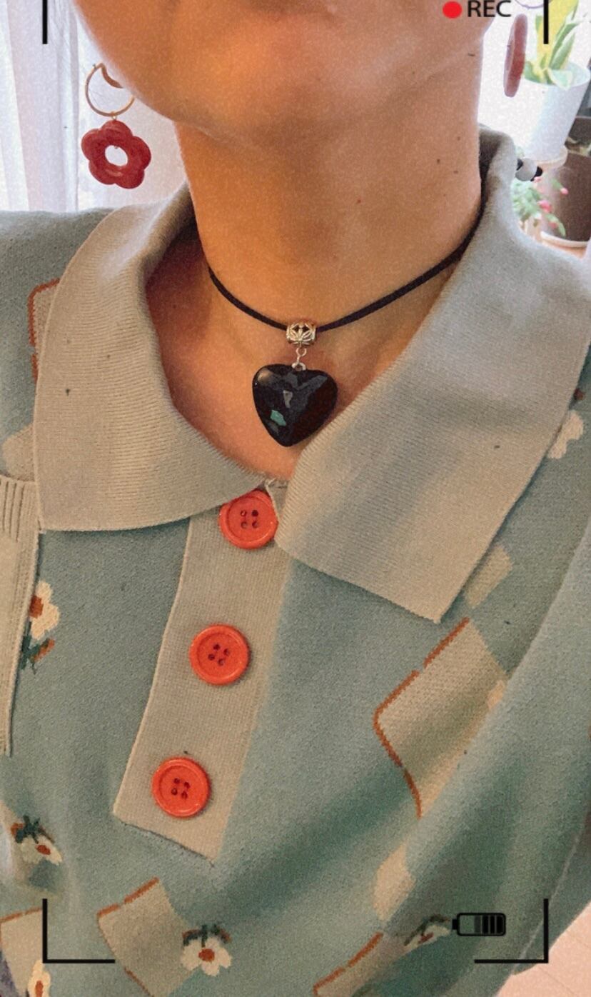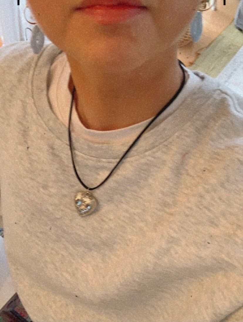 大きめなハートをスエードヒモでネックレスにしました。後ろで結ぶタイプなので好きな長さにできます。