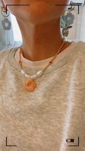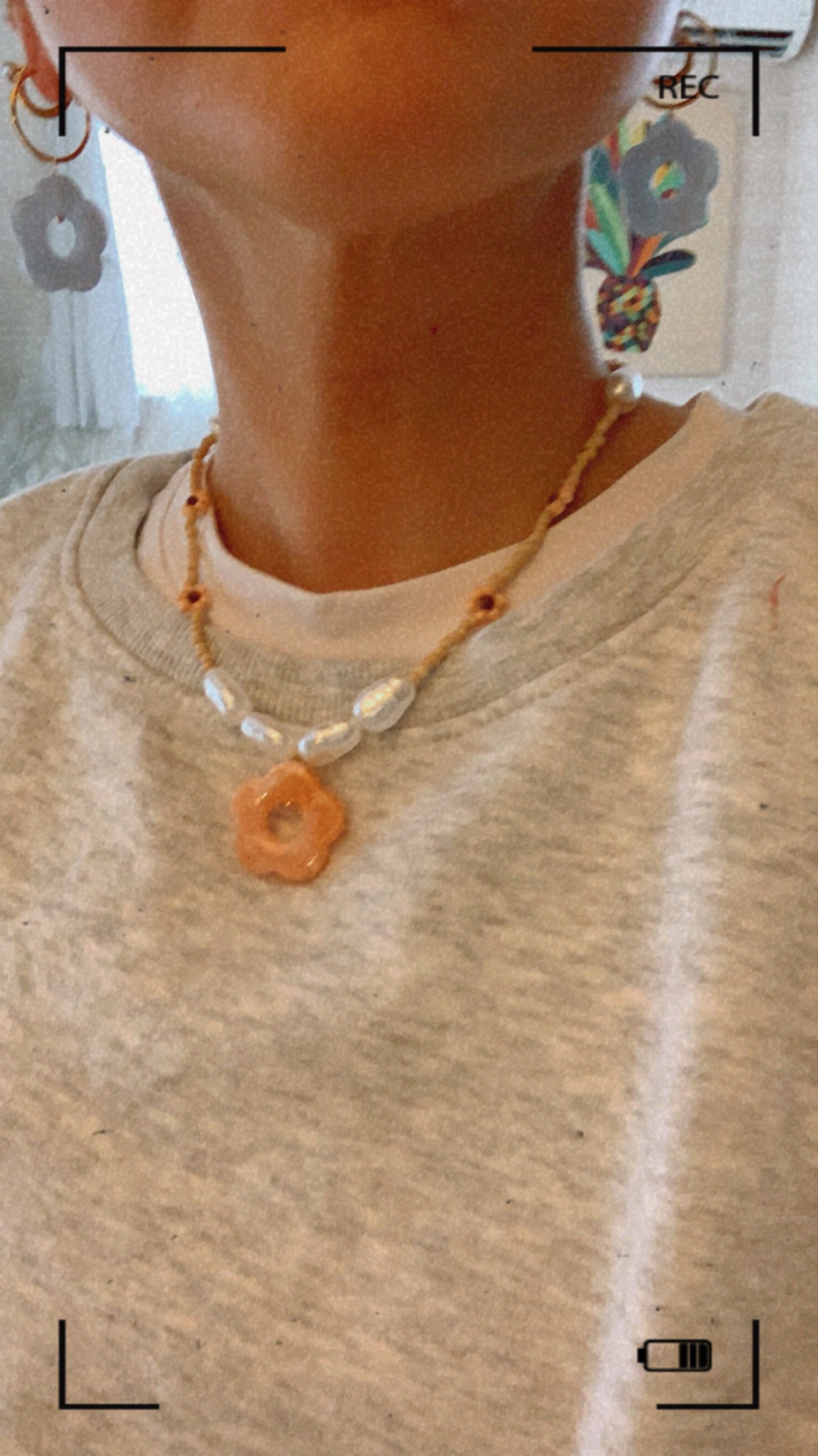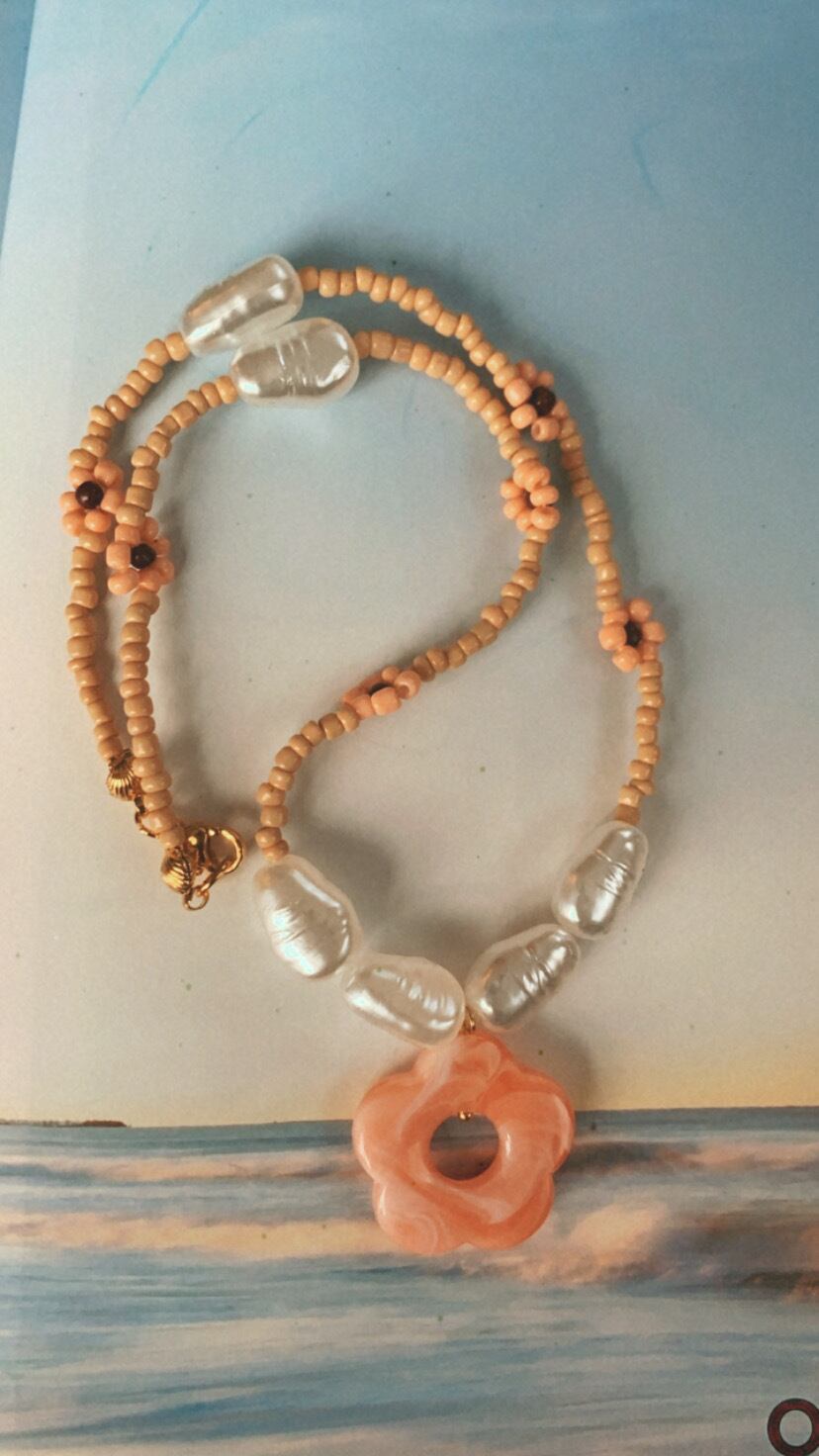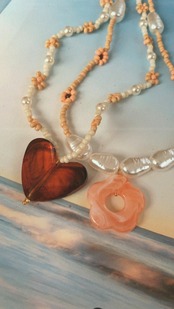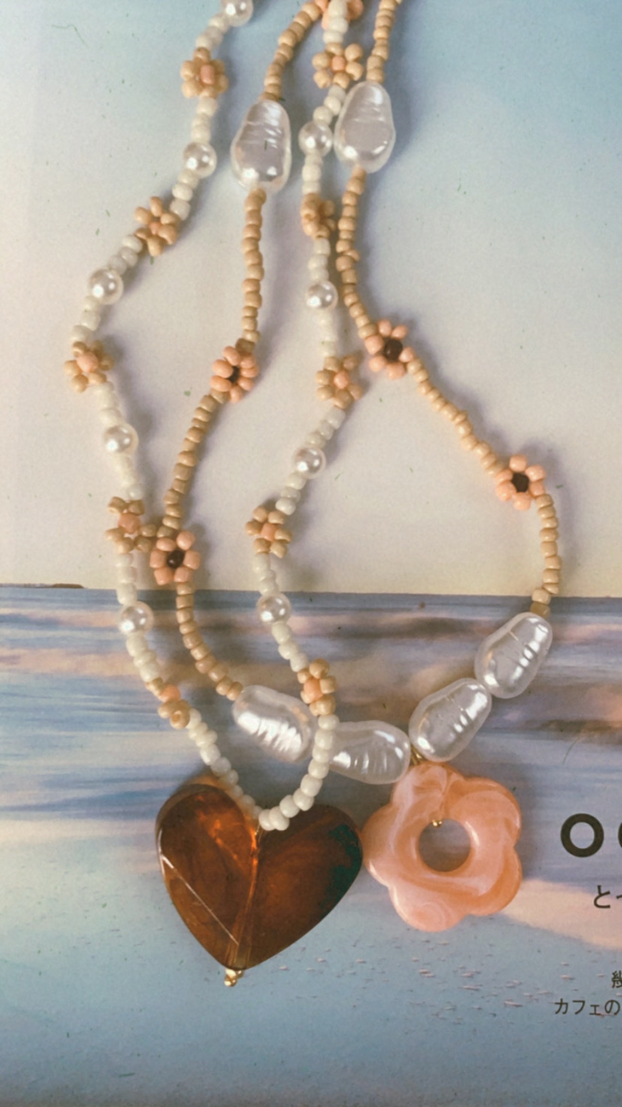 パールビーズのフラワーネックレスにハートチャームとフラワーチャームがついています。