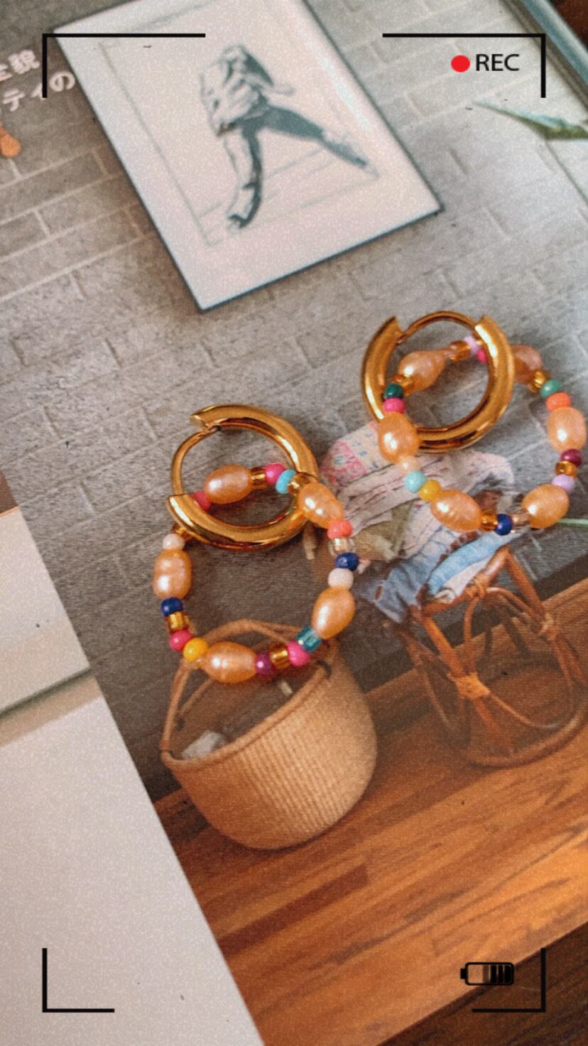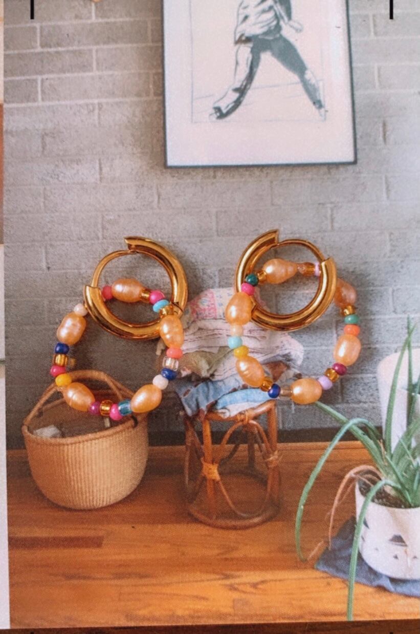 ライス型のサーモンピンクの淡水パールとビーズでできたフープピアスです。ピアスはステンレスを使用しているのでサビずにアレルギーにも安心な素材です。