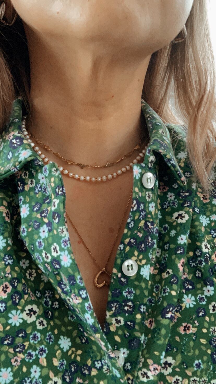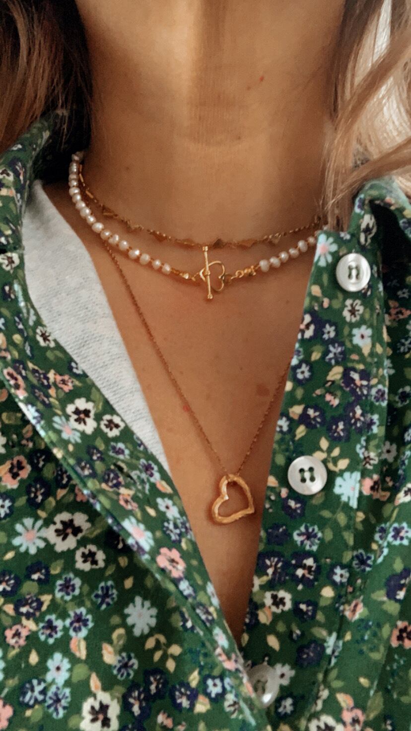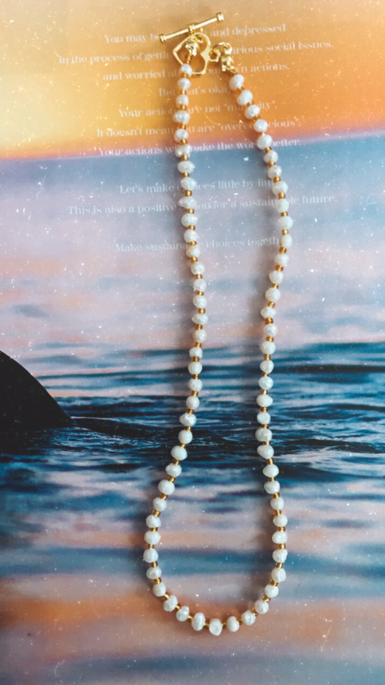 ライス型淡水パールとビーズのネックレスです。留め具がハートなのでそちらを前に持ってきても可愛いです。