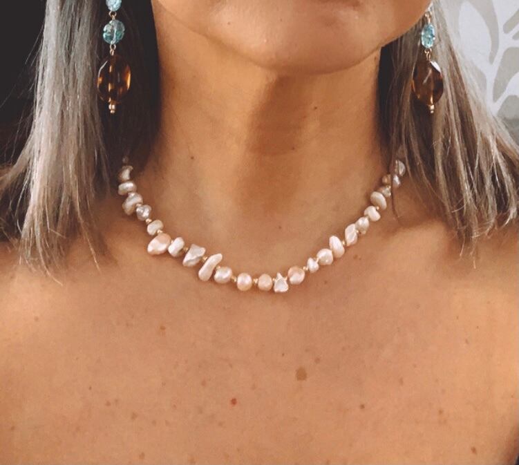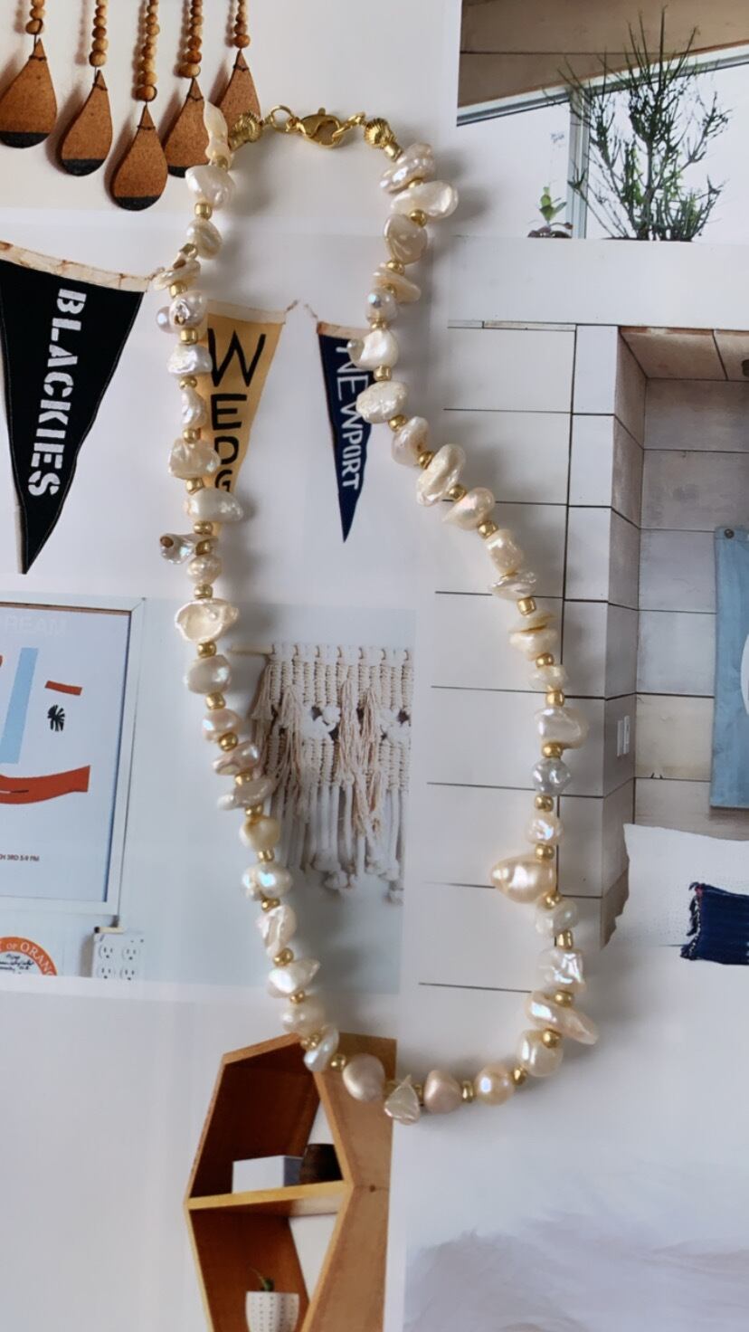 色々な形の淡水パールとゴールドビーズのネックレスです。