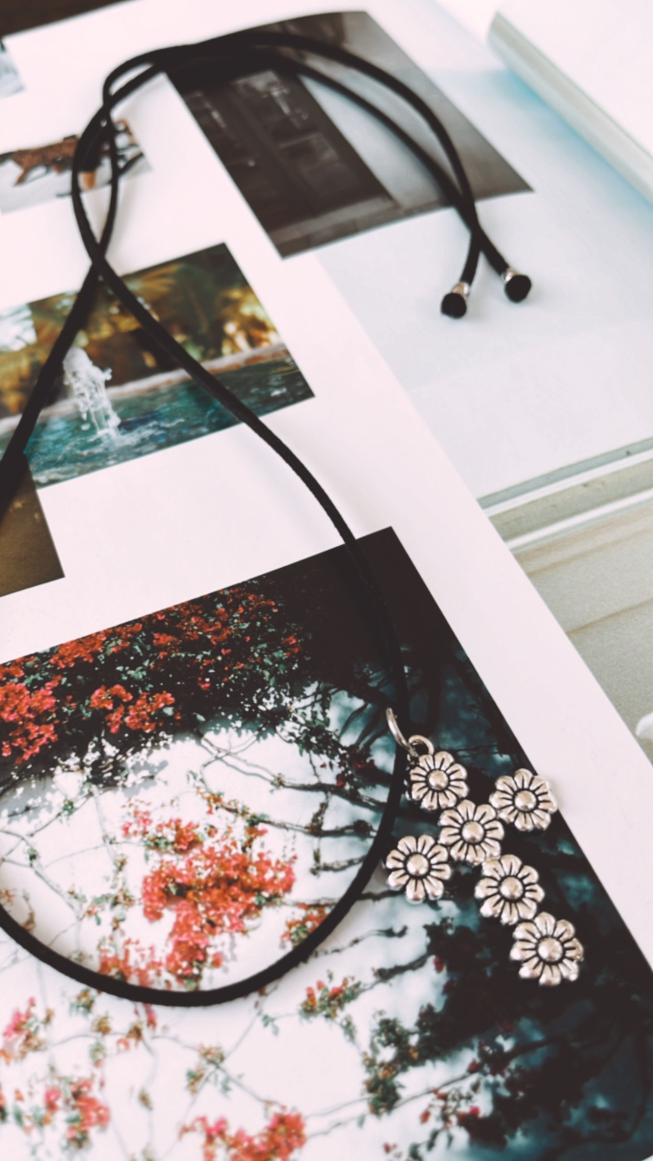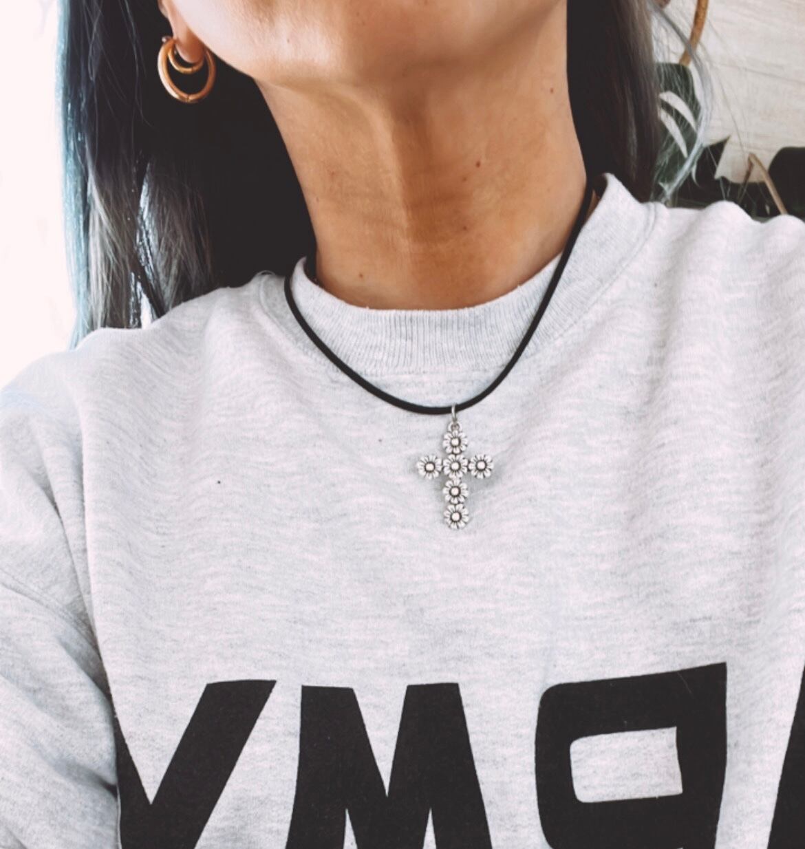 スエード紐にお花のクロスが付いたチョーカーネックレスです。紐なのでお好きな長さでつけていただけます!