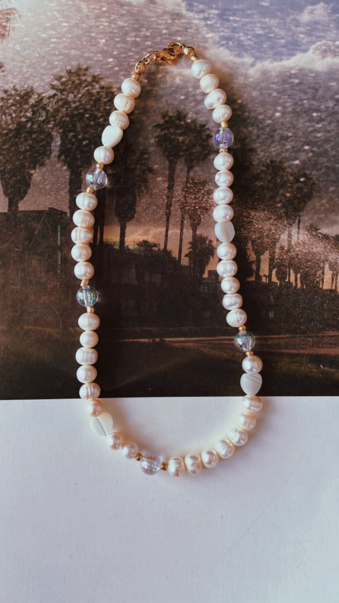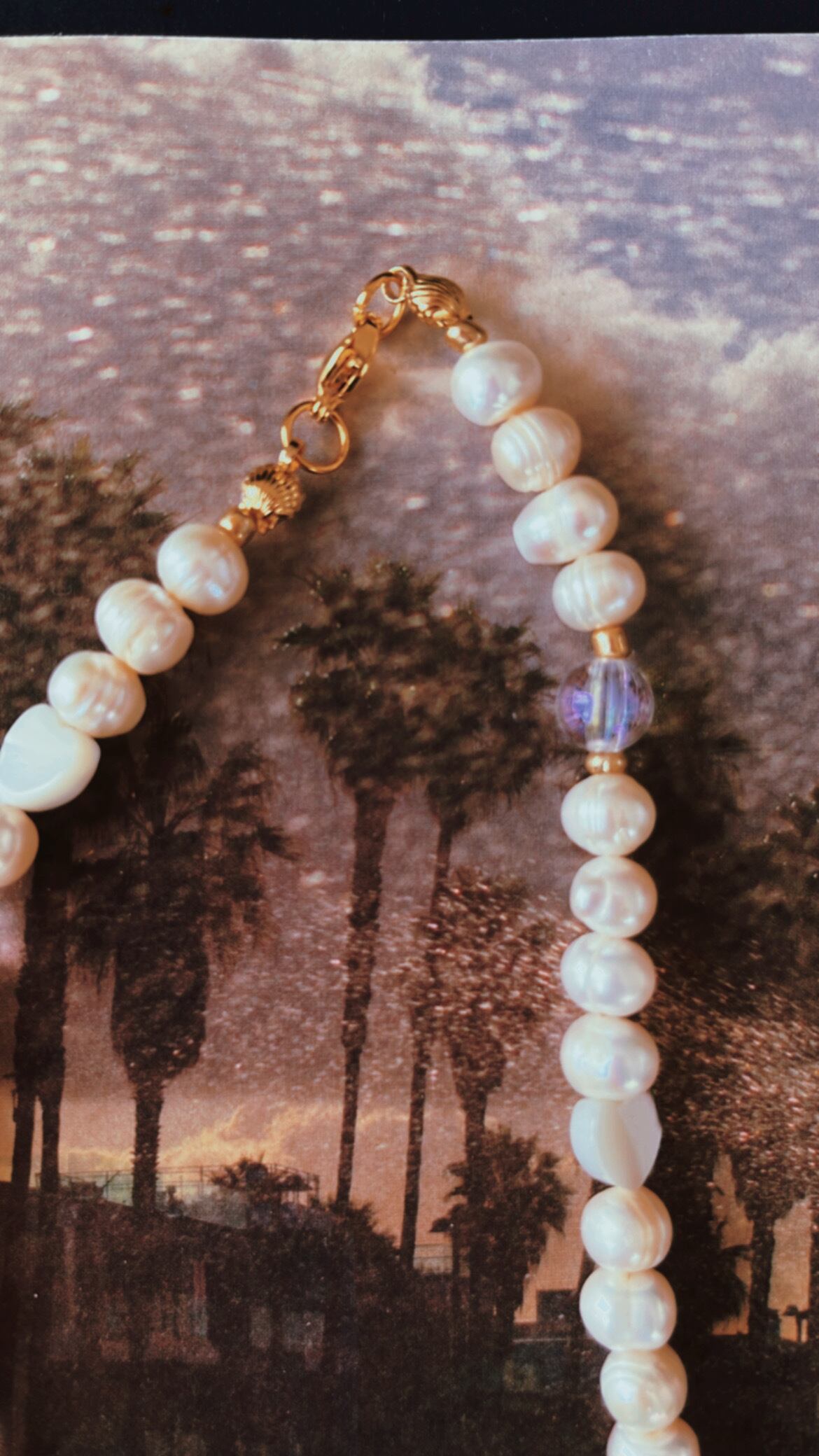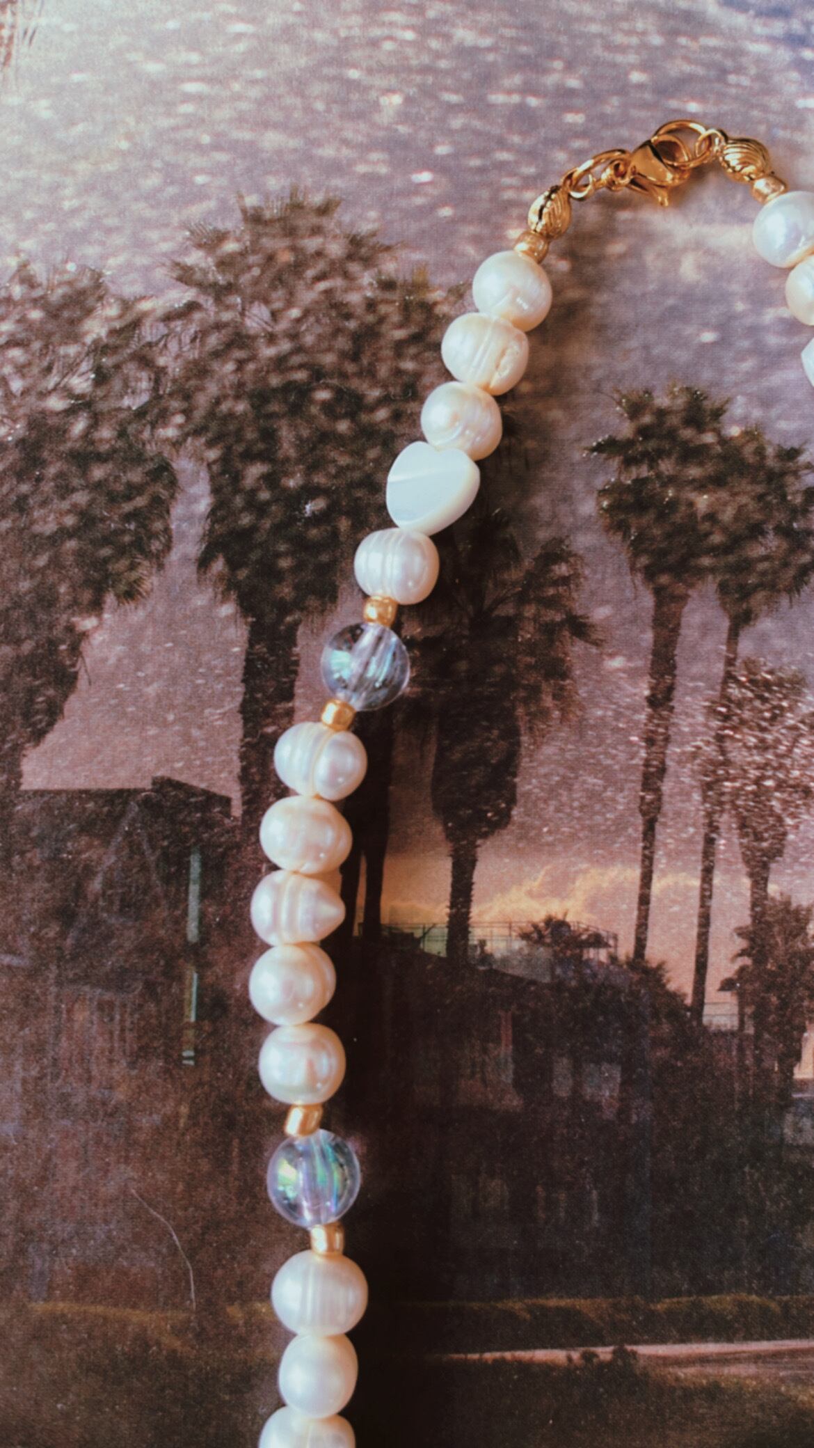 淡水パールとハートシェル、クリアなボールのネックレスです。長さは約38センチです。