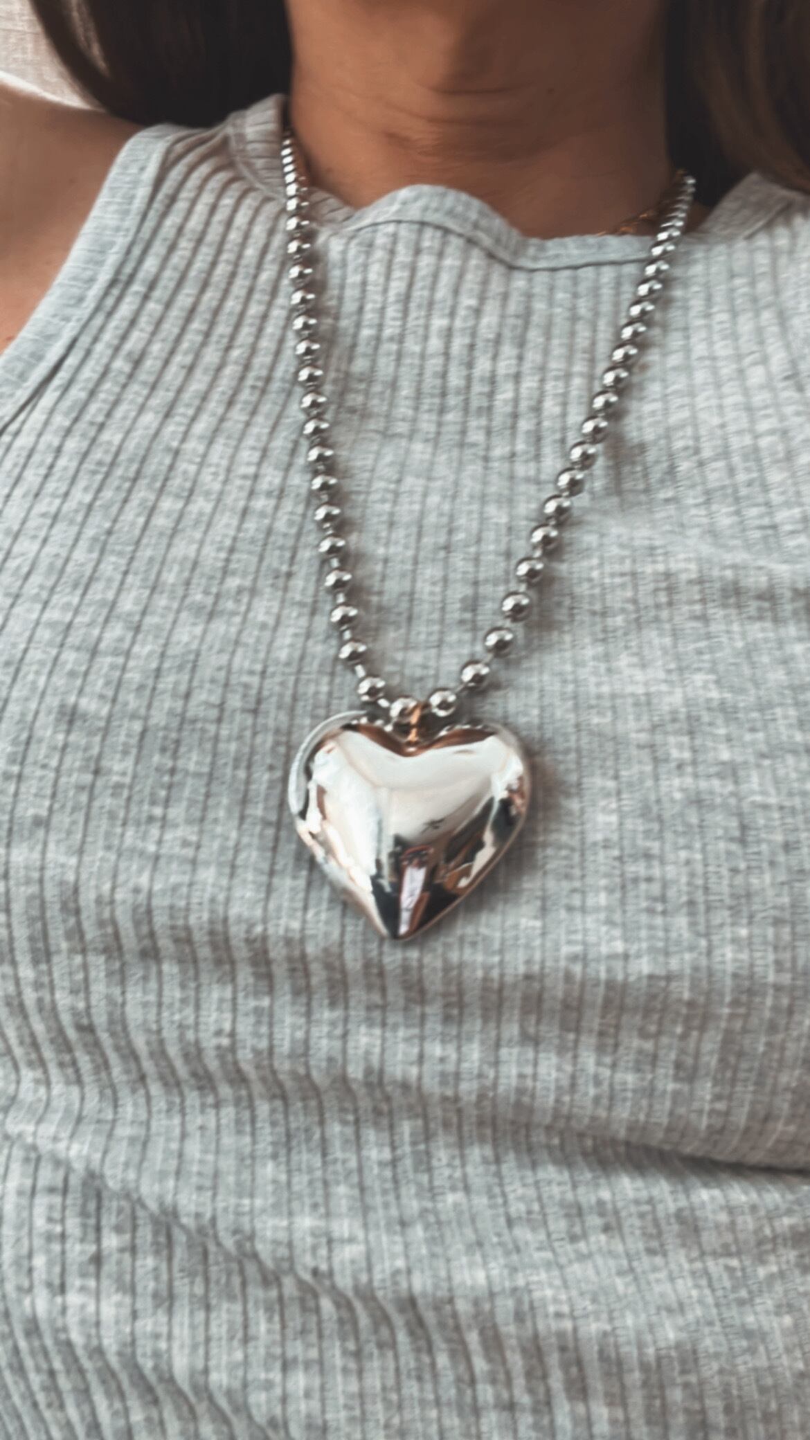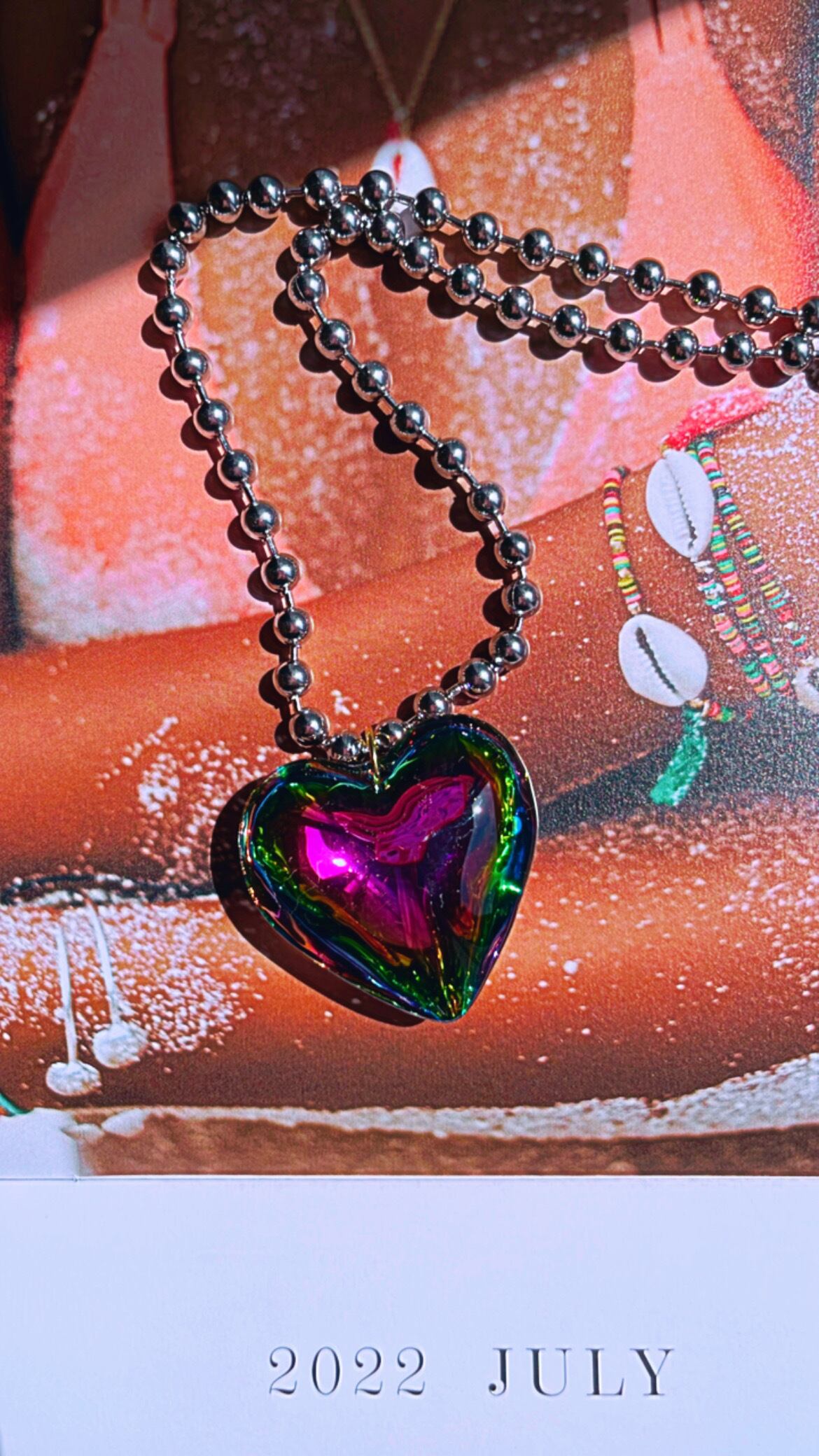 オーロラカラー、シルバーカラーの両面でお楽しみいただけるガラスハートのボールチェーンネックレスです。