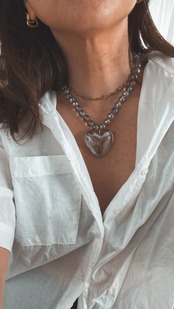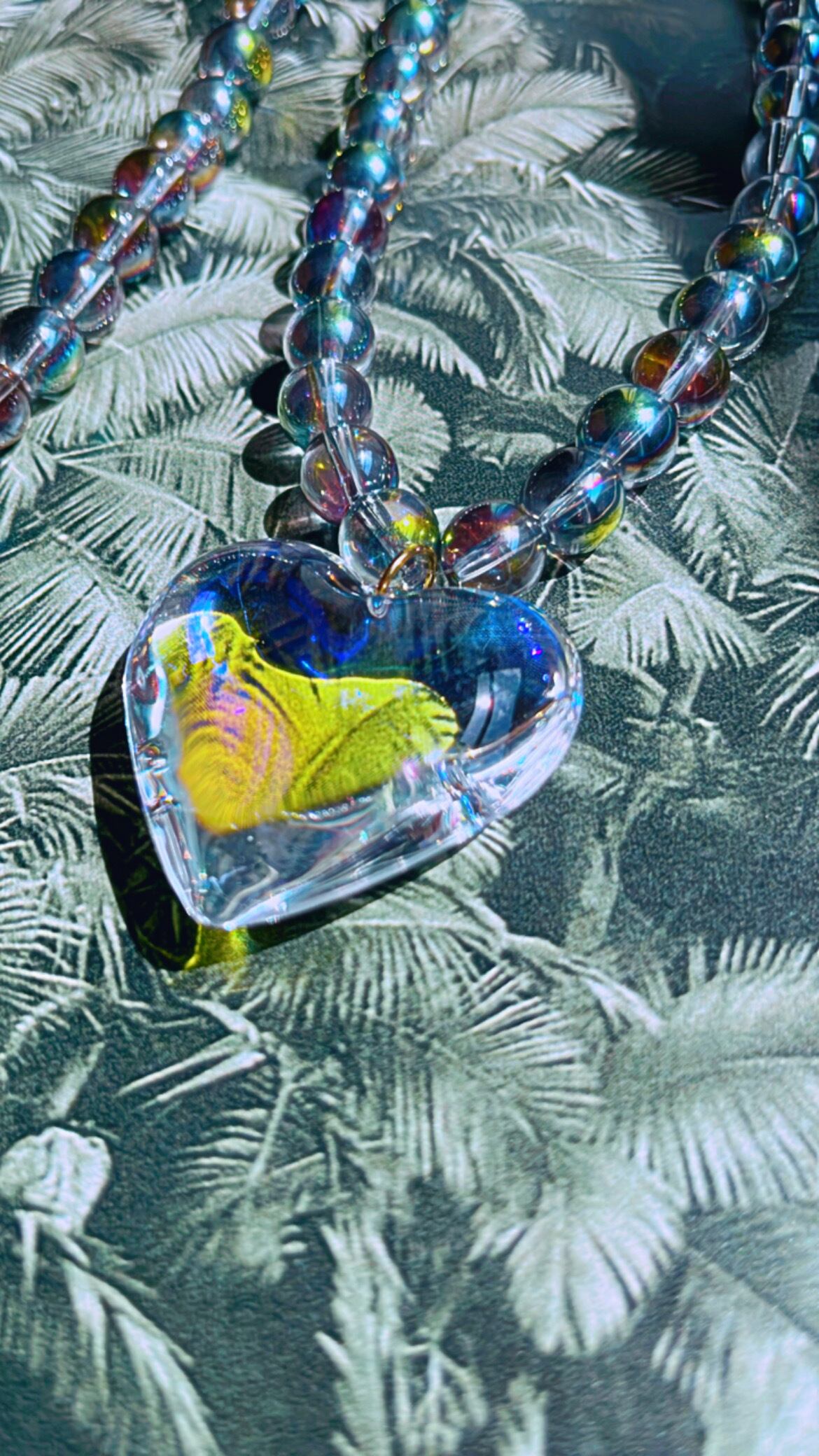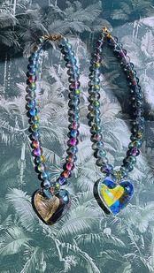 オーロラカラー、クリアブラックのハートがついたガラスネックレスです。ボールネックレスもオーロラに輝くガラスです。