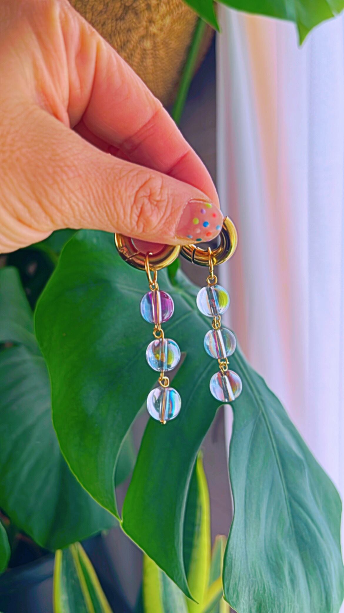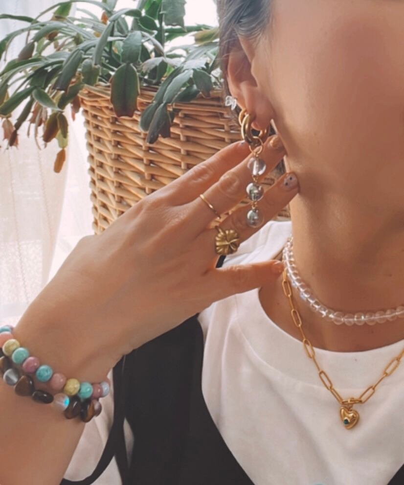 レインボーに輝くガラスでできたボールのフープピアスです。存在感抜群です!ピアスはステンレスを使用しているのでサビずにアレルギーにも安心な素材です。