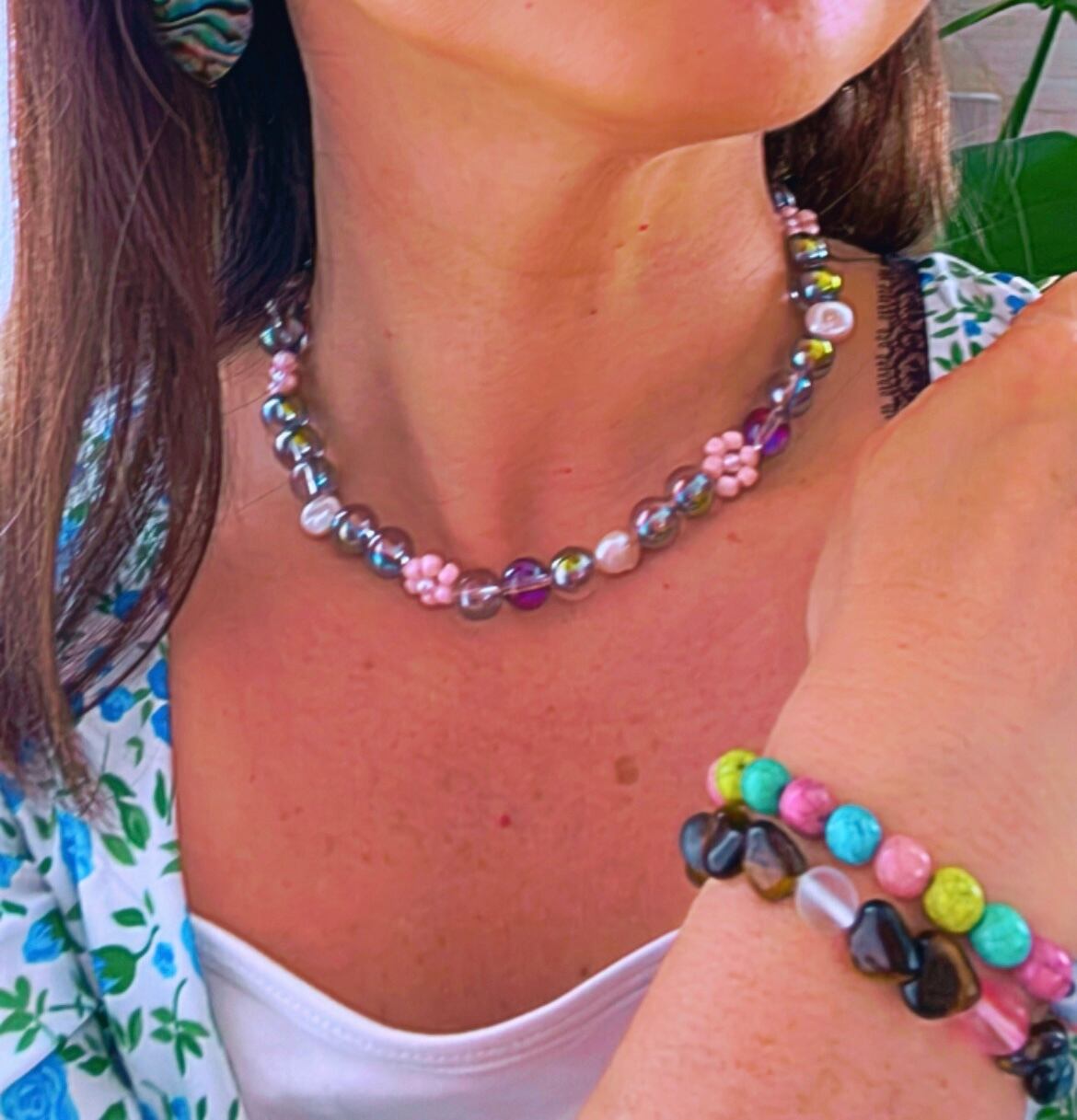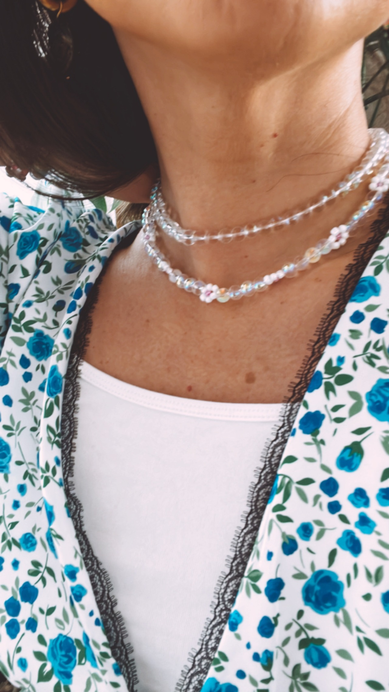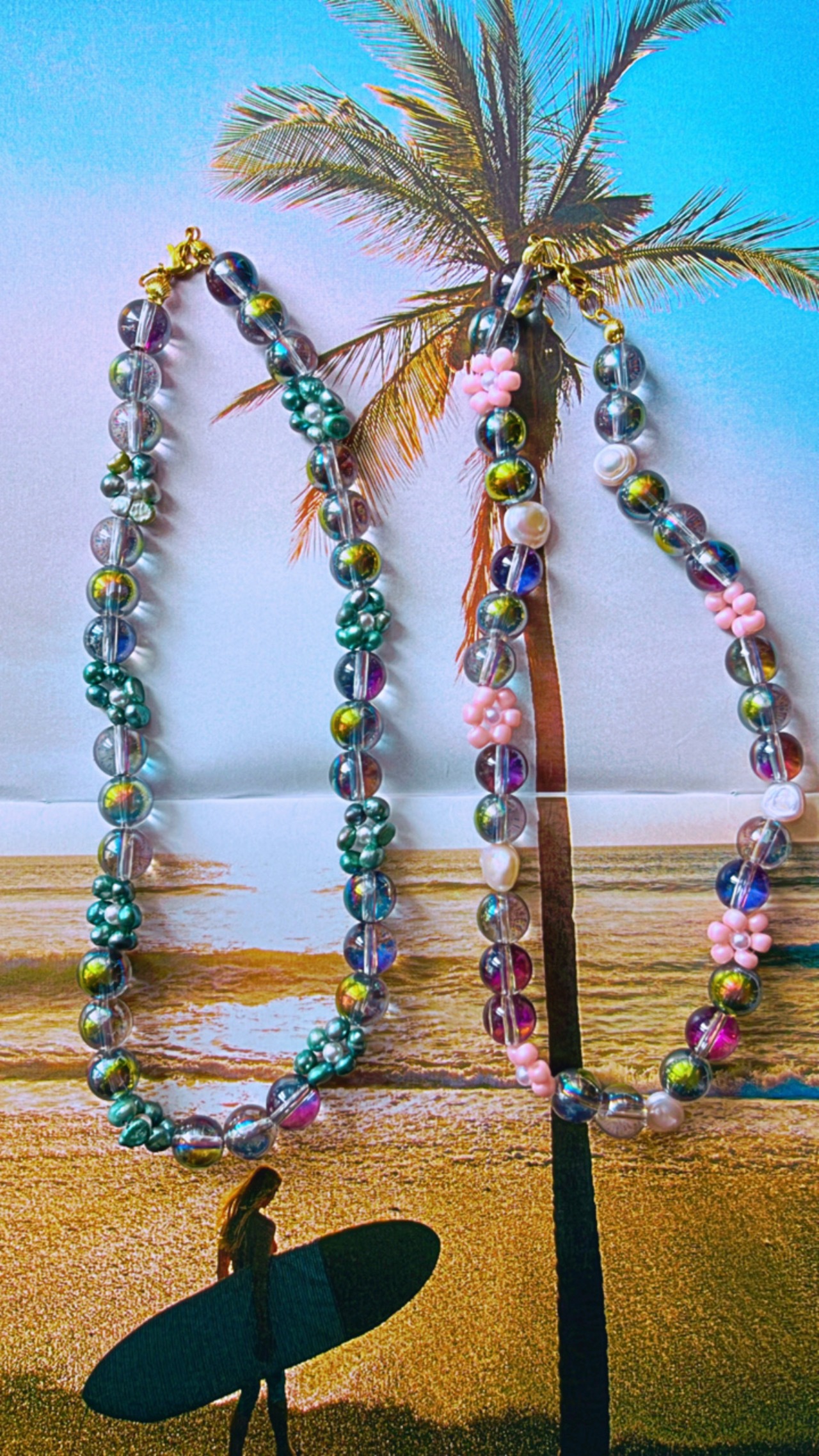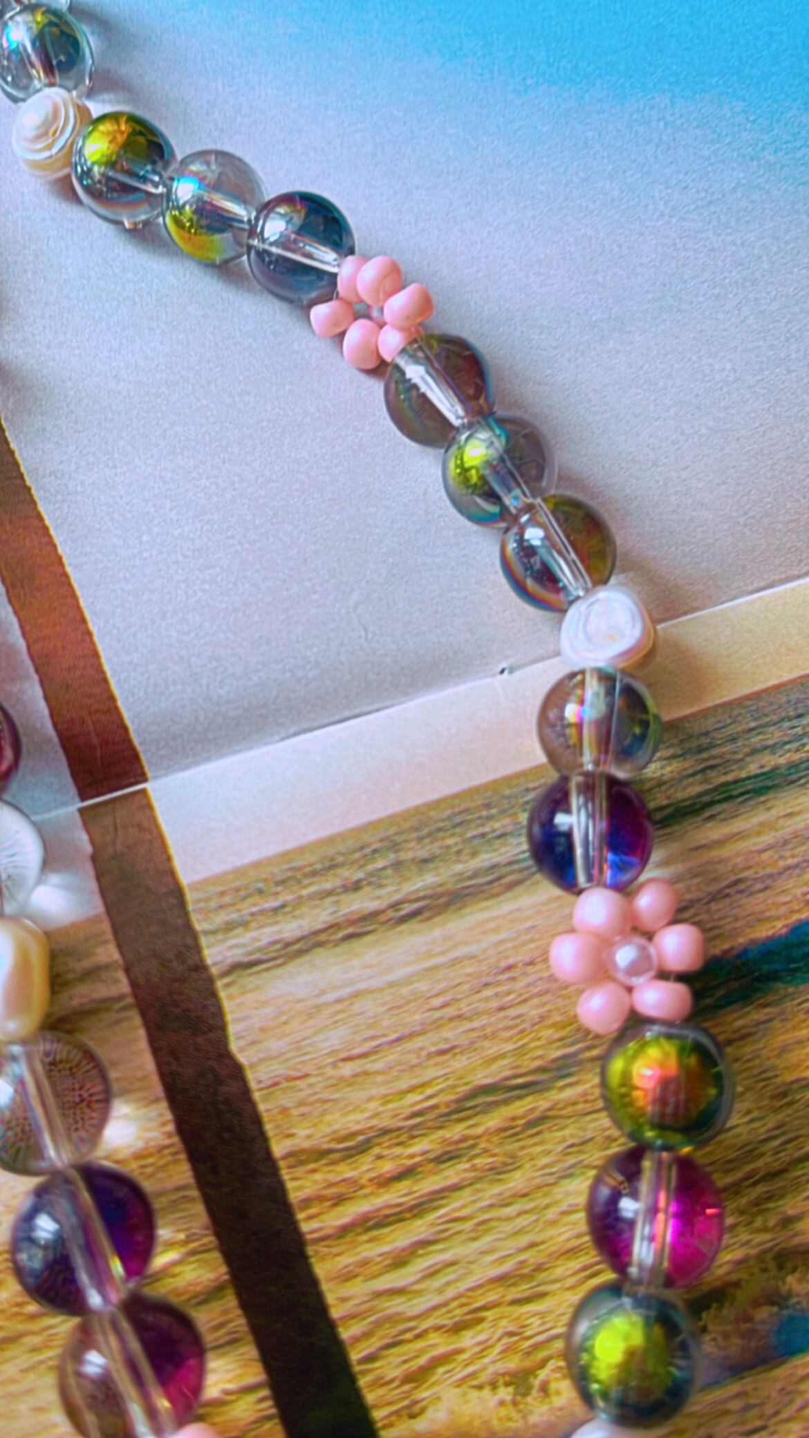 オーロラカラーのガラス、レインボーカラーのガラスとパール、ビーズでできたフラワーネックレスです。A.Bからお選びください。