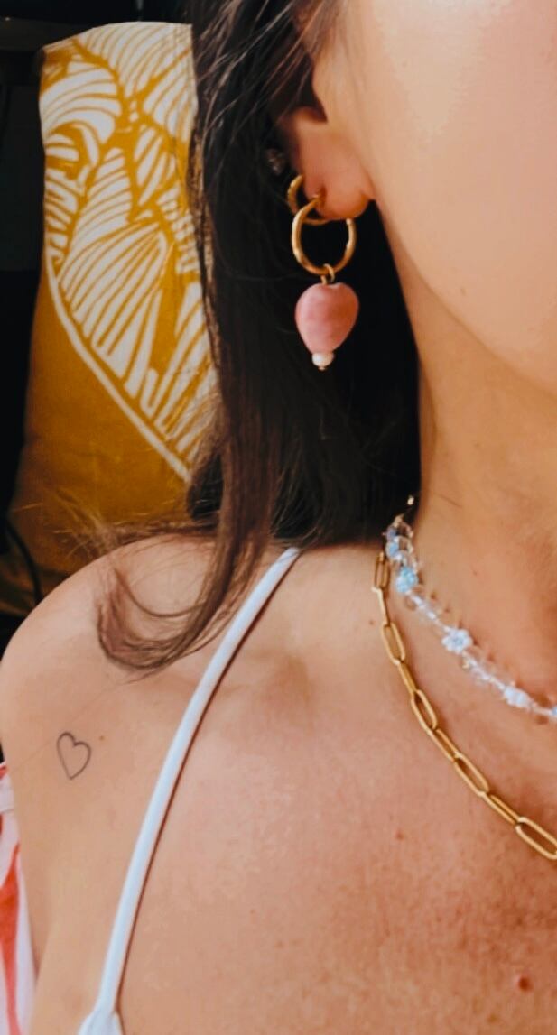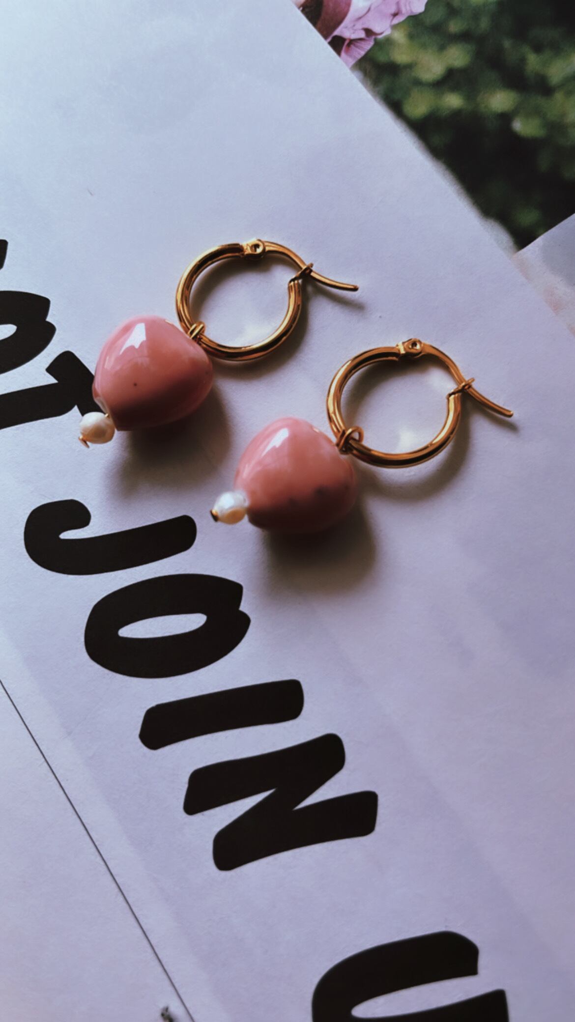 陶器でできたピンクのハートと淡水パールのフープピアスです。ピアスはステンレスを使用しているのでサビずにアレルギーにも安心な素材です。