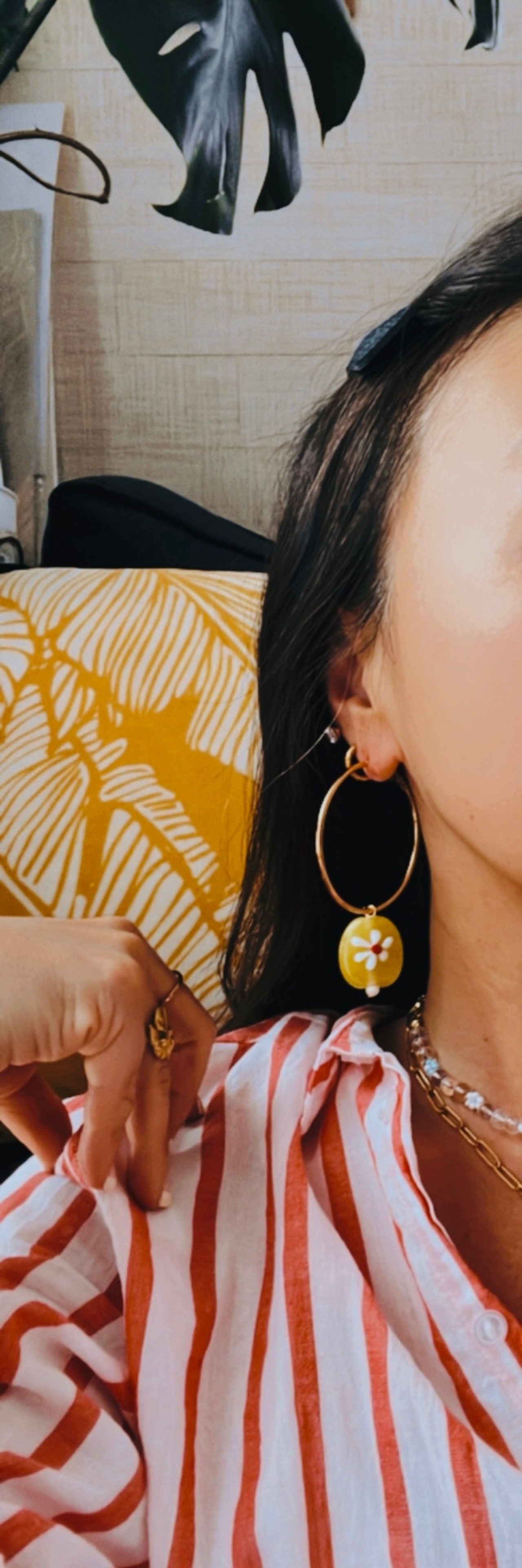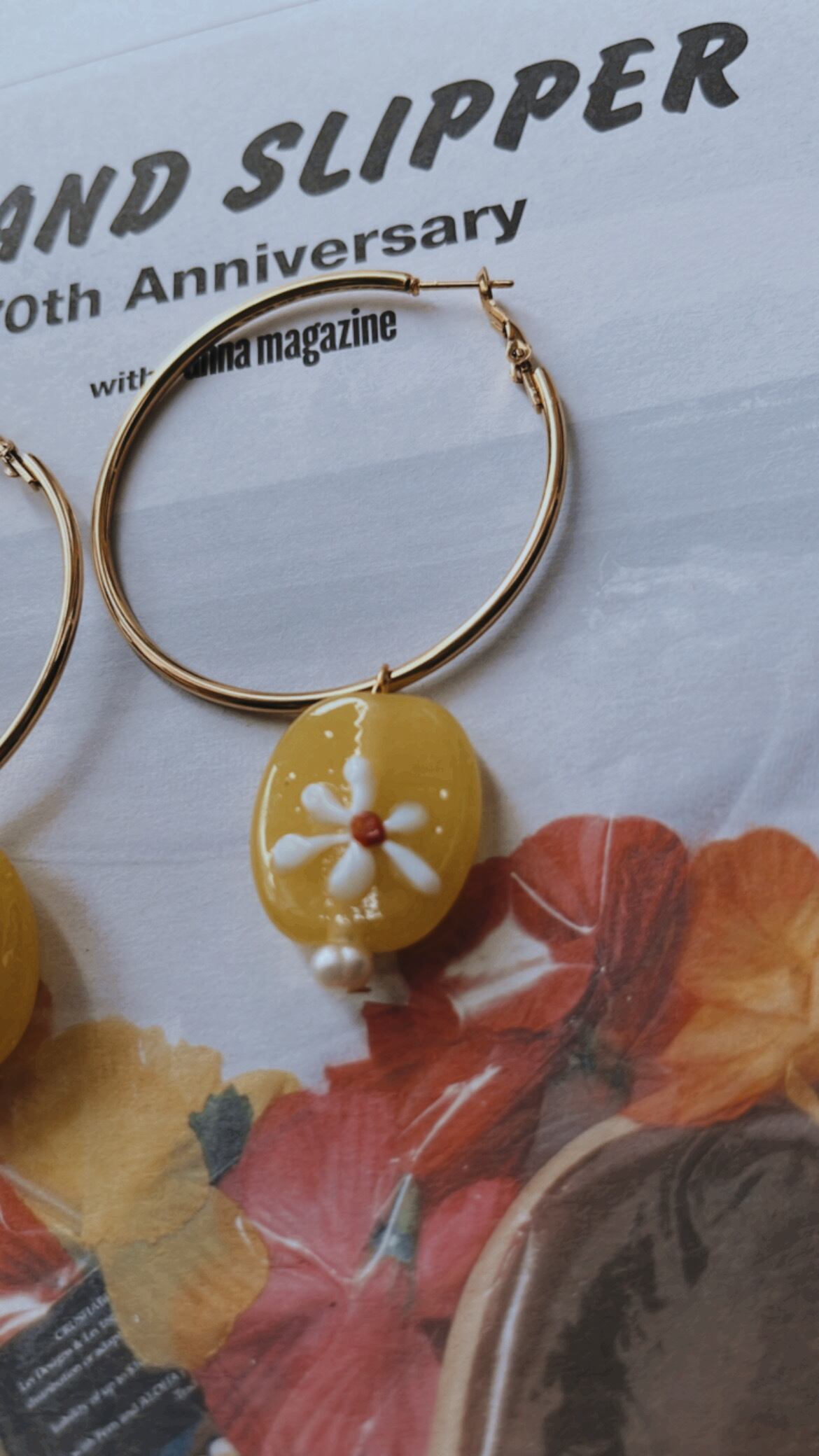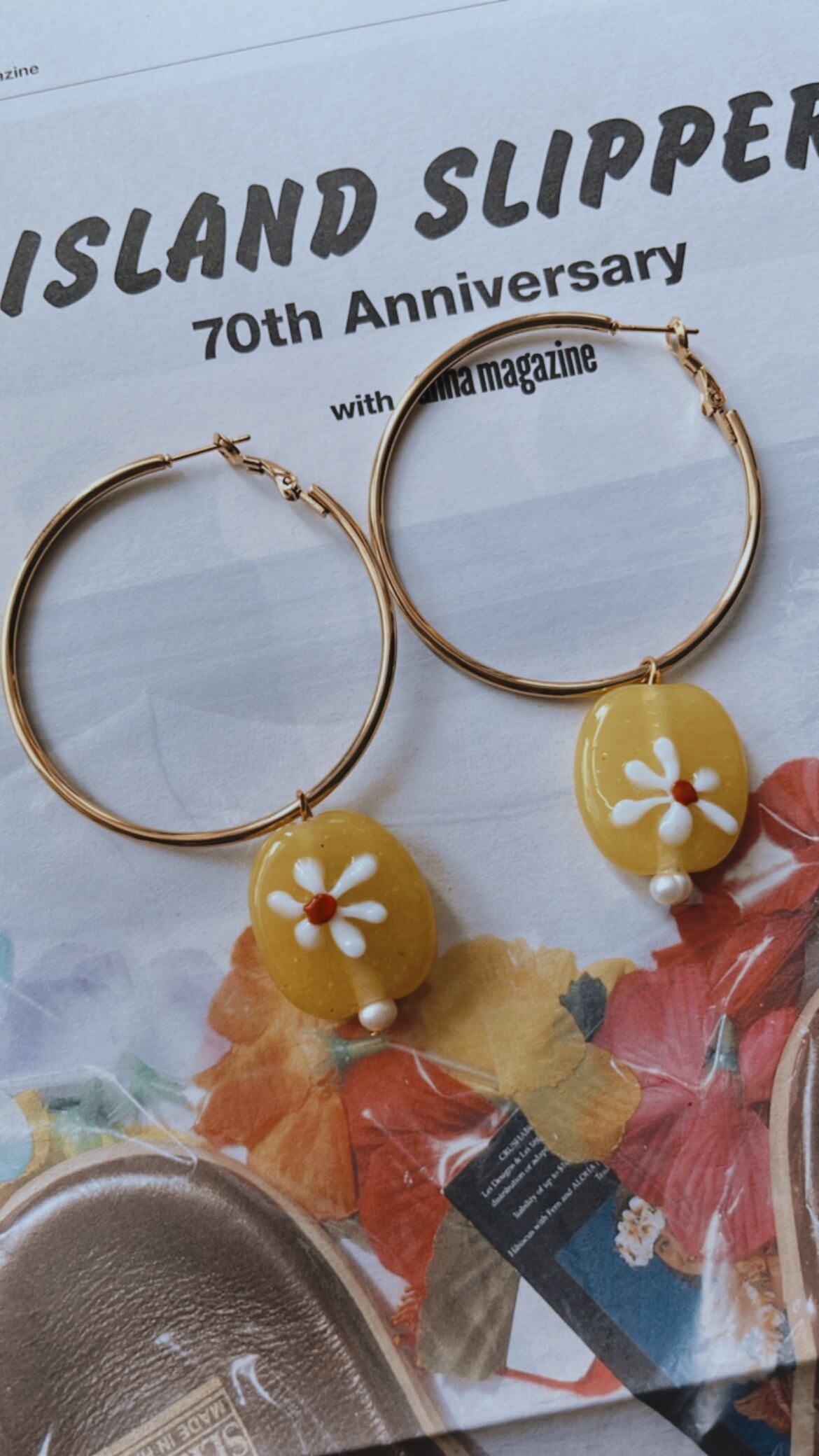 大きめなフープピアスにお花の手作りジャワビーズと淡水パールのピアスです。ピアスはステンレスを使用しているのでサビずにアレルギーにも安心な素材です。