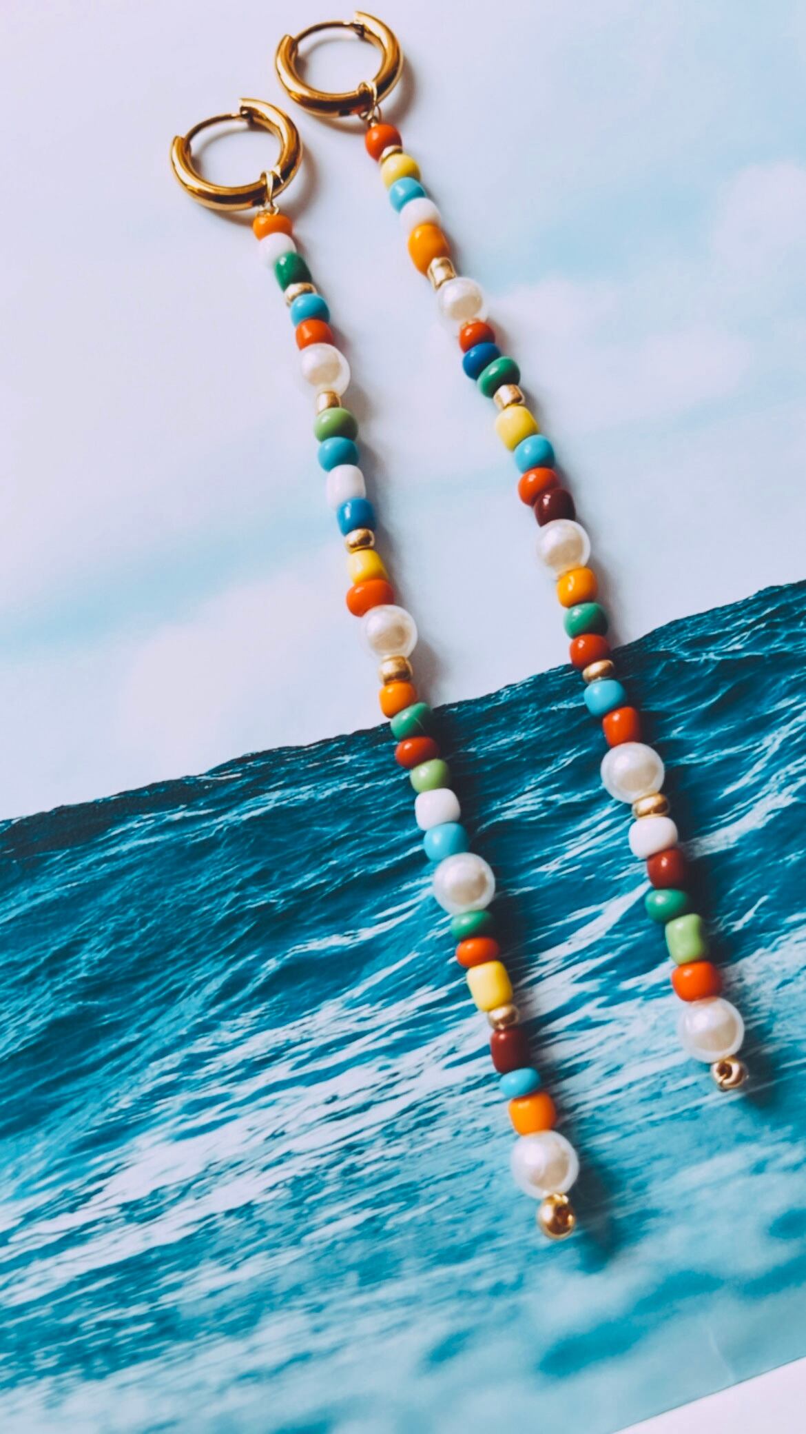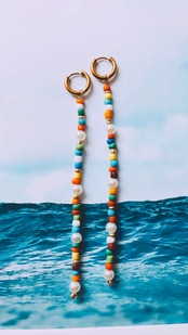 カラフルなビーズでできたロングピアスです。