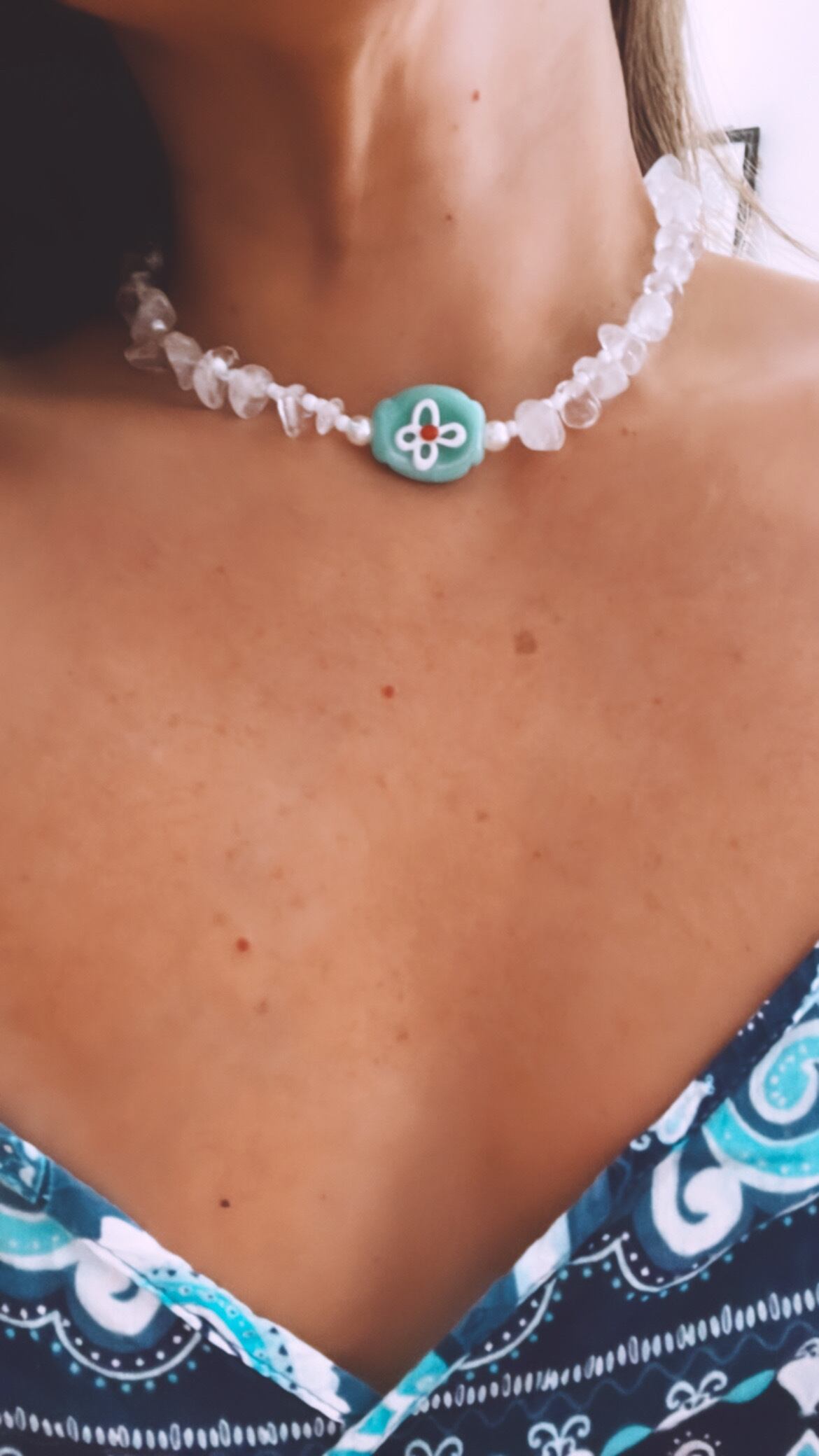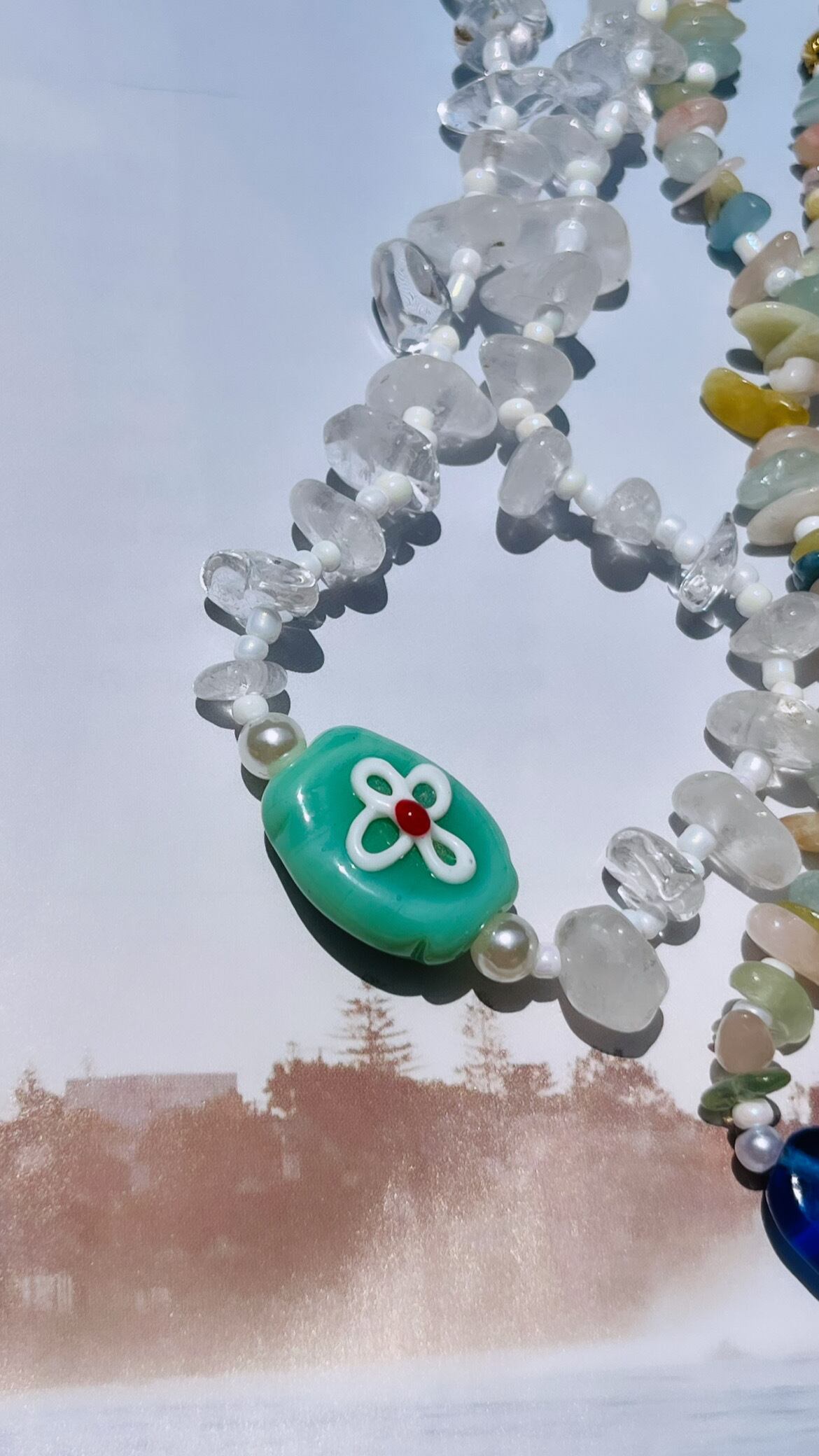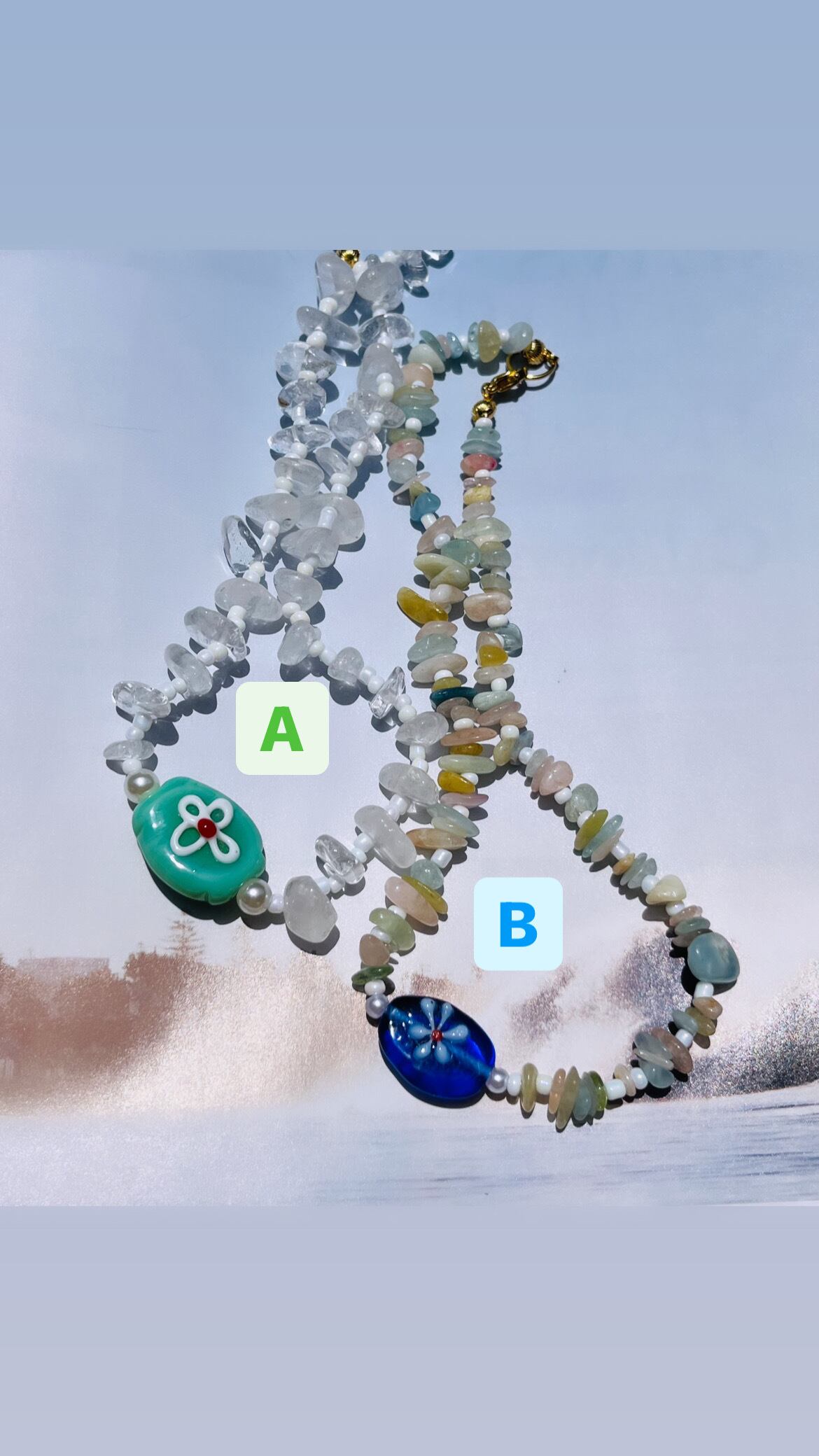 クリスタル、クォーツにお花のジャワビーズがついたネックレスです。A.Bからお選びください。