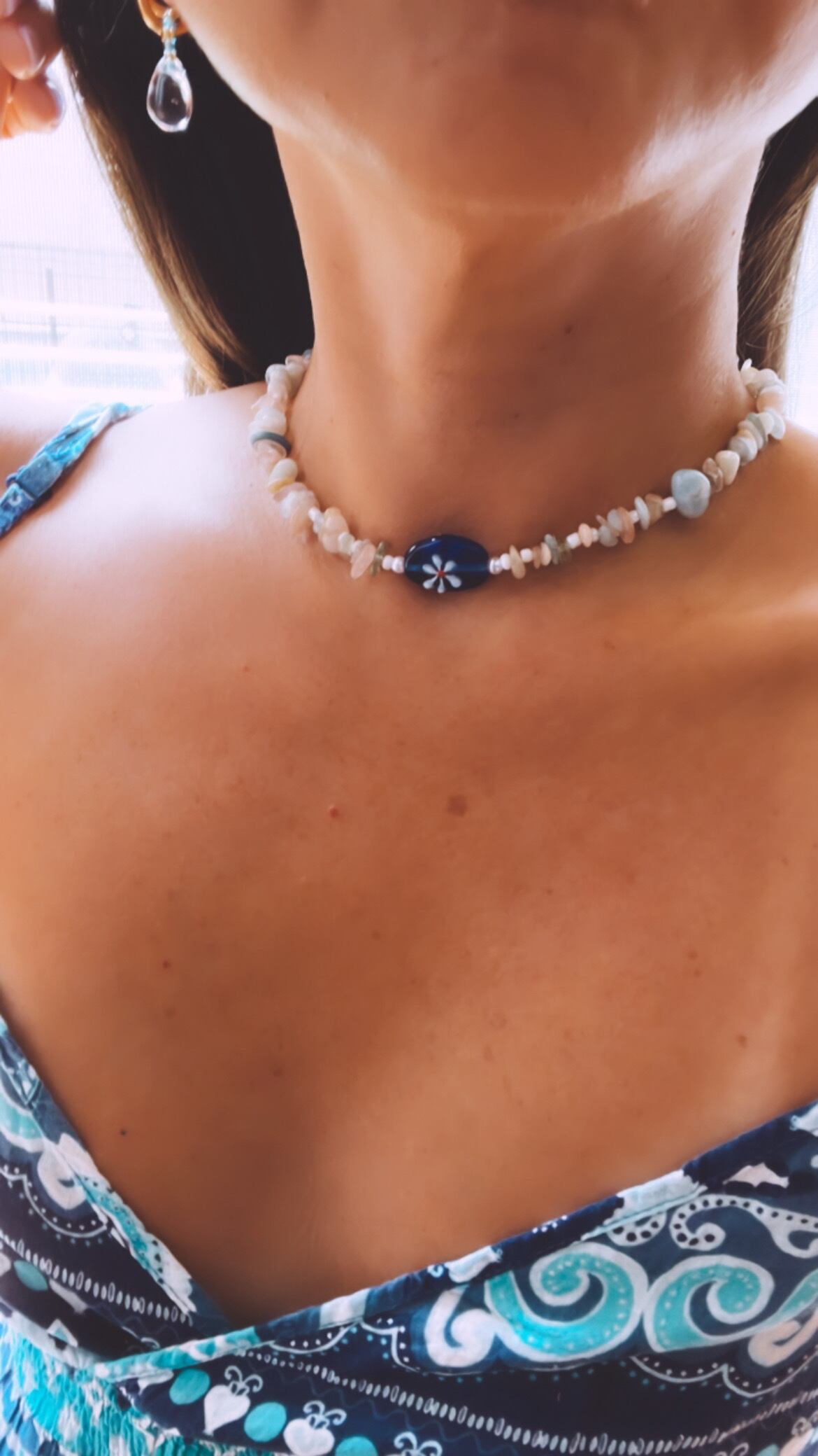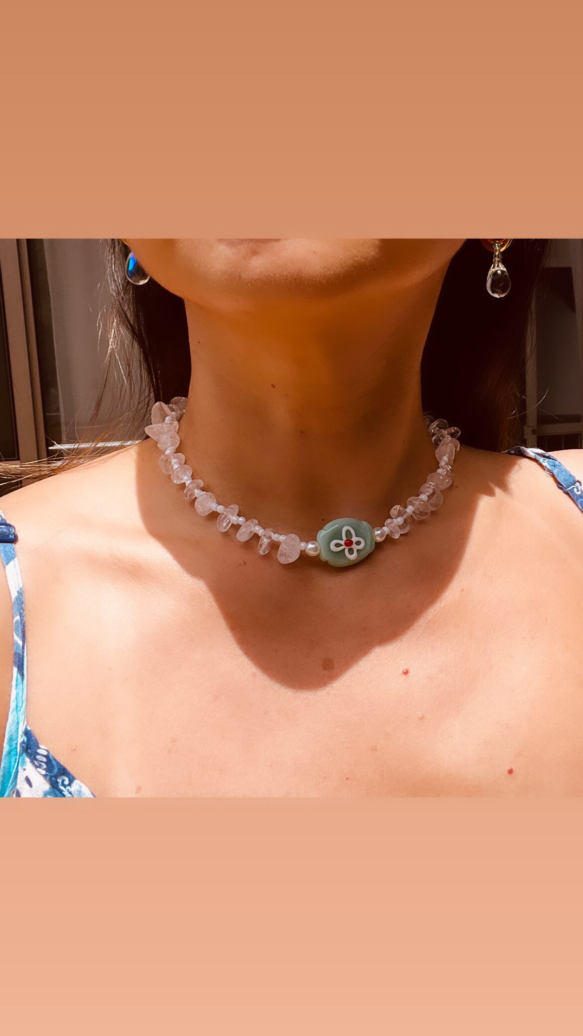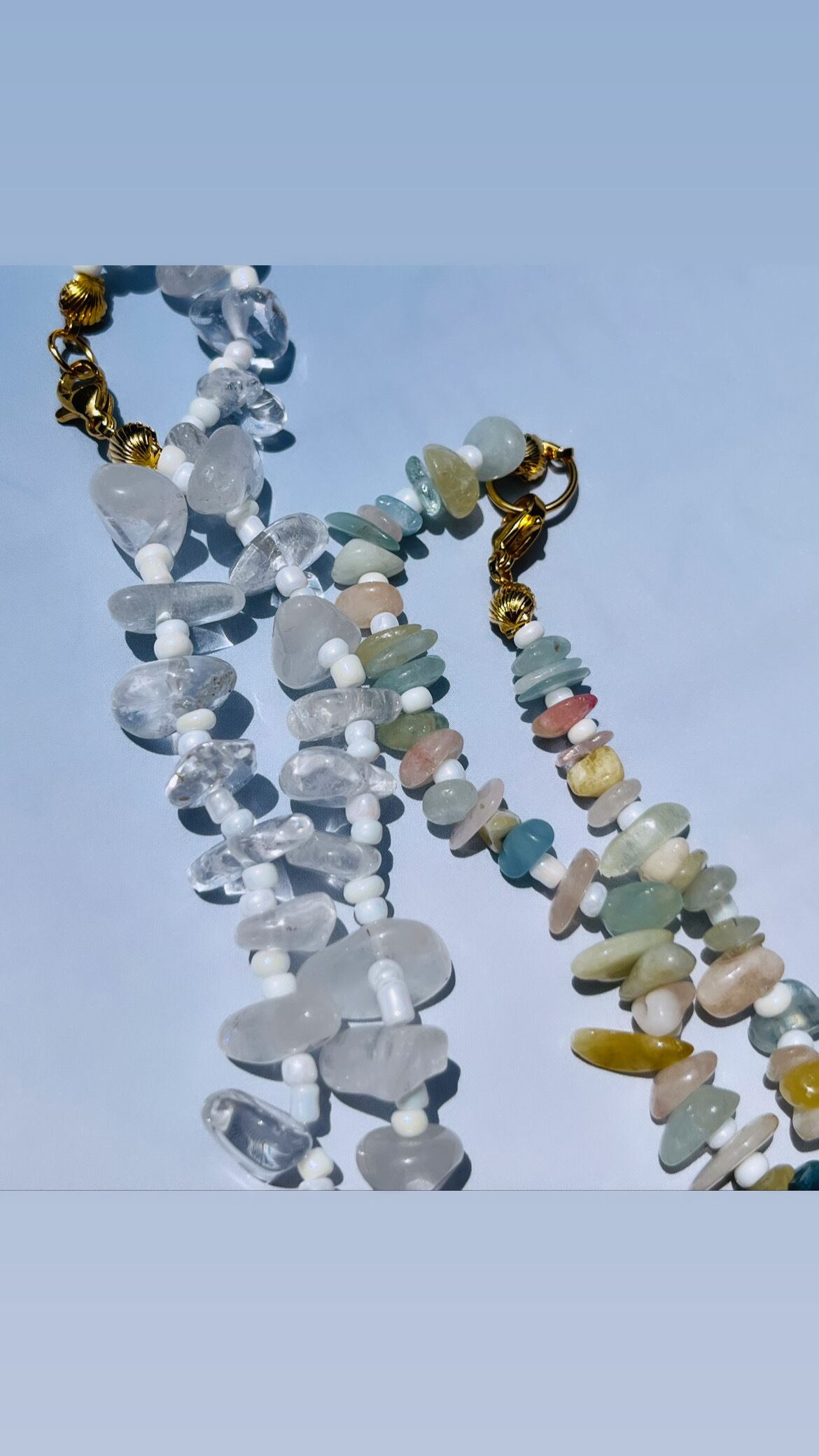 クリスタル、クォーツにお花のジャワビーズがついたネックレスです。A.Bからお選びください。