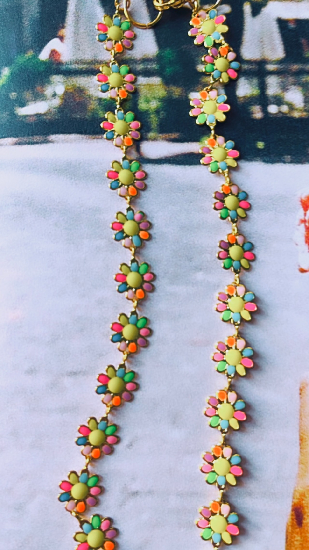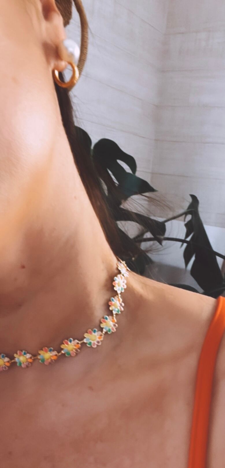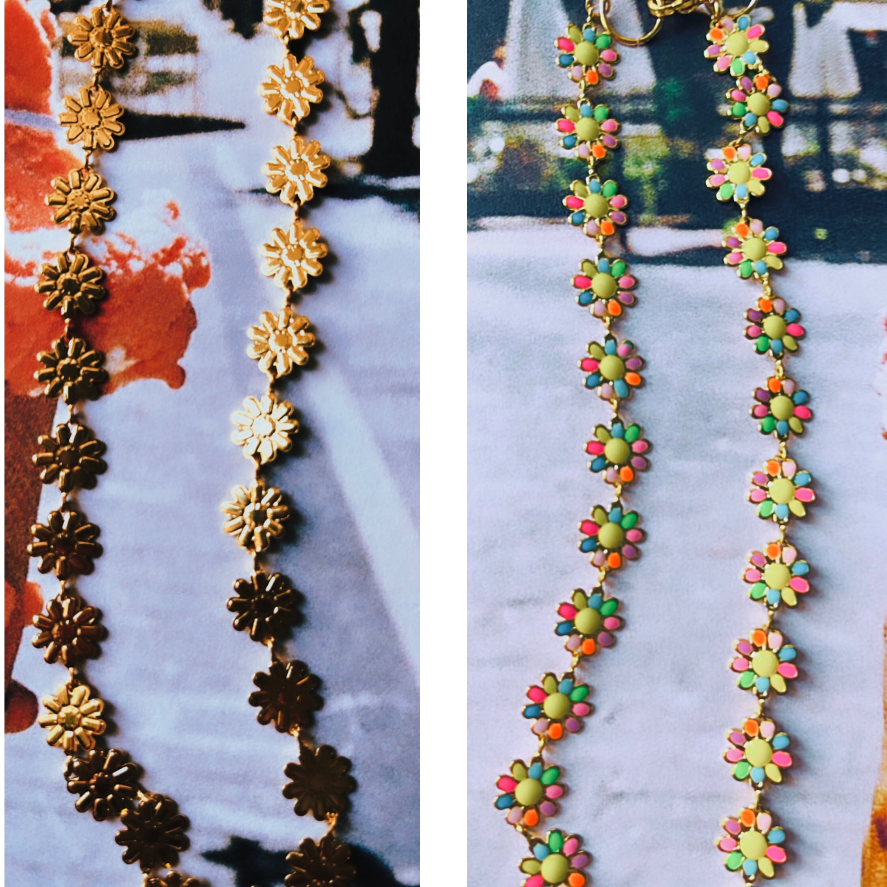 カラフルなお花、もう一面はゴールドのお花の2wayなネックレスです。ステンレスを使用しているのでサビずにアレルギーにも安心な素材です。